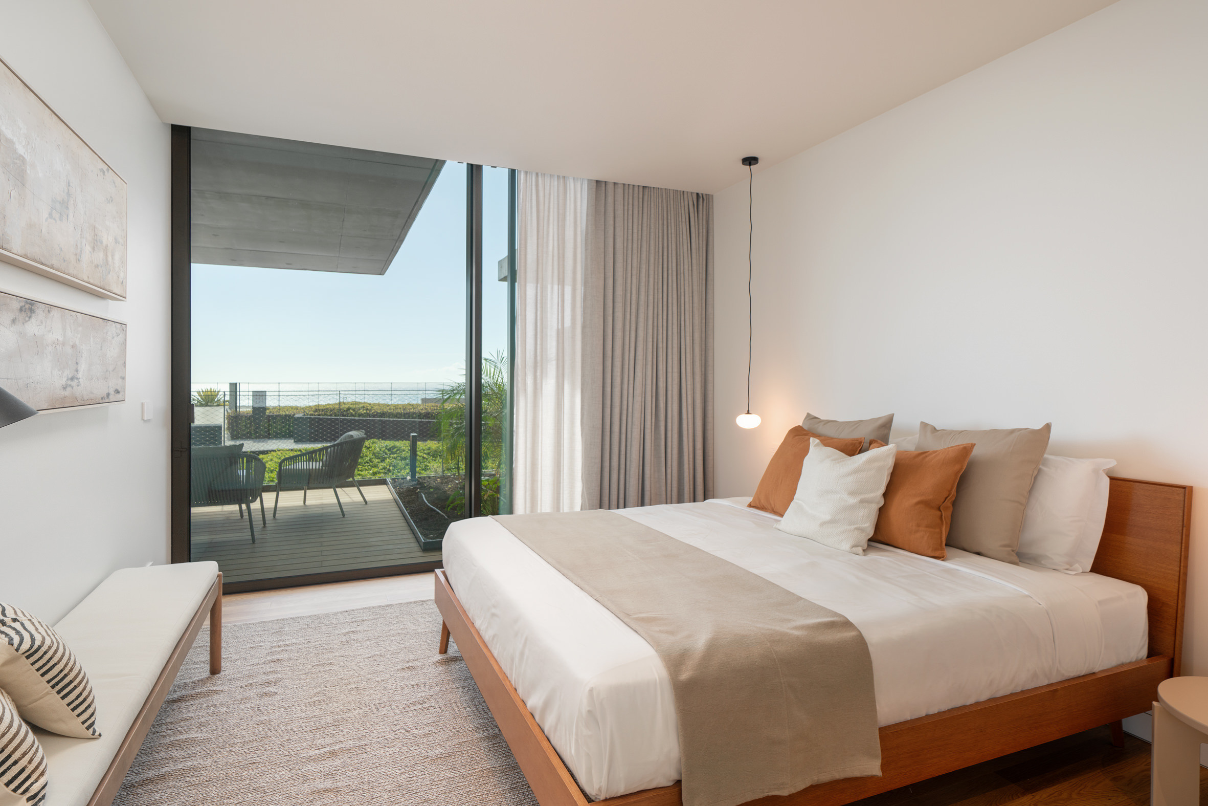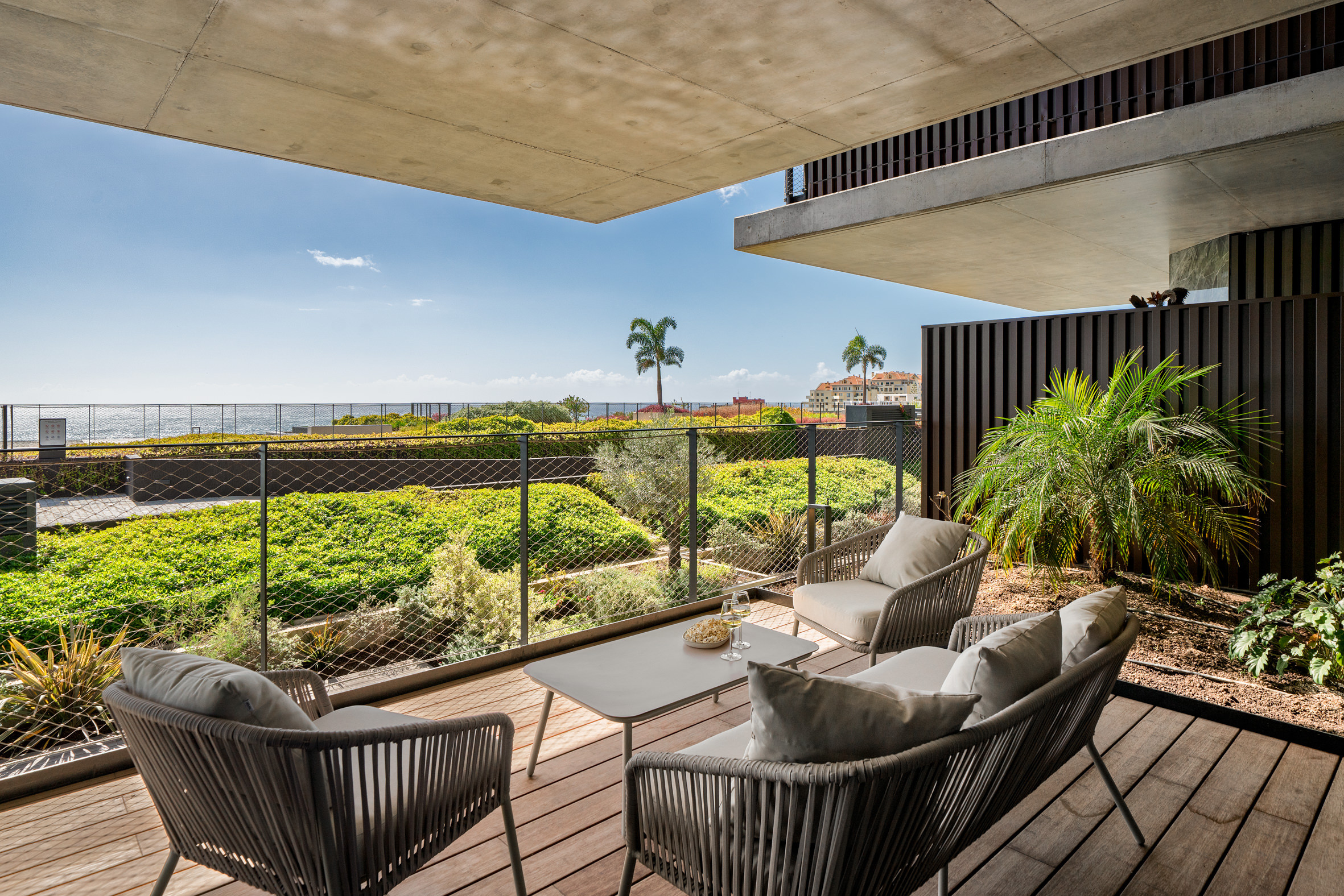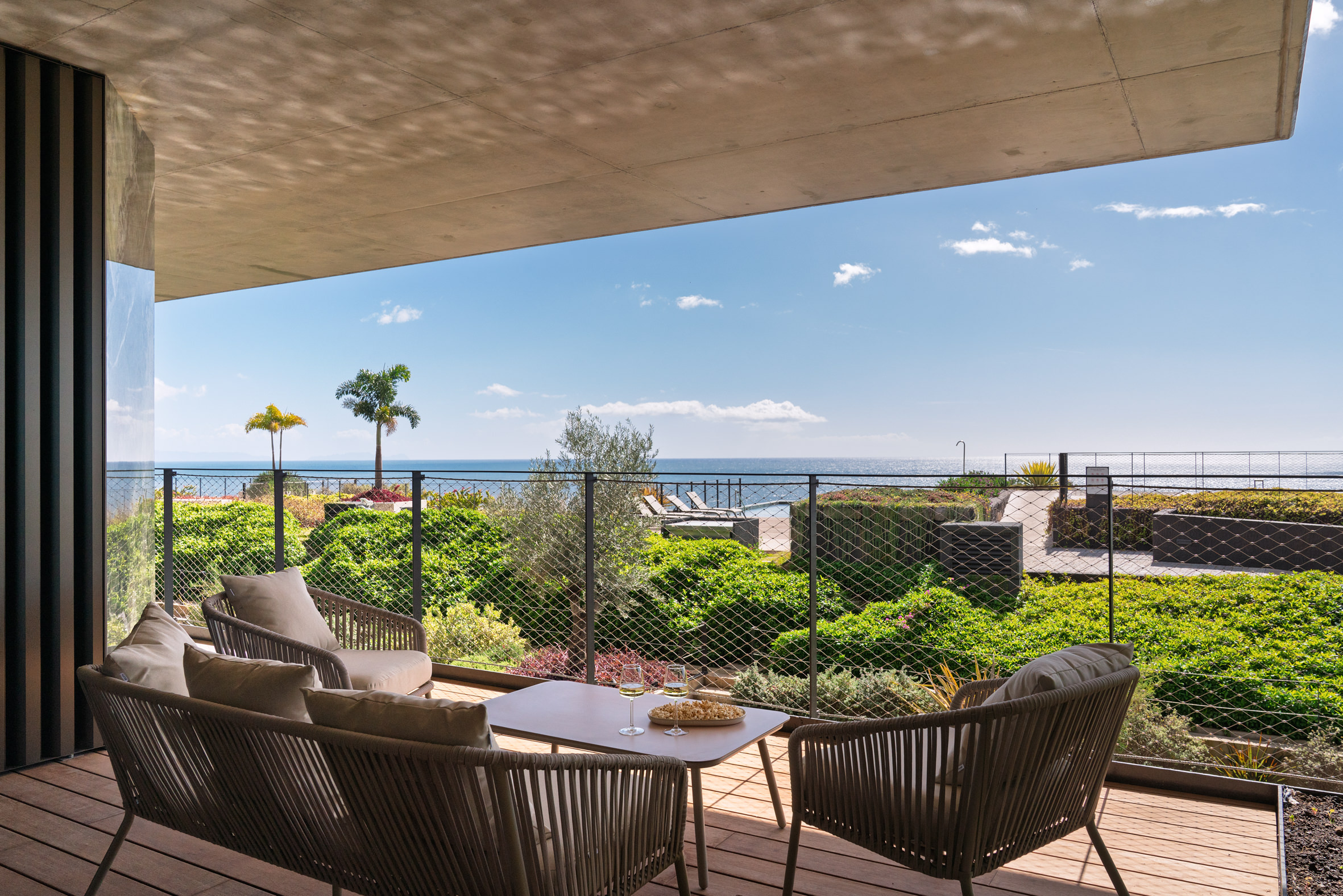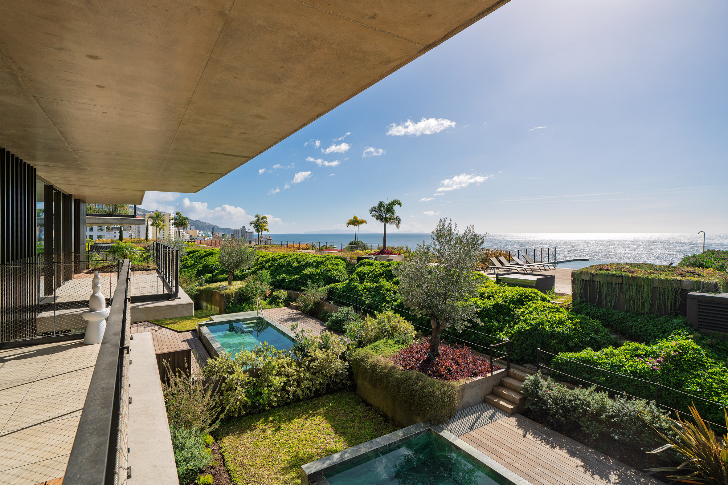 From the living room, sliding glass doors reveal a spacious balcony overlooking lush gardens, the shimmering pool, and the vast ocean horizon. This outdoor retreat becomes an extension of the living space, perfect for enjoying the island’s gentle climate or dining al fresco in the golden light of Madeira. The building’s modern façade, framed by greenery and stone, reflects the same harmony found inside, blending privacy with openness.