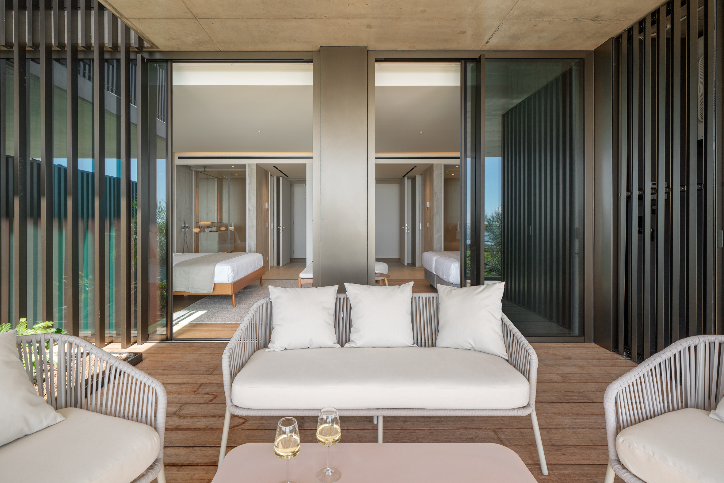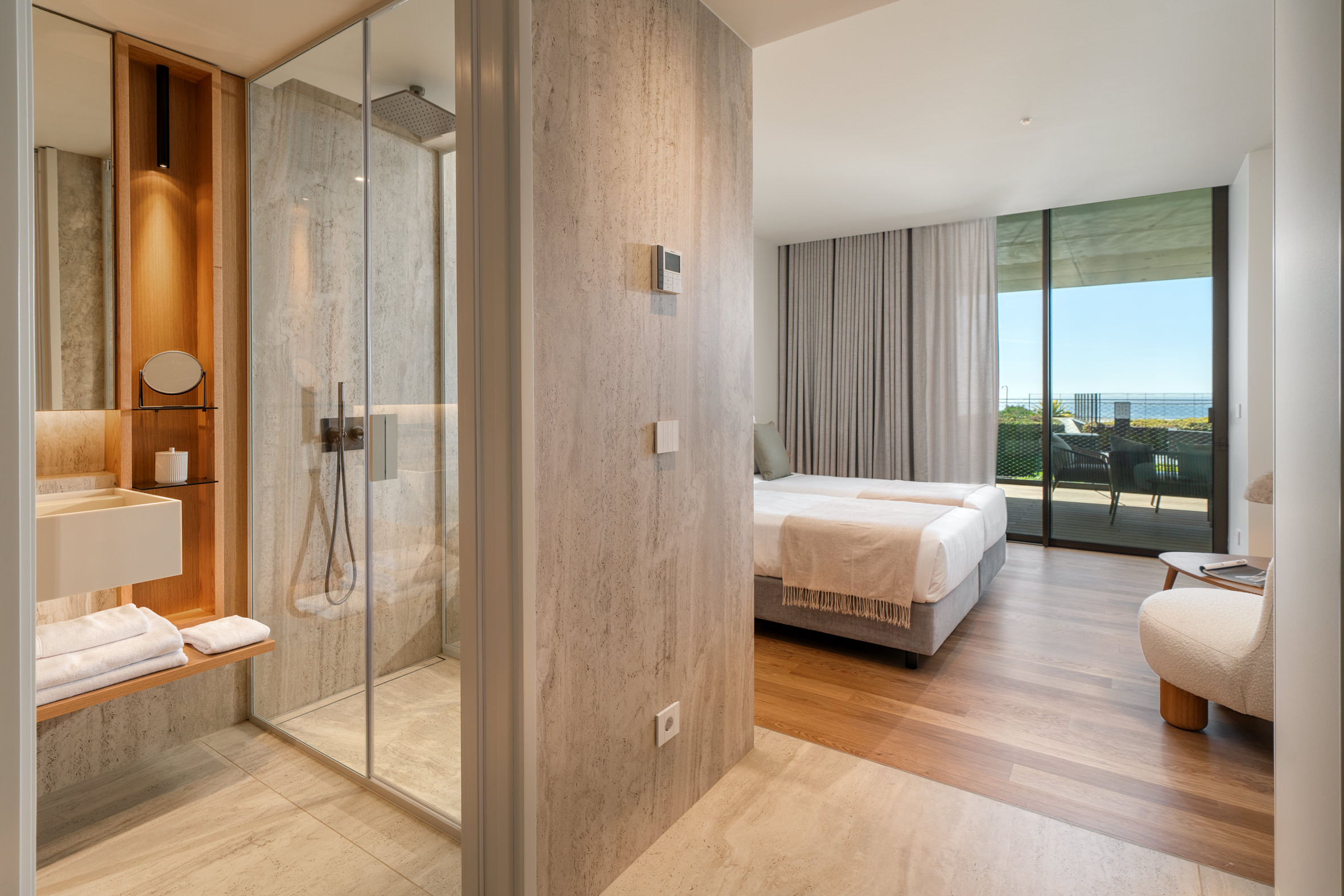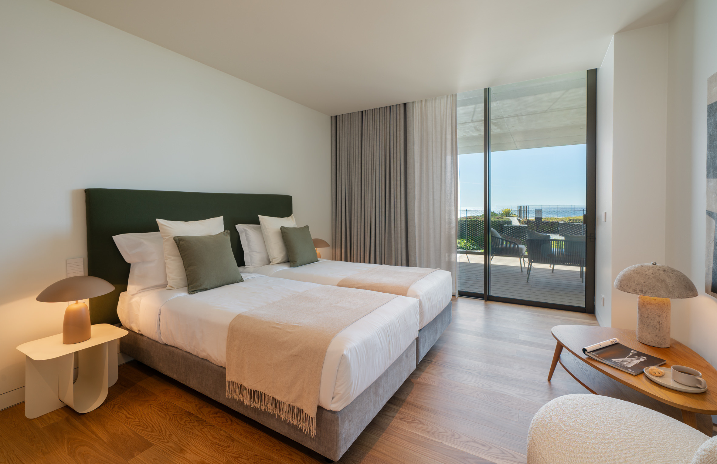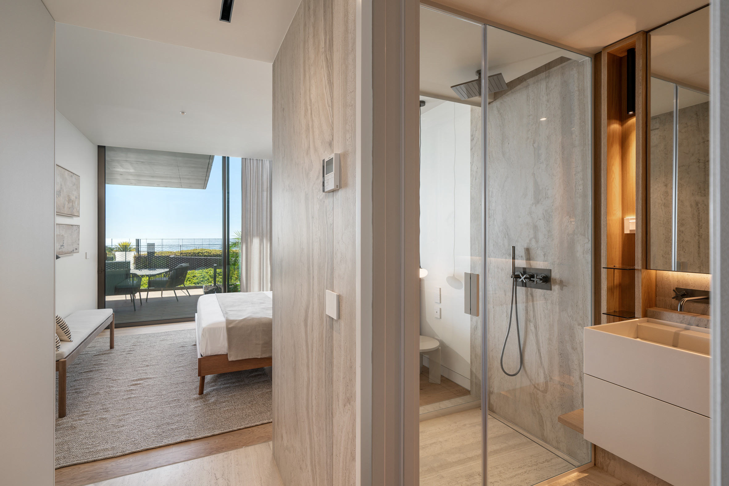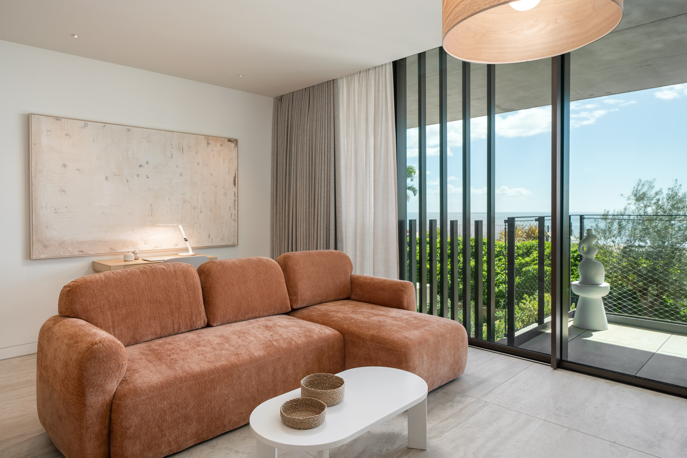From the living room, sliding glass doors reveal a spacious balcony overlooking lush gardens, the shimmering pool, and the vast ocean horizon. This outdoor retreat becomes an extension of the living space, perfect for enjoying the island’s gentle climate or dining al fresco in the golden light of Madeira. The building’s modern façade, framed by greenery and stone, reflects the same harmony found inside, blending privacy with openness.