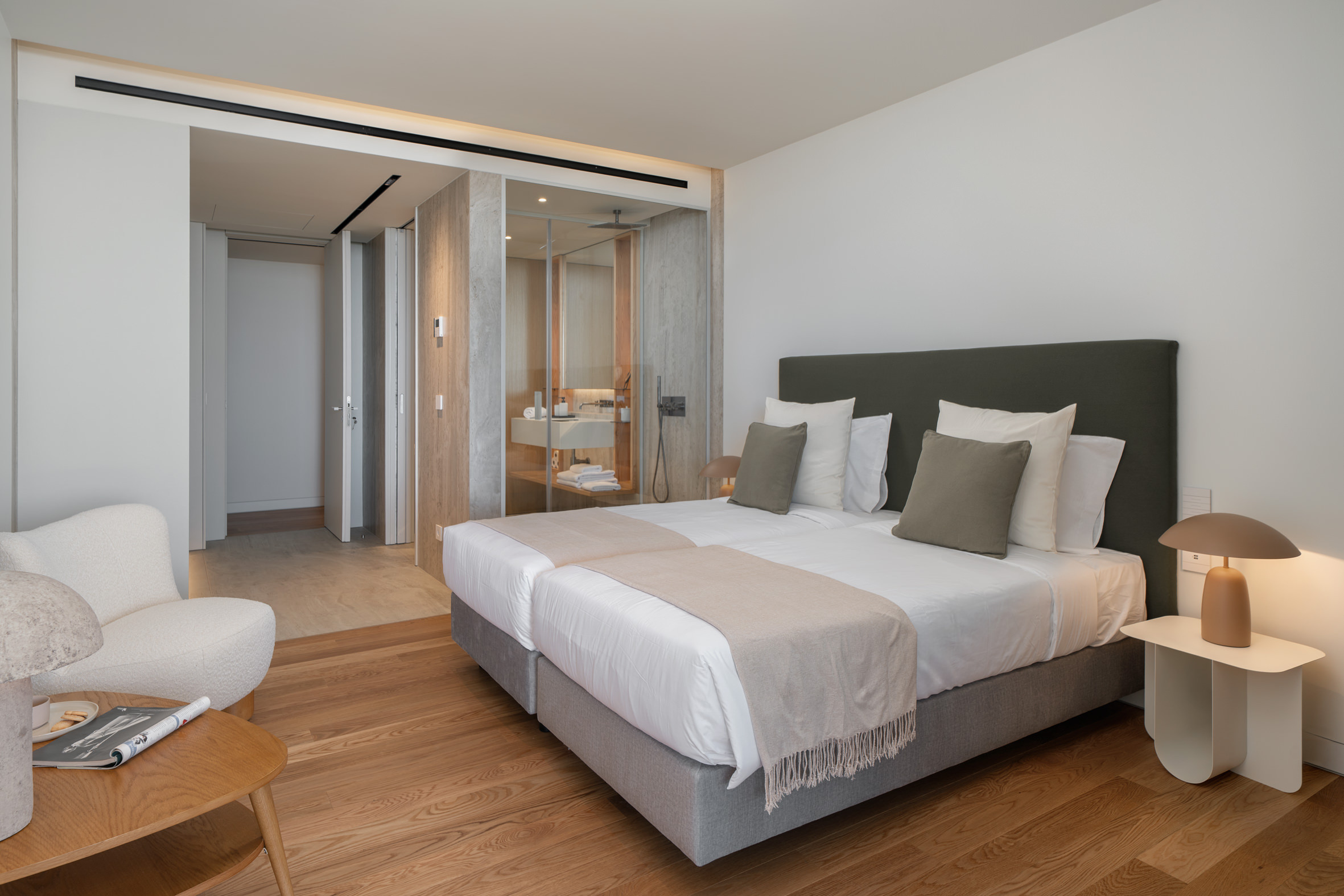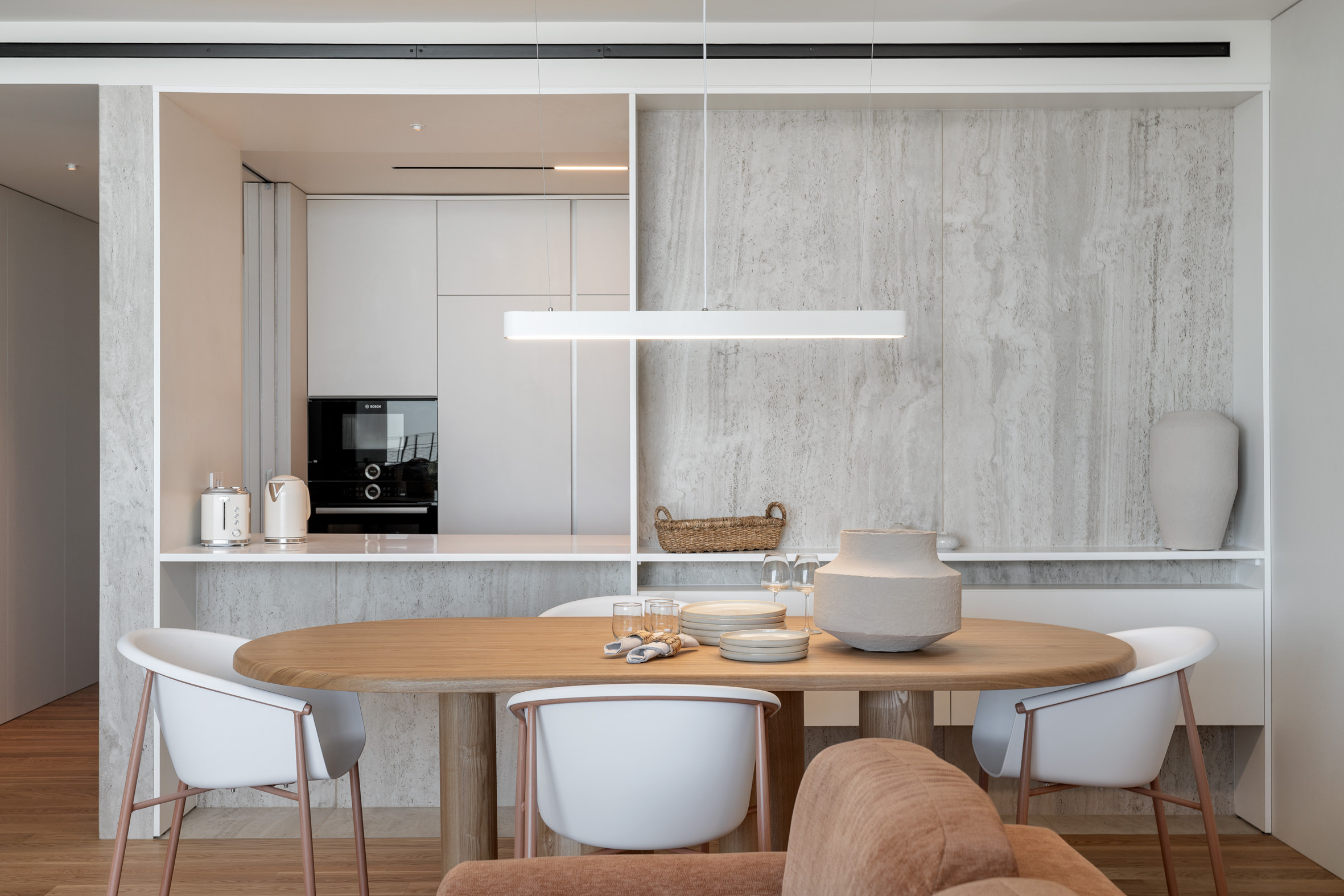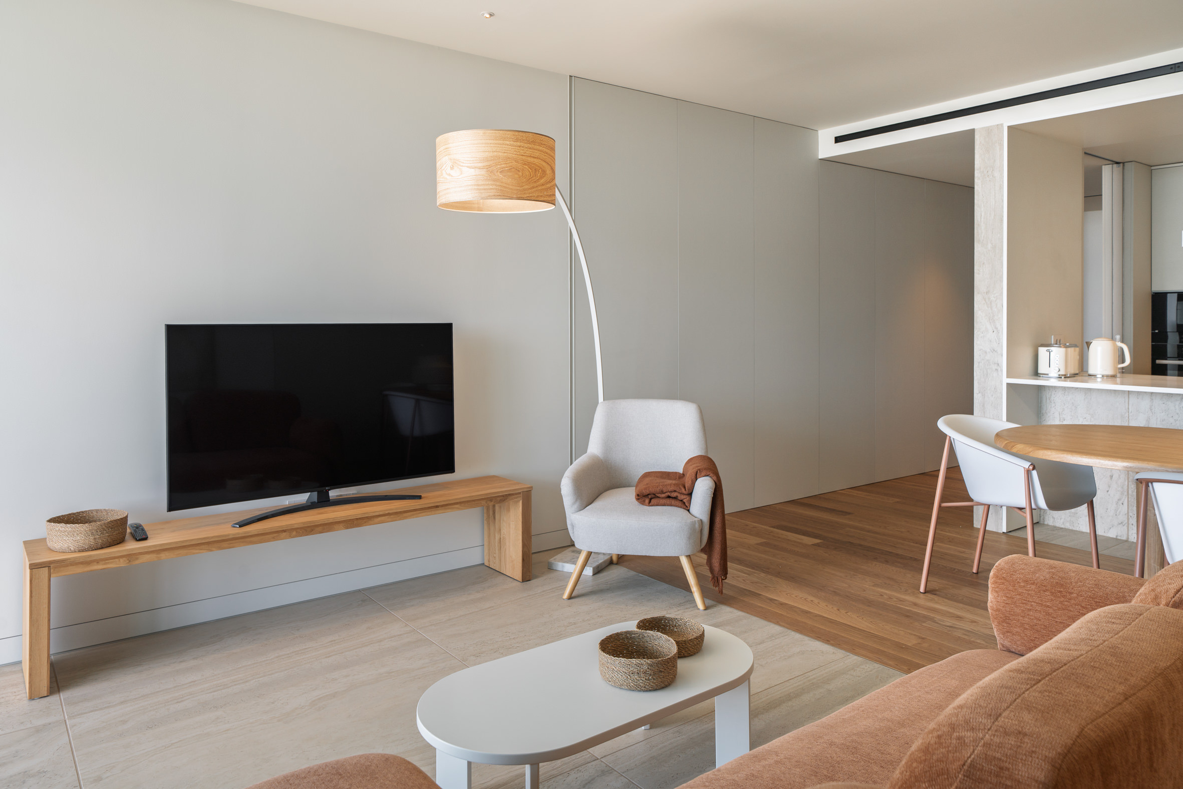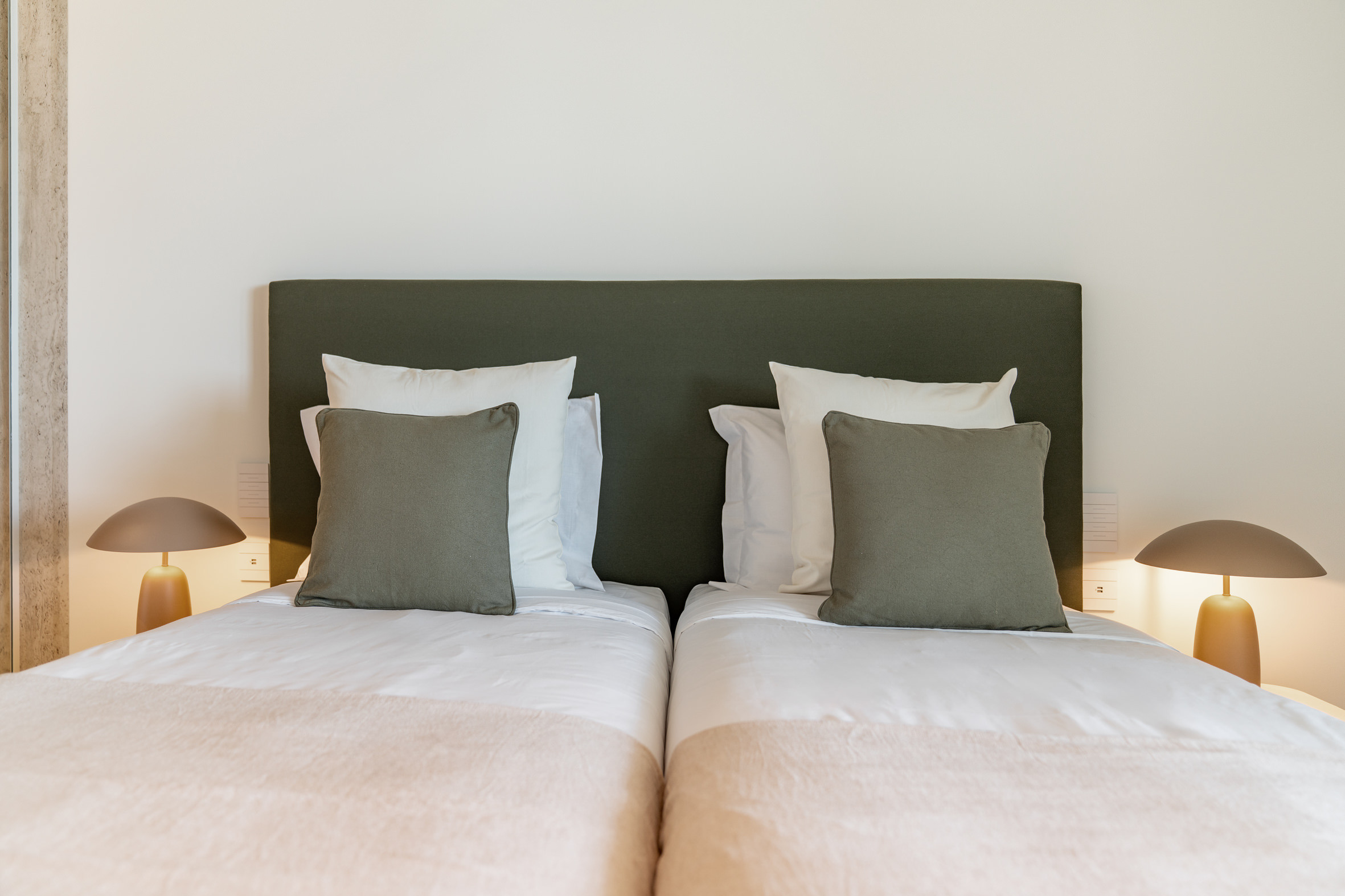 The apartment reveals an atmosphere of refined simplicity, where natural materials and elegant proportions shape each room. It features two beautifully appointed suites: one with a double bed and another with two single beds, both offering private bathrooms with walk-in showers lined in fine stone. The open-plan living and dining area seamlessly connects to the kitchen, creating an airy space for both comfort and connection. The fully equipped kitchen, with its modern appliances and minimalist detailing, embodies functionality and elegance. A discreet laundry room and a guest bathroom add convenience, while the soft palette and thoughtful lighting create a sense of calm and timeless charm.