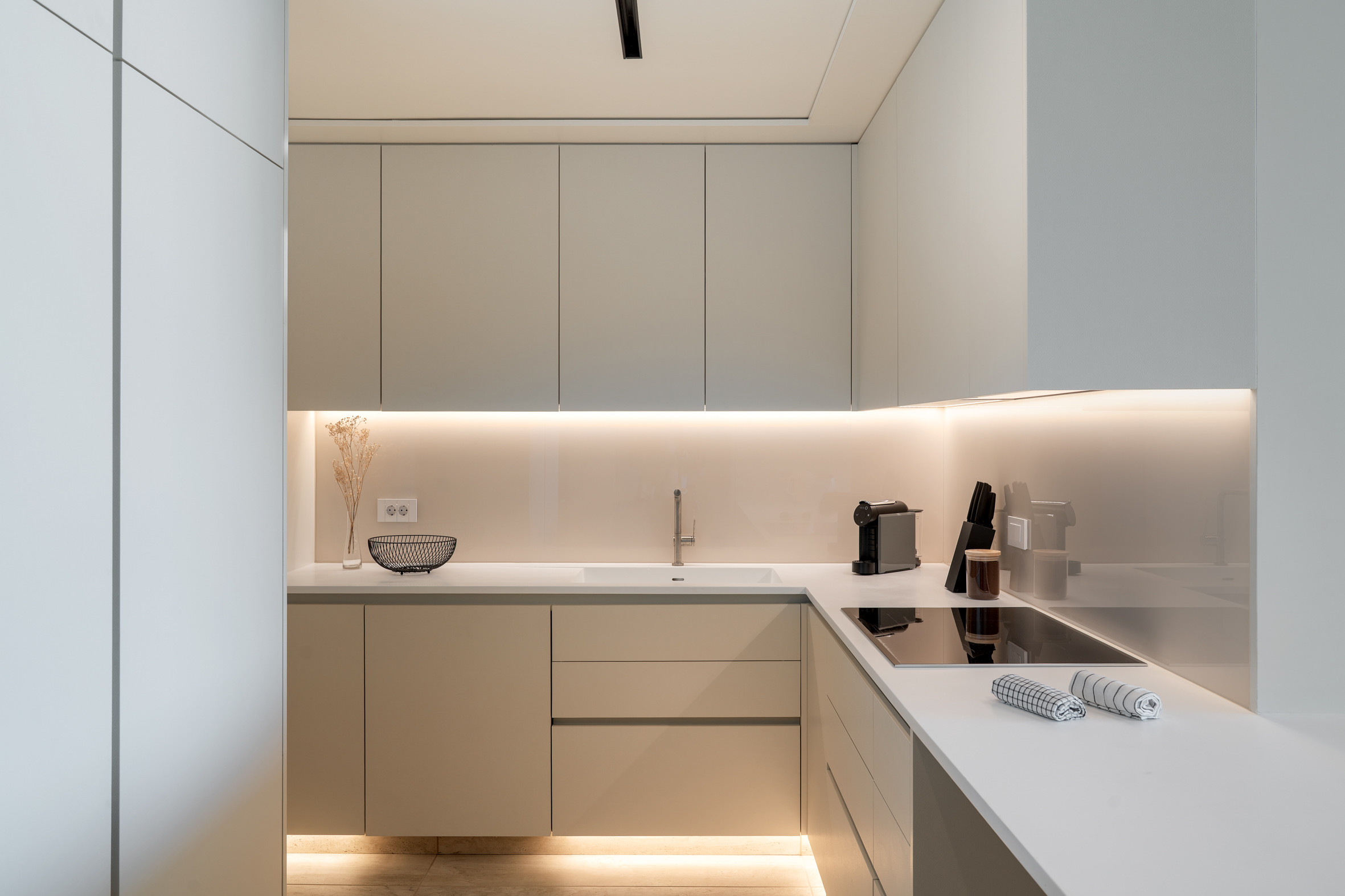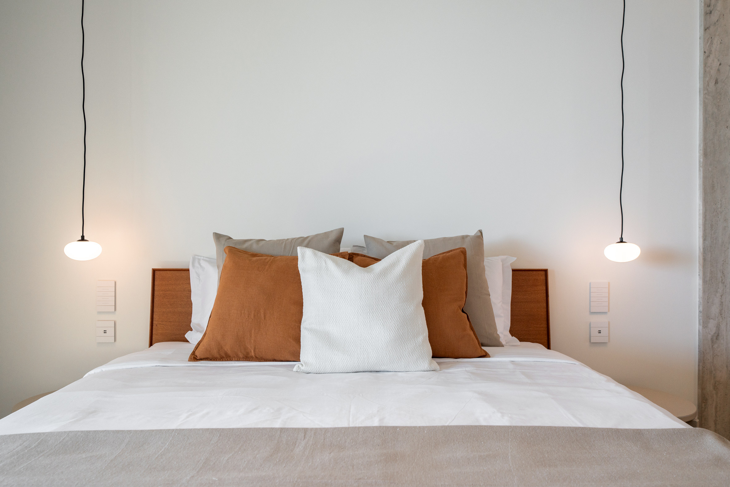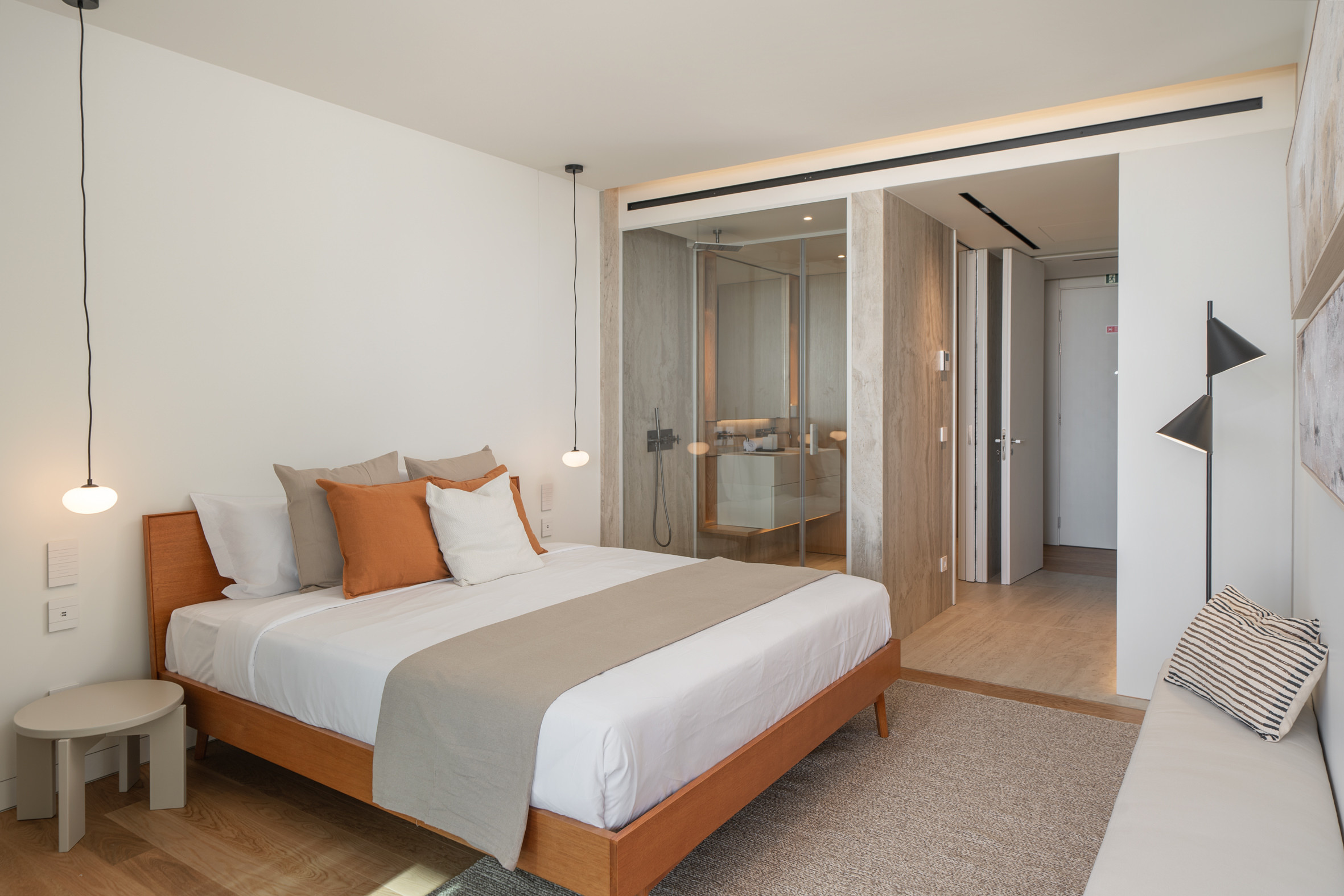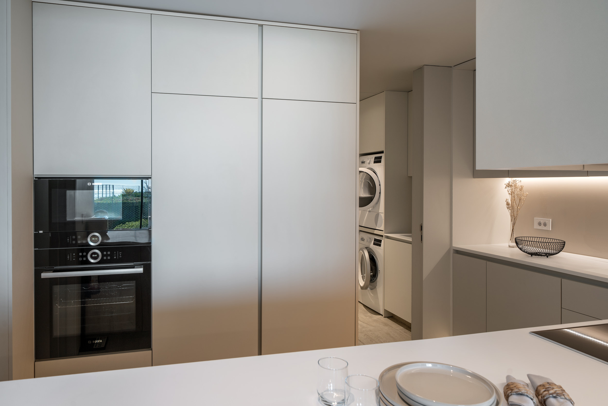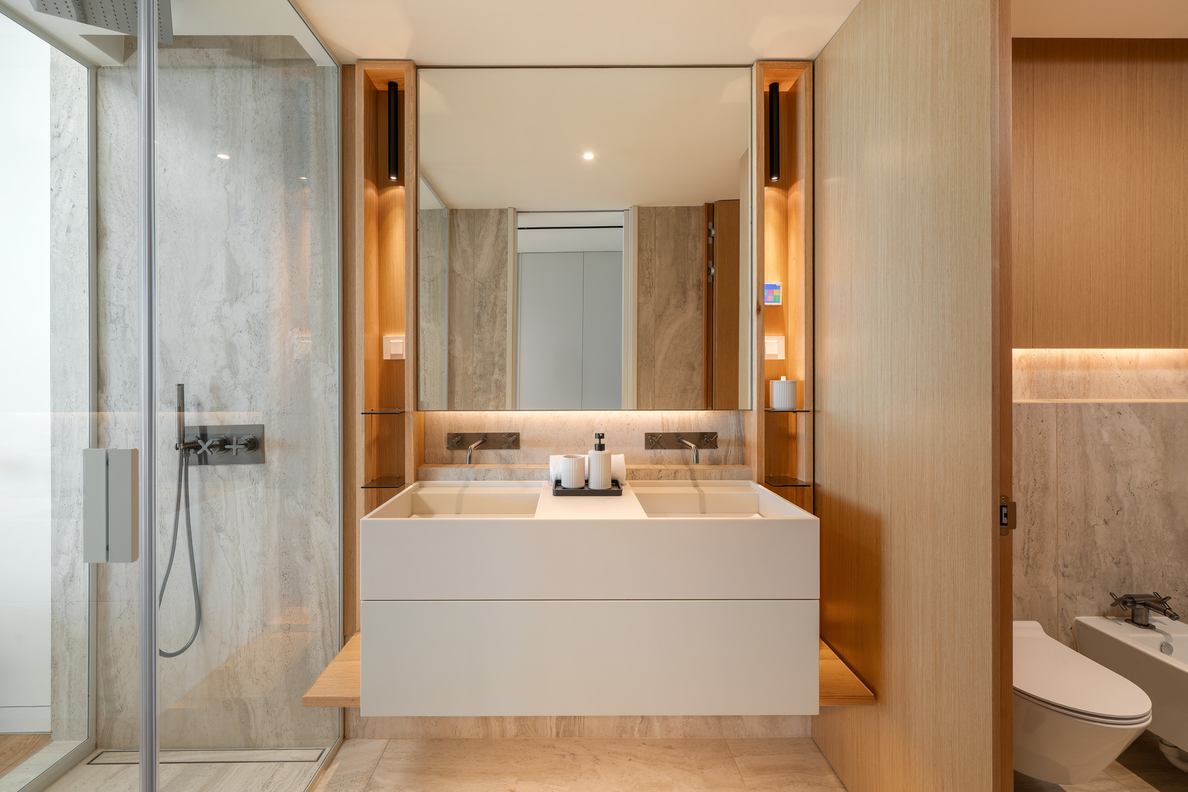 The apartment reveals an atmosphere of refined simplicity, where natural materials and elegant proportions shape each room. It features two beautifully appointed suites: one with a double bed and another with two single beds, both offering private bathrooms with walk-in showers lined in fine stone. The open-plan living and dining area seamlessly connects to the kitchen, creating an airy space for both comfort and connection. The fully equipped kitchen, with its modern appliances and minimalist detailing, embodies functionality and elegance. A discreet laundry room and a guest bathroom add convenience, while the soft palette and thoughtful lighting create a sense of calm and timeless charm.