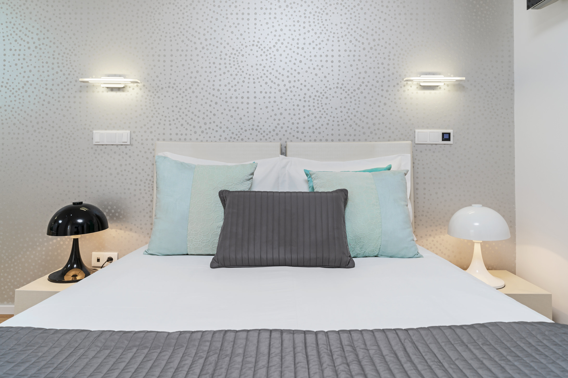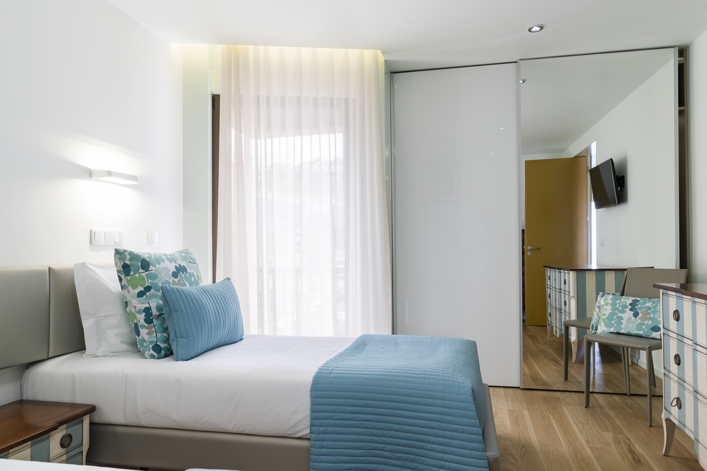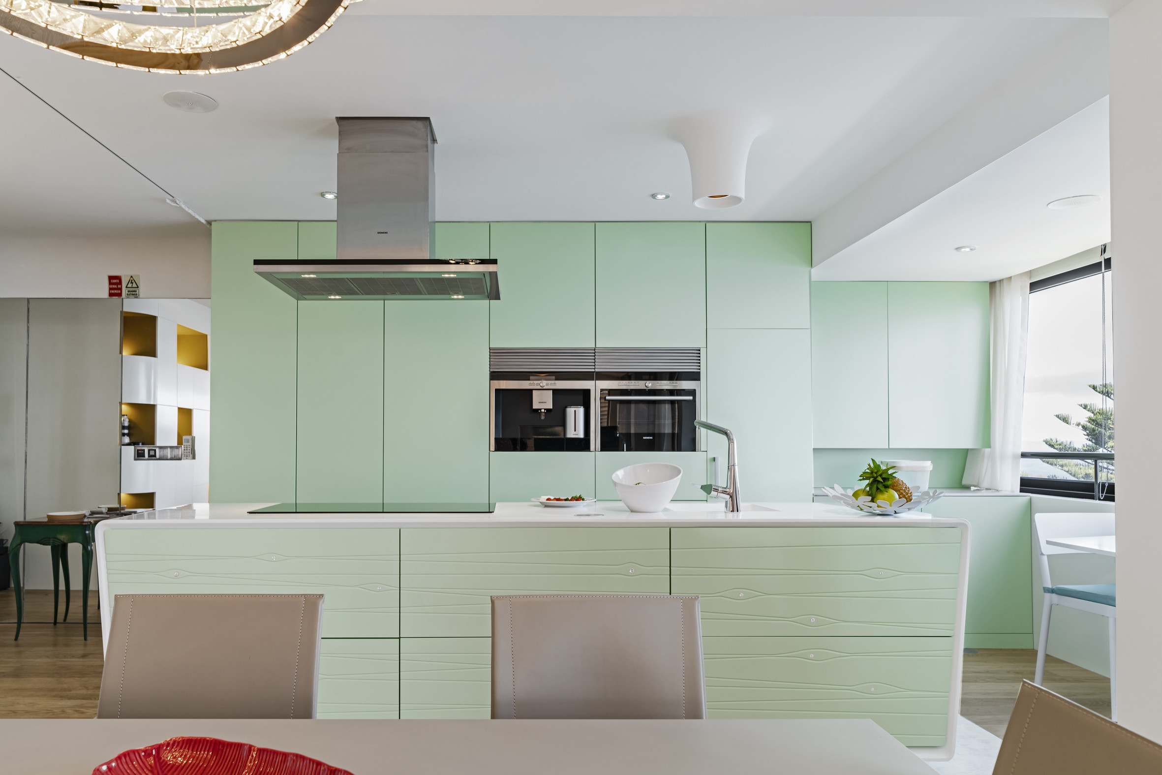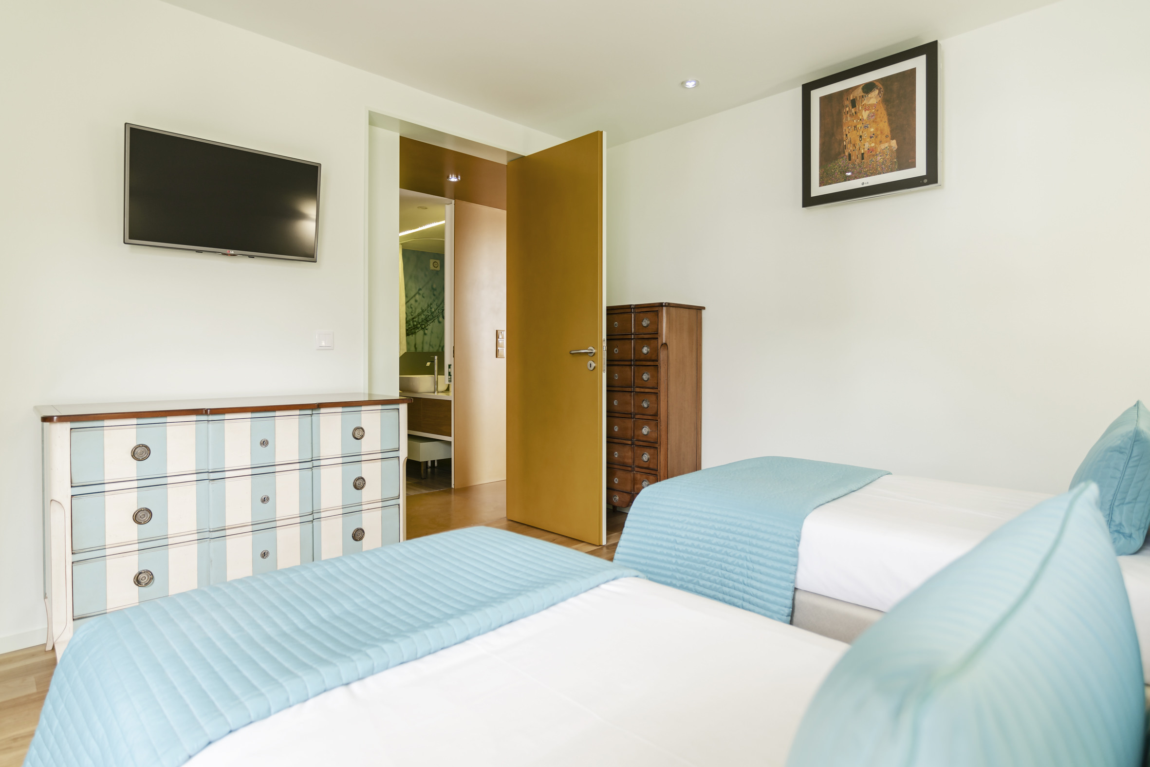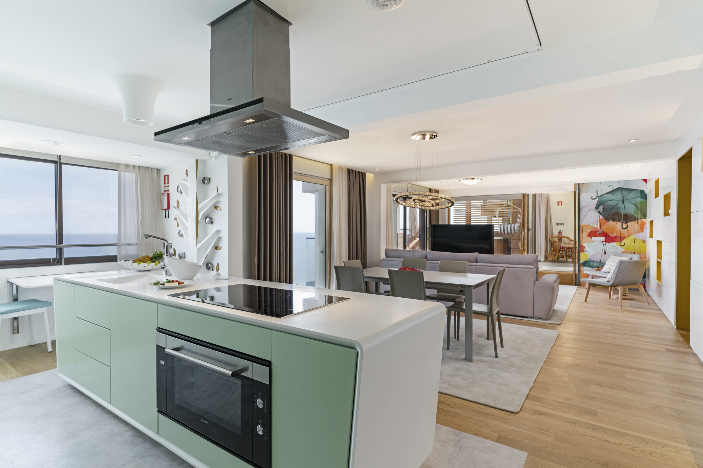 The open-plan living area connects the kitchen, dining room, and lounge through wide glass doors that overlook the Atlantic. The kitchen, with its subtle mint cabinetry and high-end appliances, is a place to gather and share meals while admiring the ocean view. The living space, dressed in neutral shades and warm textures, is complemented by curated lighting and contemporary furnishings, offering both refinement and ease. Three bedrooms complete the interior, each with its own personality. Two feature double beds in soothing palettes, while the third presents twin beds with playful details. Every room is filled with light and designed for absolute comfort.