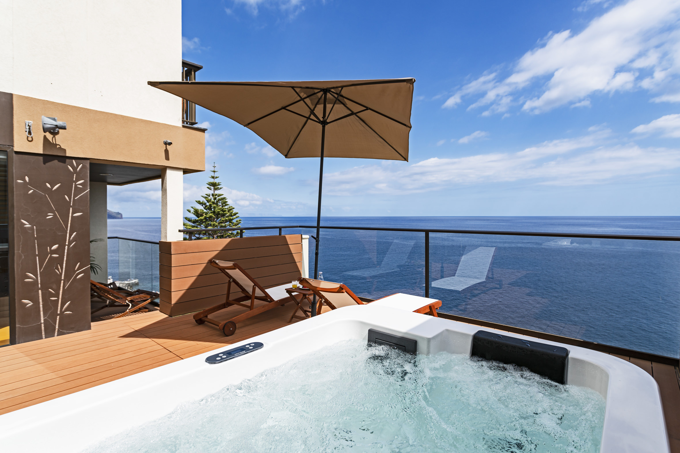 The outdoor area is an inviting sanctuary where design meets tranquillity. A jacuzzi takes centre stage, offering uninterrupted views of the Atlantic, while a sculptural wicker daybed and sun loungers invite pure relaxation. A built-in barbecue and dining area make this the perfect space to enjoy meals al fresco or to simply unwind as the sun dips below the horizon.
