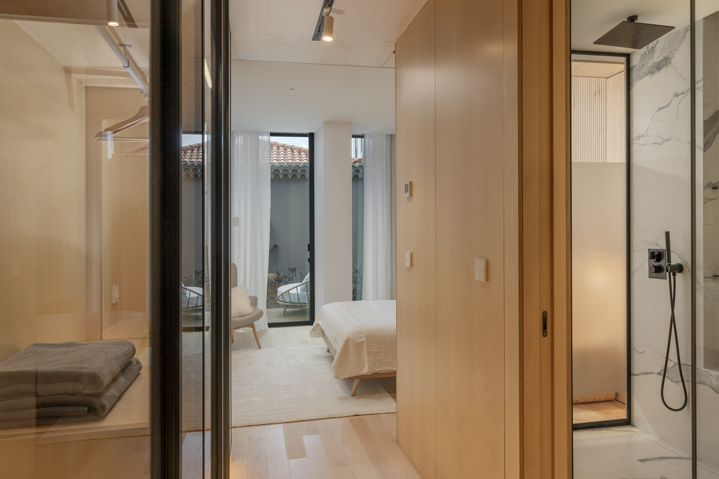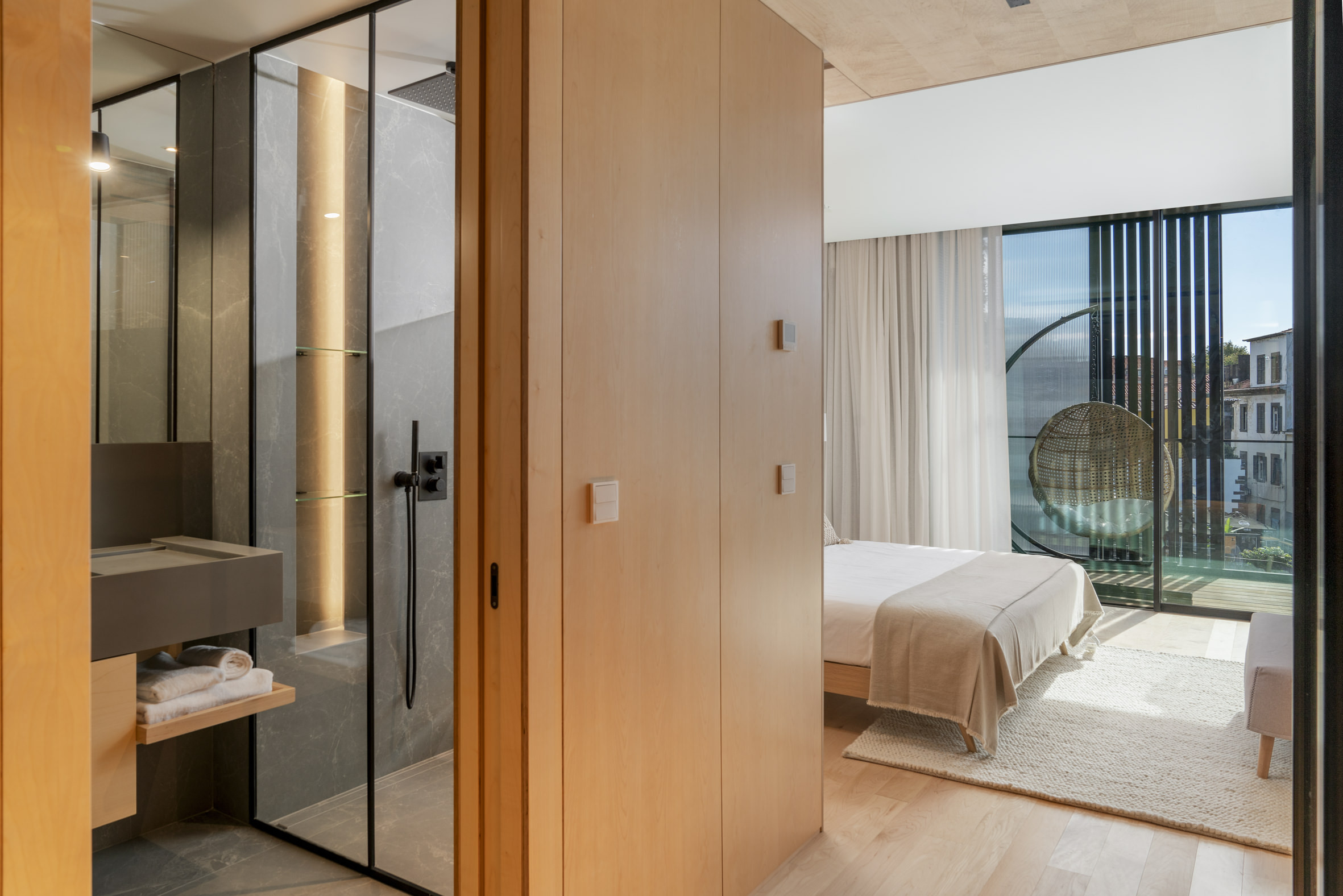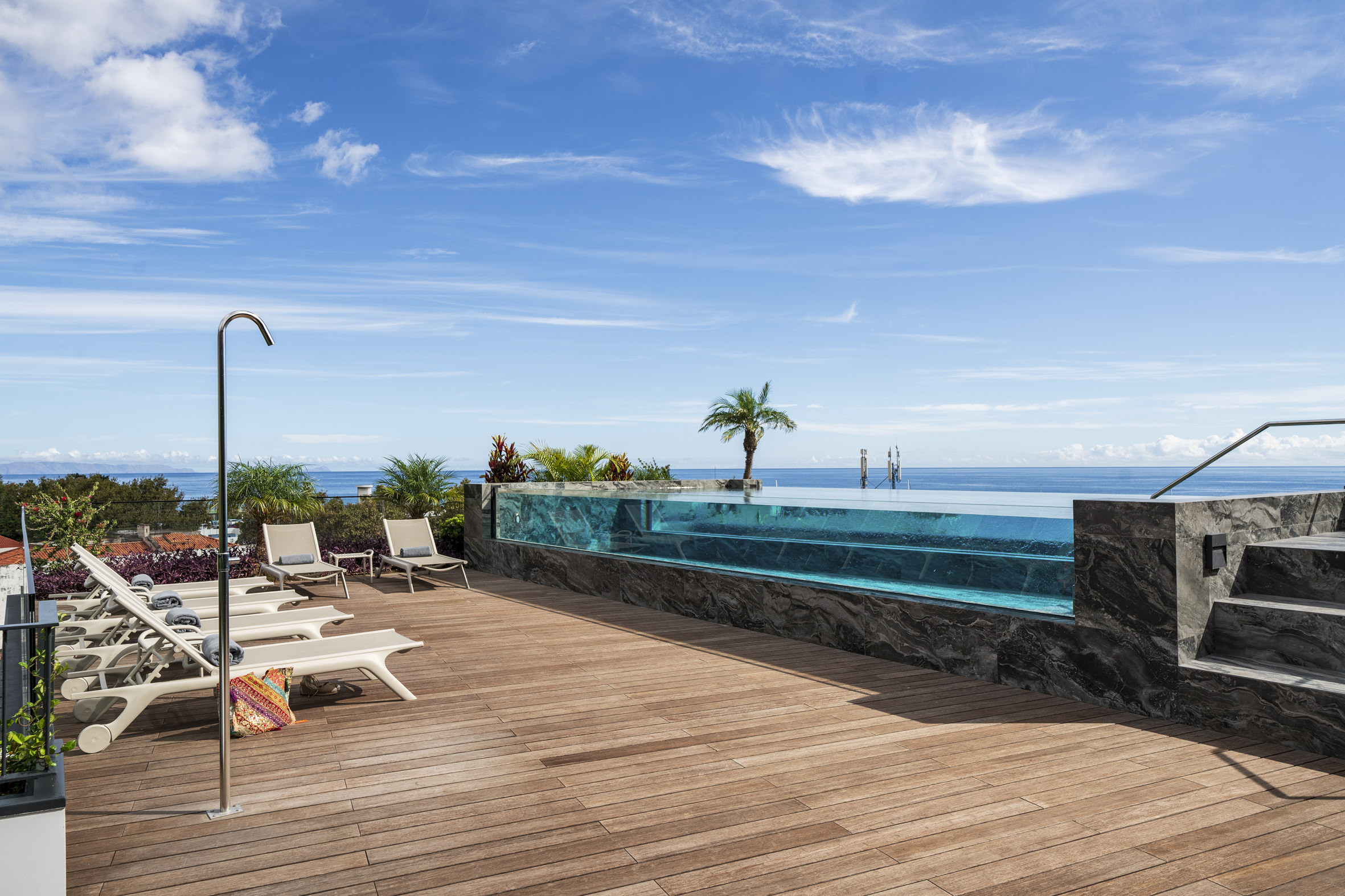 The main balcony offers a serene perspective over Funchal, capturing both the vibrant rhythm of the city and glimpses of the Atlantic beyond. Accessible from the master suite and the living area, it becomes an intimate retreat for slow mornings or sunset reflections. The second balcony, shared between two suites, is enveloped by greenery, offering a secluded and calming escape. Residents of the building enjoy exclusive access to a rooftop terrace featuring an infinity pool, sun loungers and panoramic views stretching across the ocean and Funchal’s terraced hillside, creating a setting ideal for relaxation and contemplation.