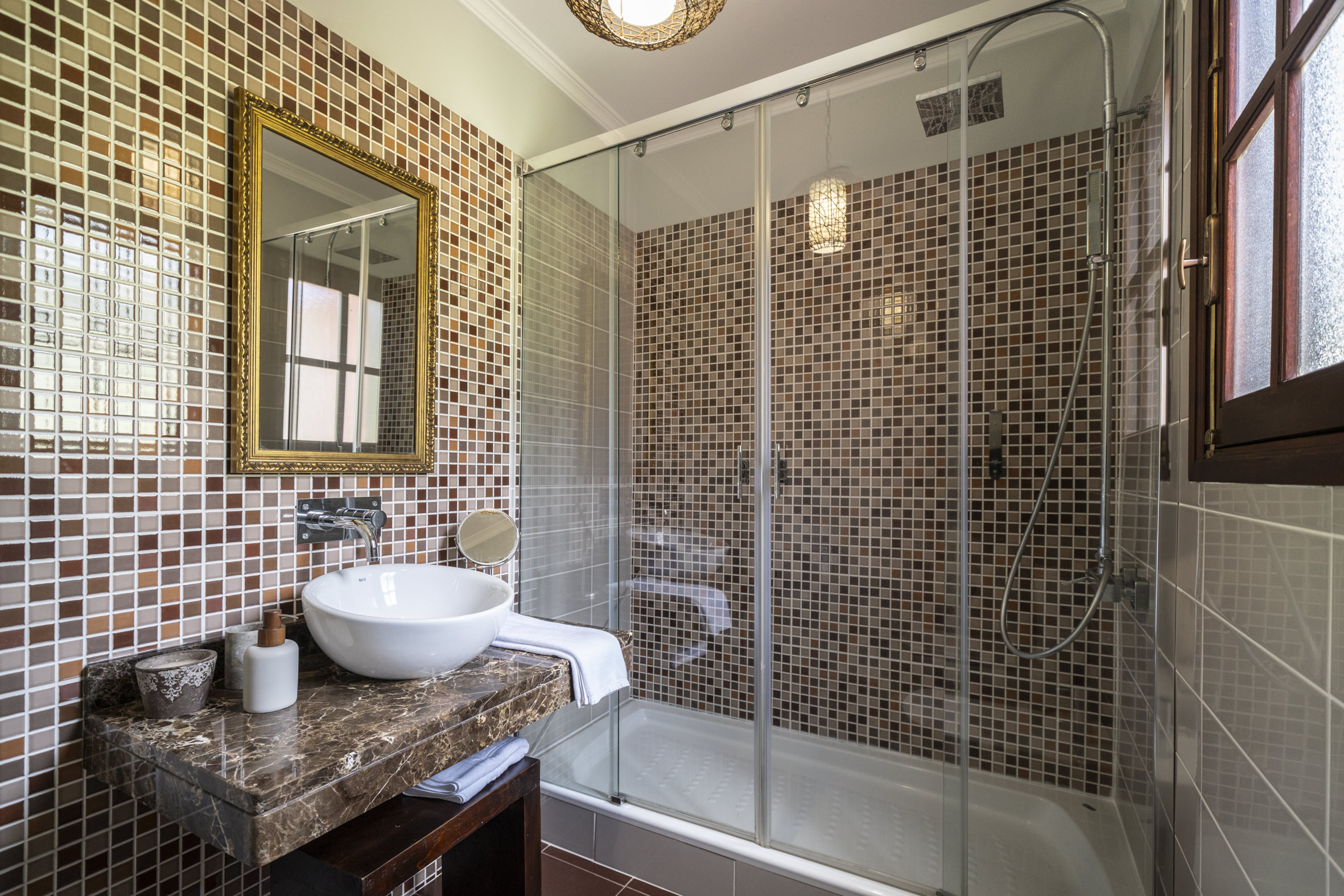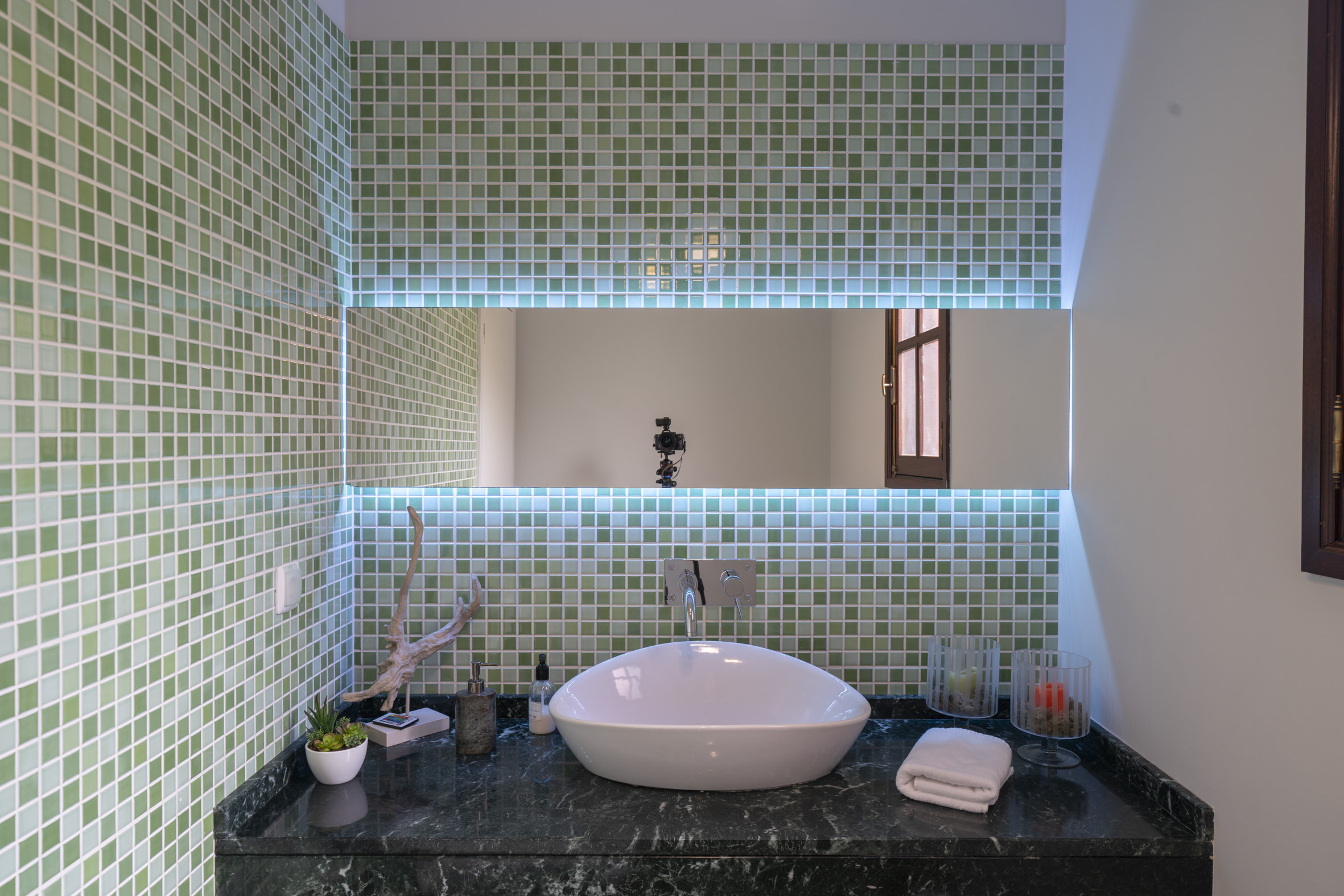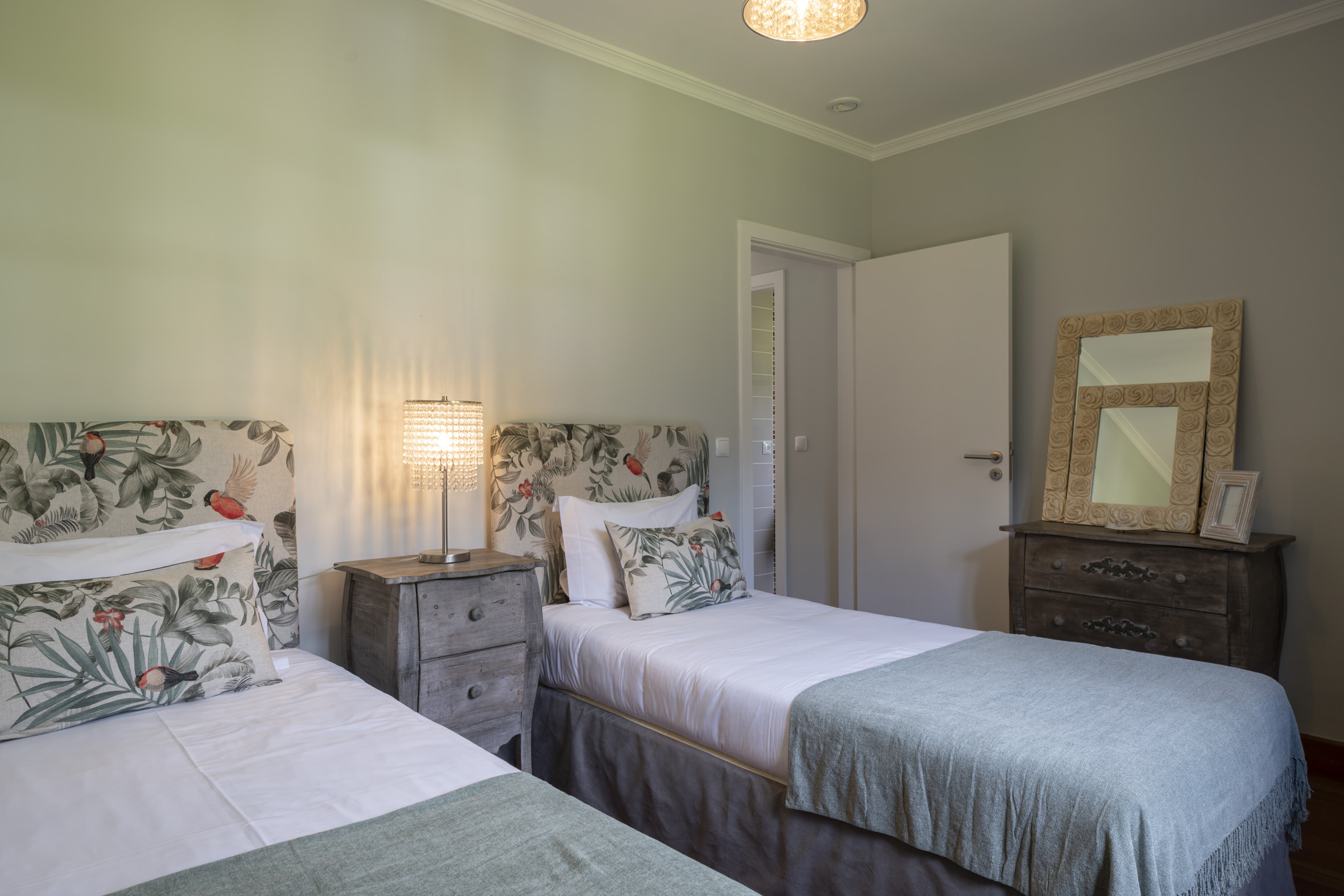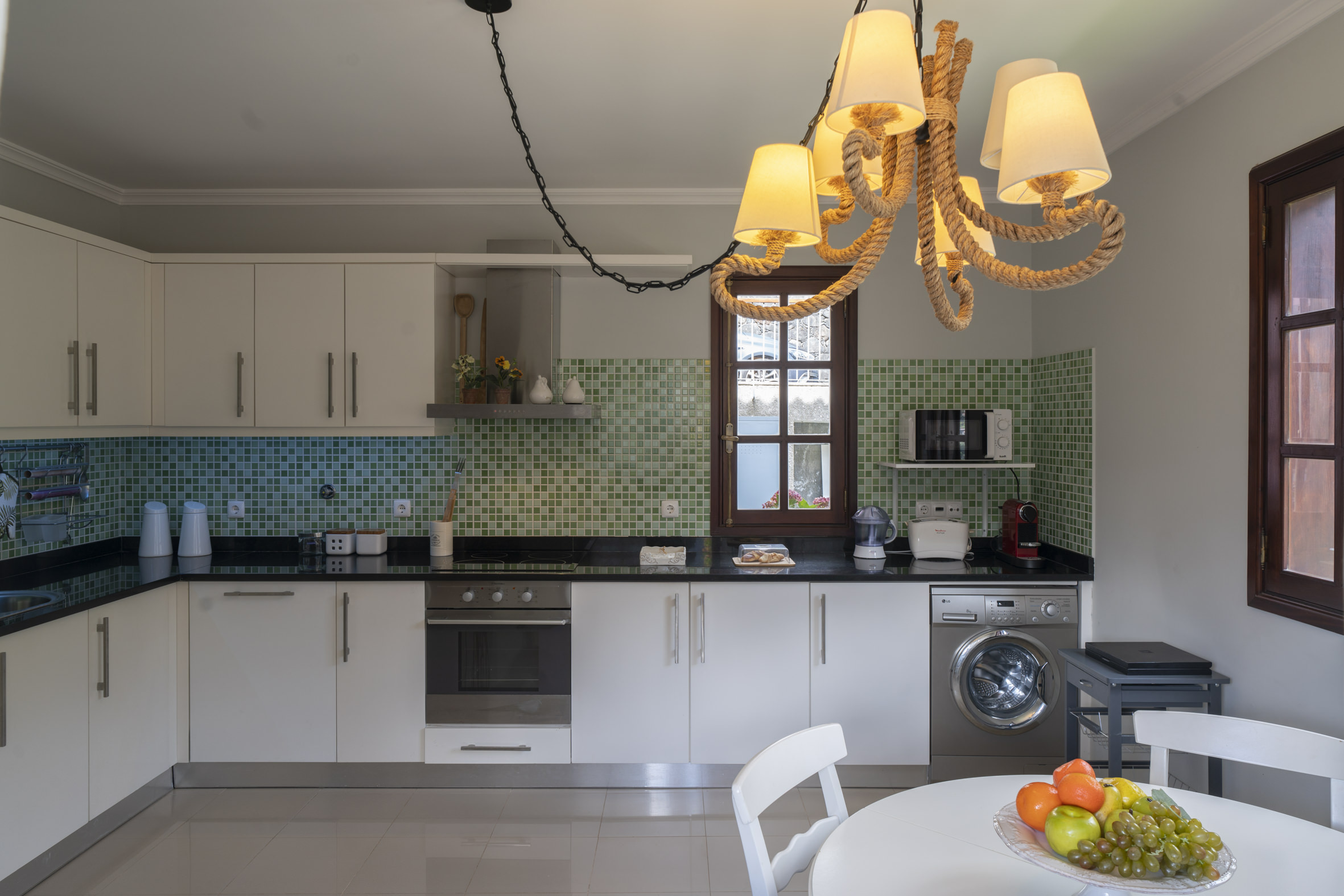 The kitchen is fully equipped, combining functionality with style. White cabinetry and green mosaic tiles bring freshness and brightness to the space, while stainless steel appliances, including an oven, refrigerator, microwave, coffee machine, and washing machine, provide all the conveniences of home. The bathrooms continue this refined aesthetic, one featuring green tiles and a marble counter, and another with warm brown tones, a glass-enclosed shower, and a classic framed mirror that adds a touch of sophistication. The three bedrooms each carry a distinctive personality yet share the same serene elegance. Two of them feature comfortable double beds with soft linens and tasteful lighting, and the third offers twin beds with patterned headboards and matching throws. Large windows and wooden-framed glass doors fill the rooms with natural light and open to the tranquil views of the valley, making each space feel like a private sanctuary.