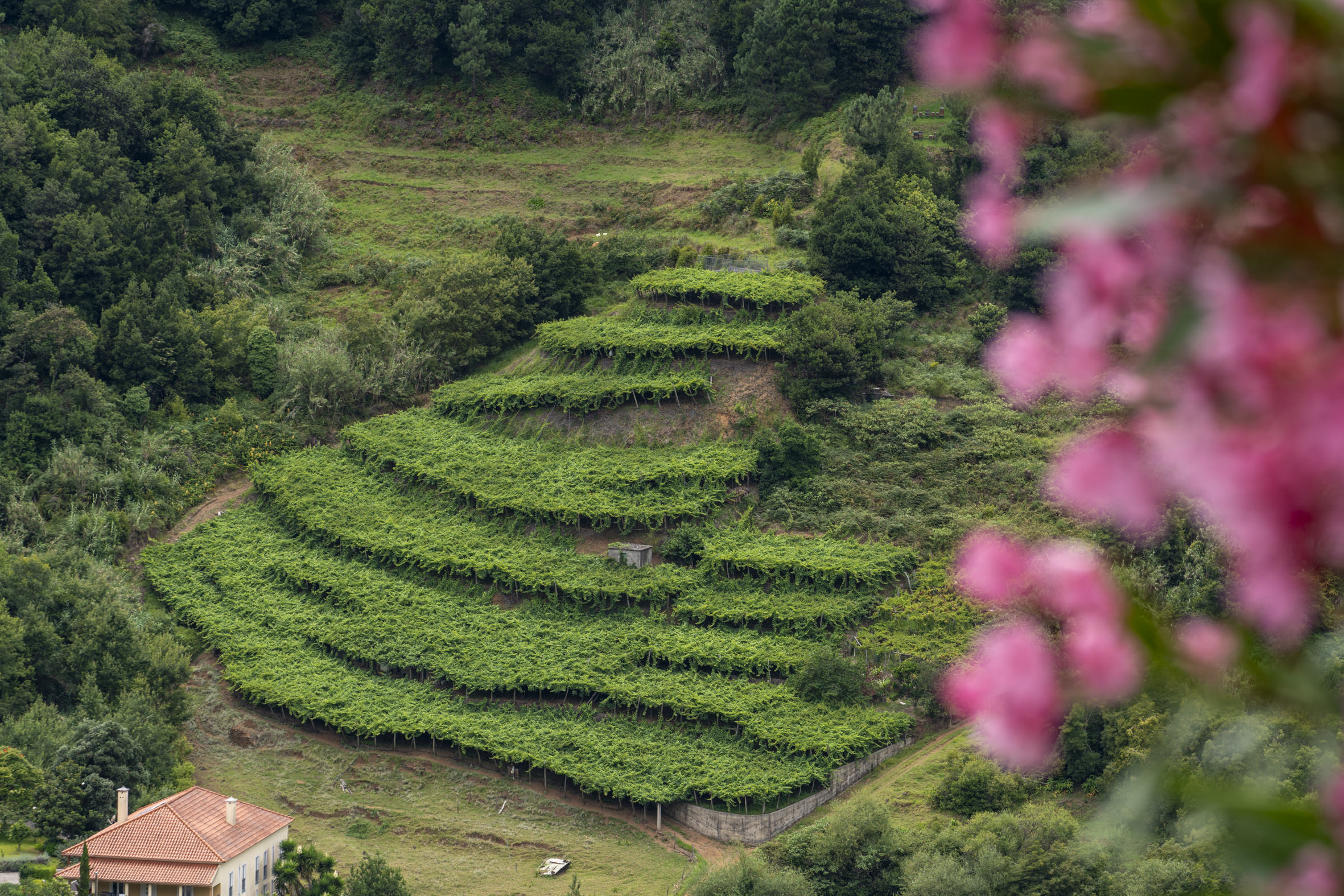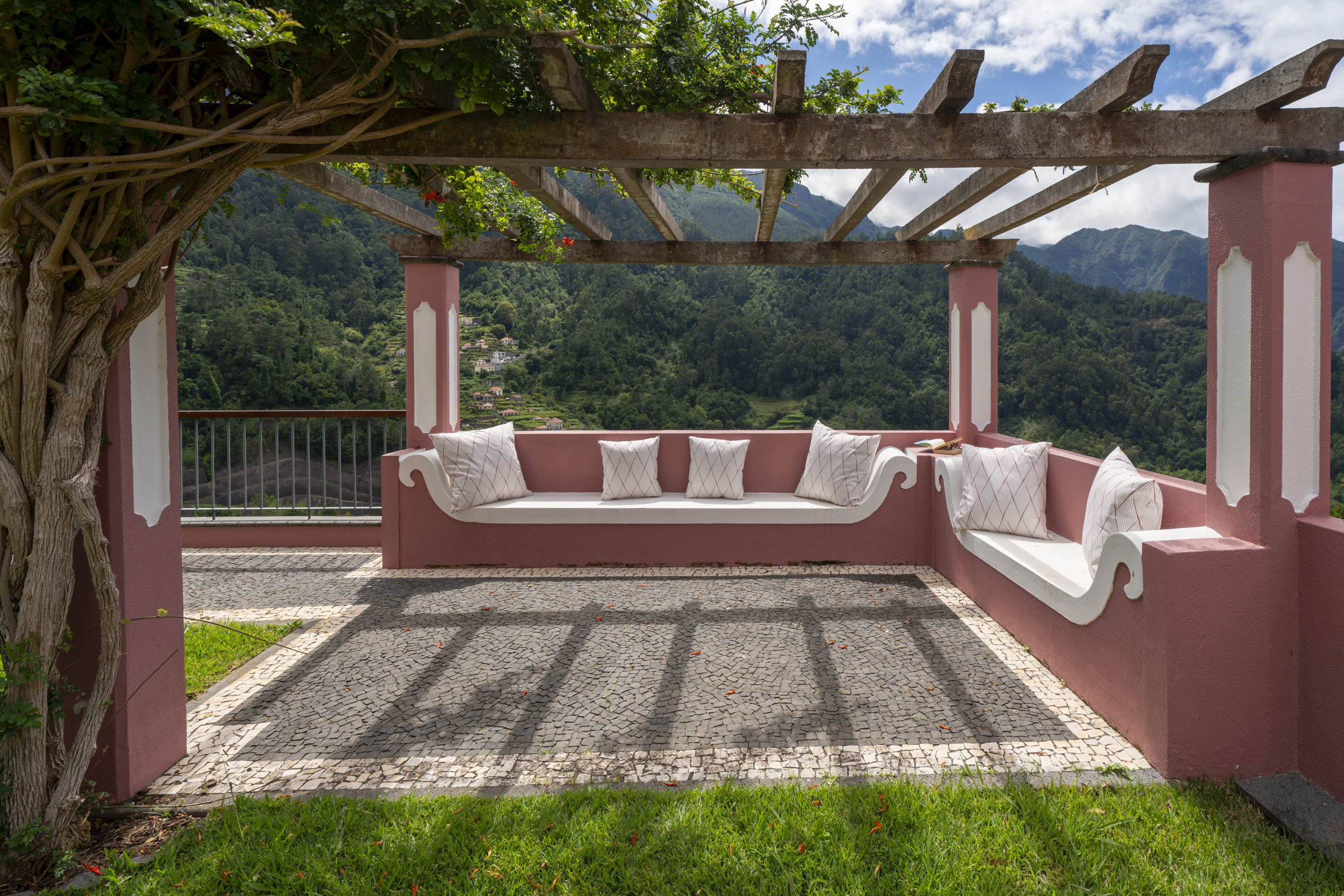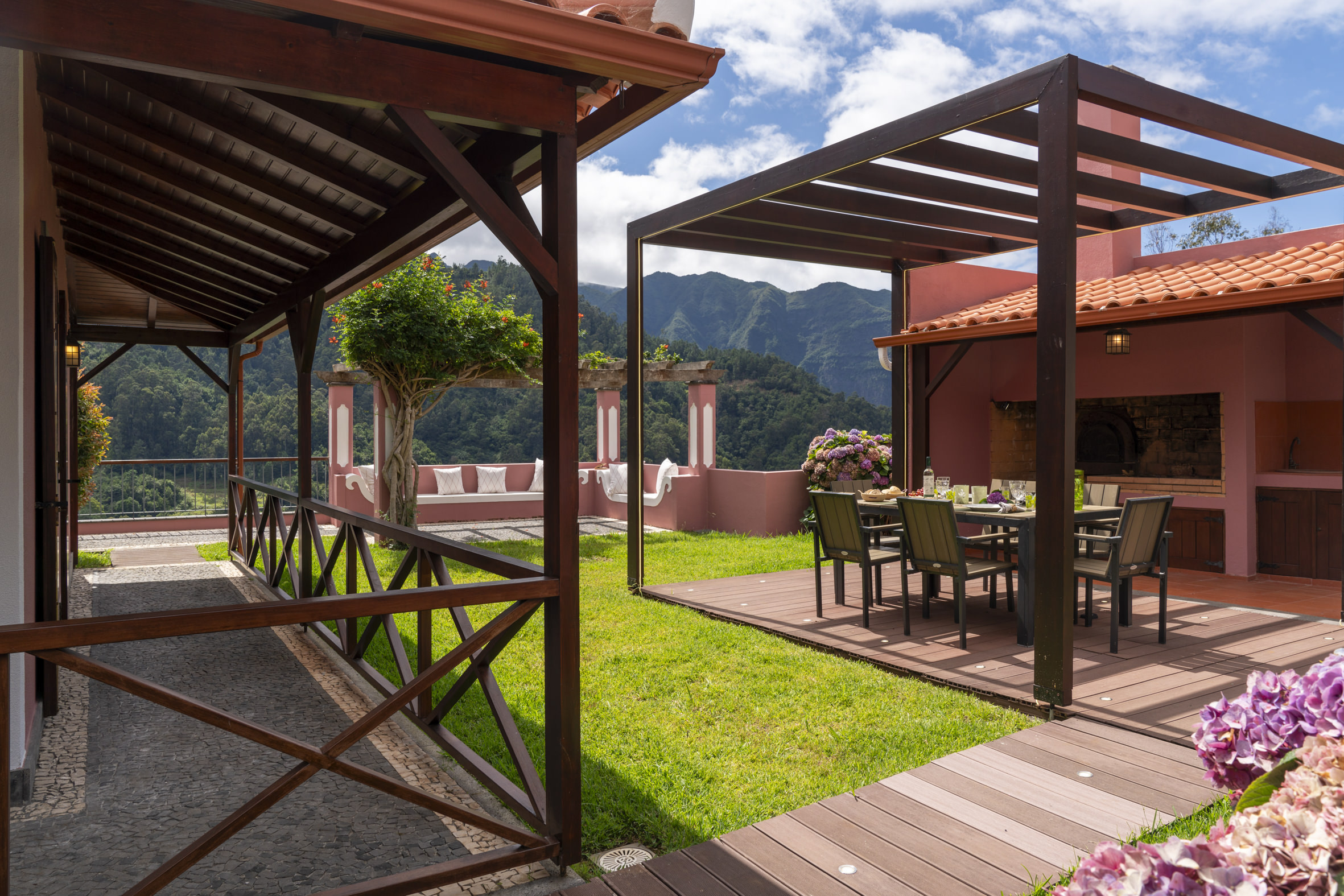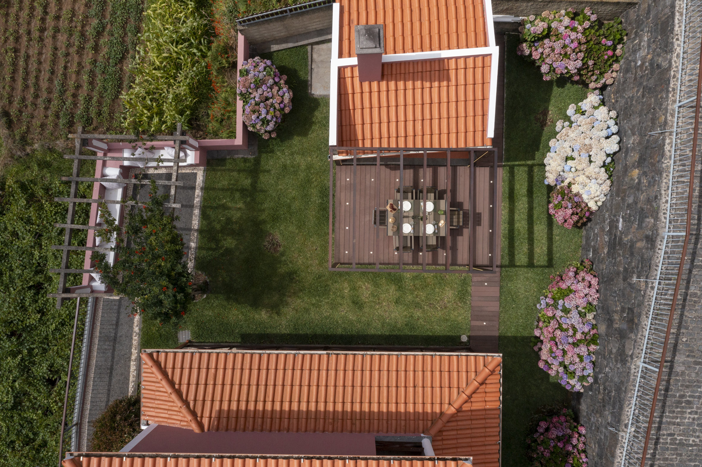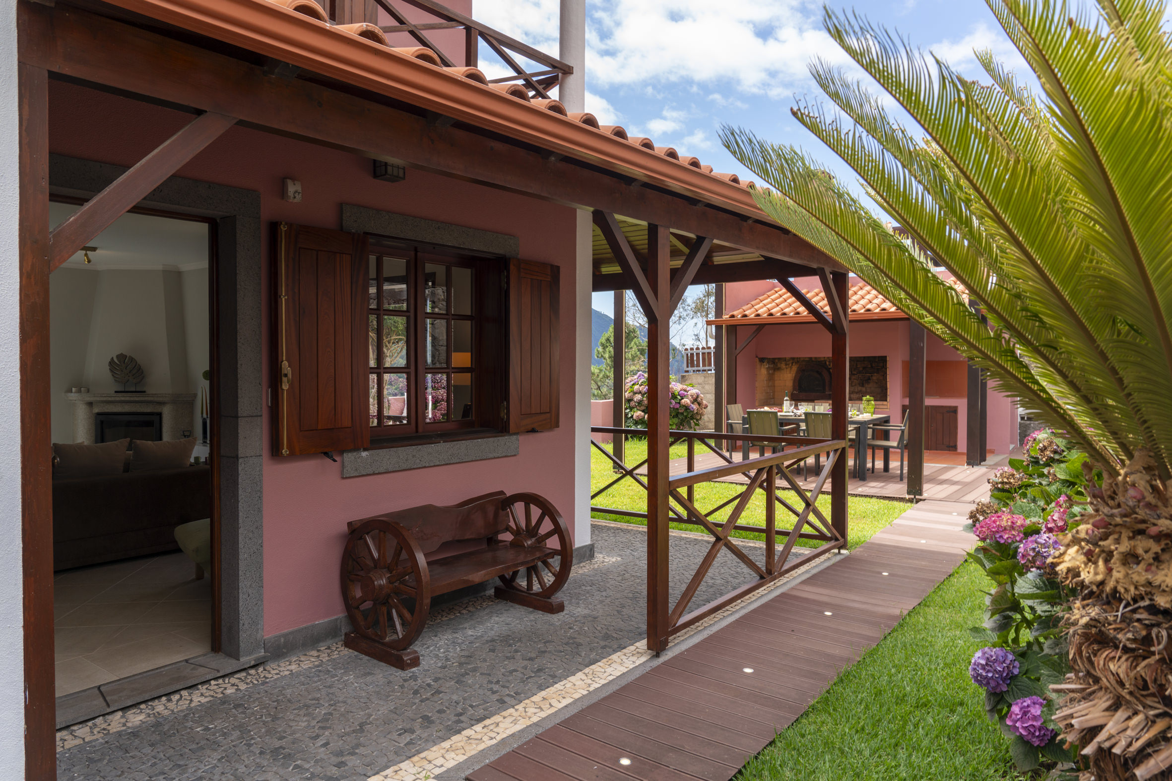 The garden embraces the house with vibrant colours and natural textures. A wooden deck hosts an inviting dining table surrounded by comfortable chairs, perfect for sharing meals in the open air. The built-in barbecue and traditional wood oven invite long afternoons of cooking and laughter, while the scent of blooming hydrangeas adds freshness to the atmosphere. The pergola provides gentle shade and opens to a cosy sitting area framed by pink columns and lush vines, offering a stunning view over the São Vicente valley. Stone pathways lead through manicured grass and flower beds, and the terracotta roof harmonises beautifully with the surrounding greenery. The setting is serene and secluded, with private parking conveniently located within the property. Whether you are enjoying a sunny breakfast or an evening under the stars, the garden becomes a haven of calm and beauty.