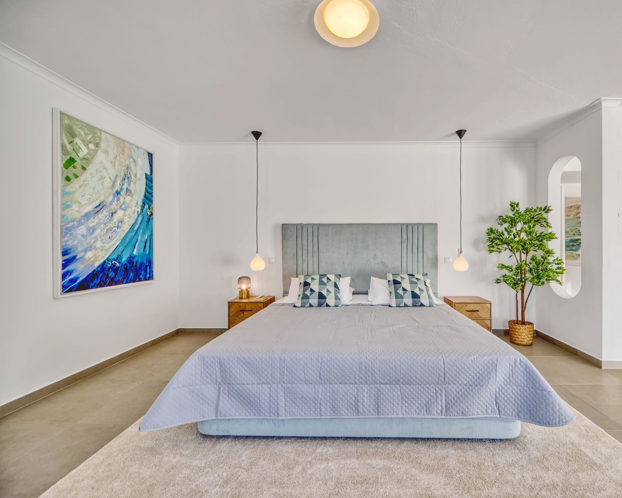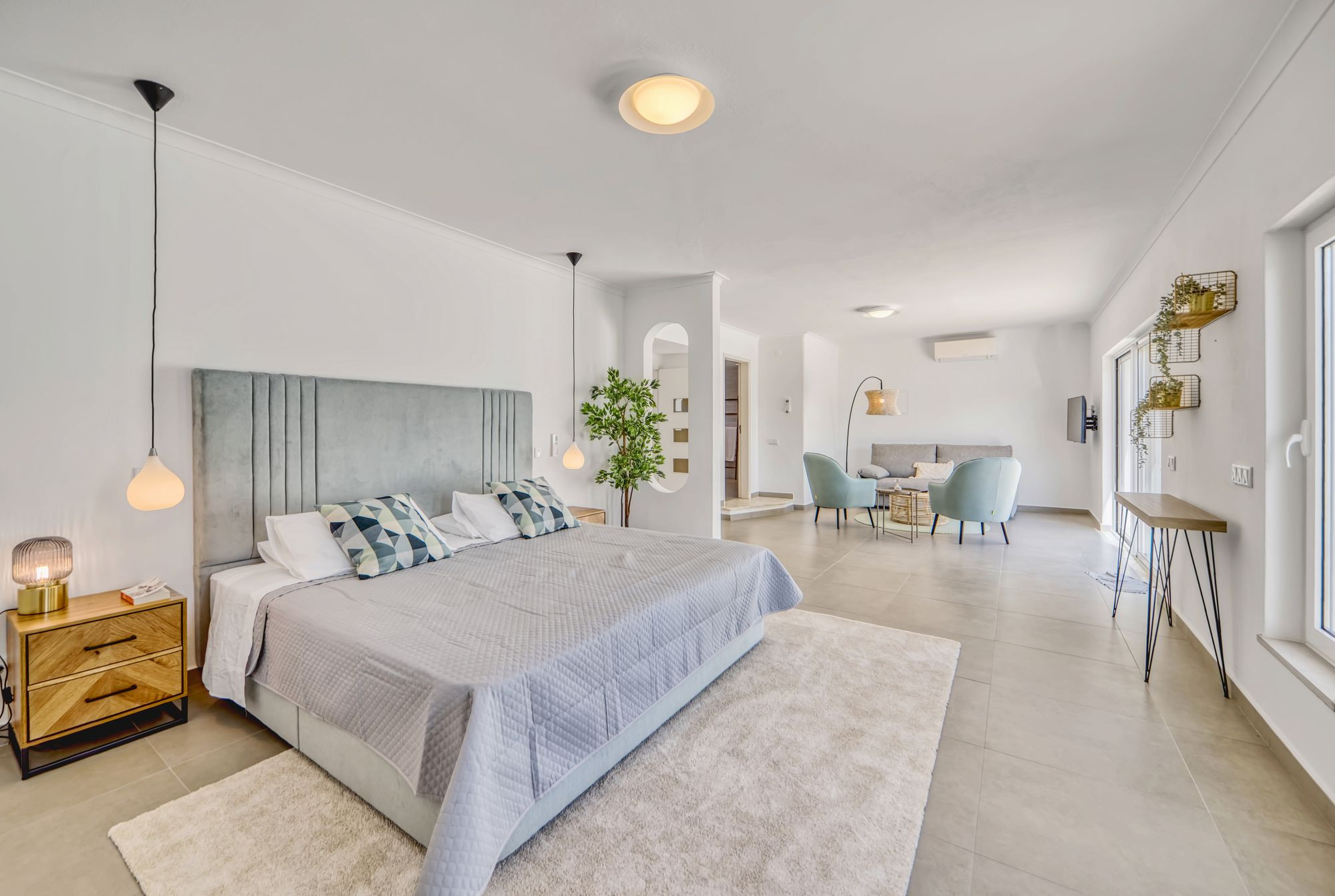 On the first floor, you will find the master bedroom with a large en-suite bathroom and a walk-in closet/dressing room. The bedroom also has a sitting area with sofa bed, which can sleep an extra 2 people (recommended for kids only). Through the glass doors, you will find a large sun balcony where you can sit and enjoy the views over the pool area and golf course.