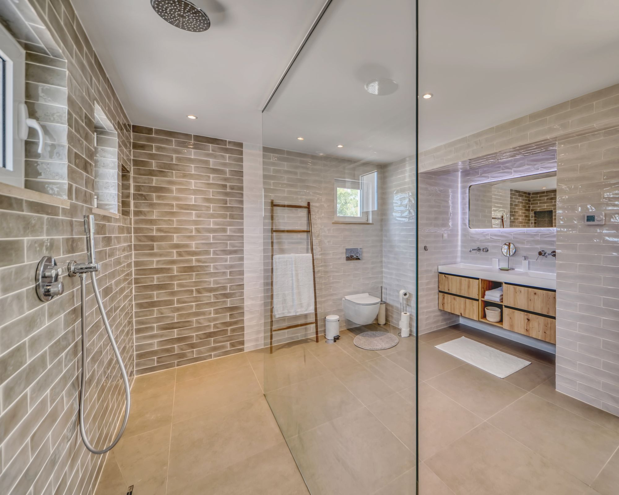 On the ground floor, you will find a large family-style kitchen, living room, dining area, two large bedrooms with en-suite bathrooms and a home office/study. The bedrooms here both have 2 single beds (which can be pushed together to create a double bed) and one bathroom features a bathtub. In the living room, there is a sofa bed, which can sleep an extra 2 people (recommended for kids only). Through the glass doors in the living room, you enter the outdoor pool and relaxing area. There are sunbeds, an outdoor shower, outdoor dining and barbecue area to enjoy.