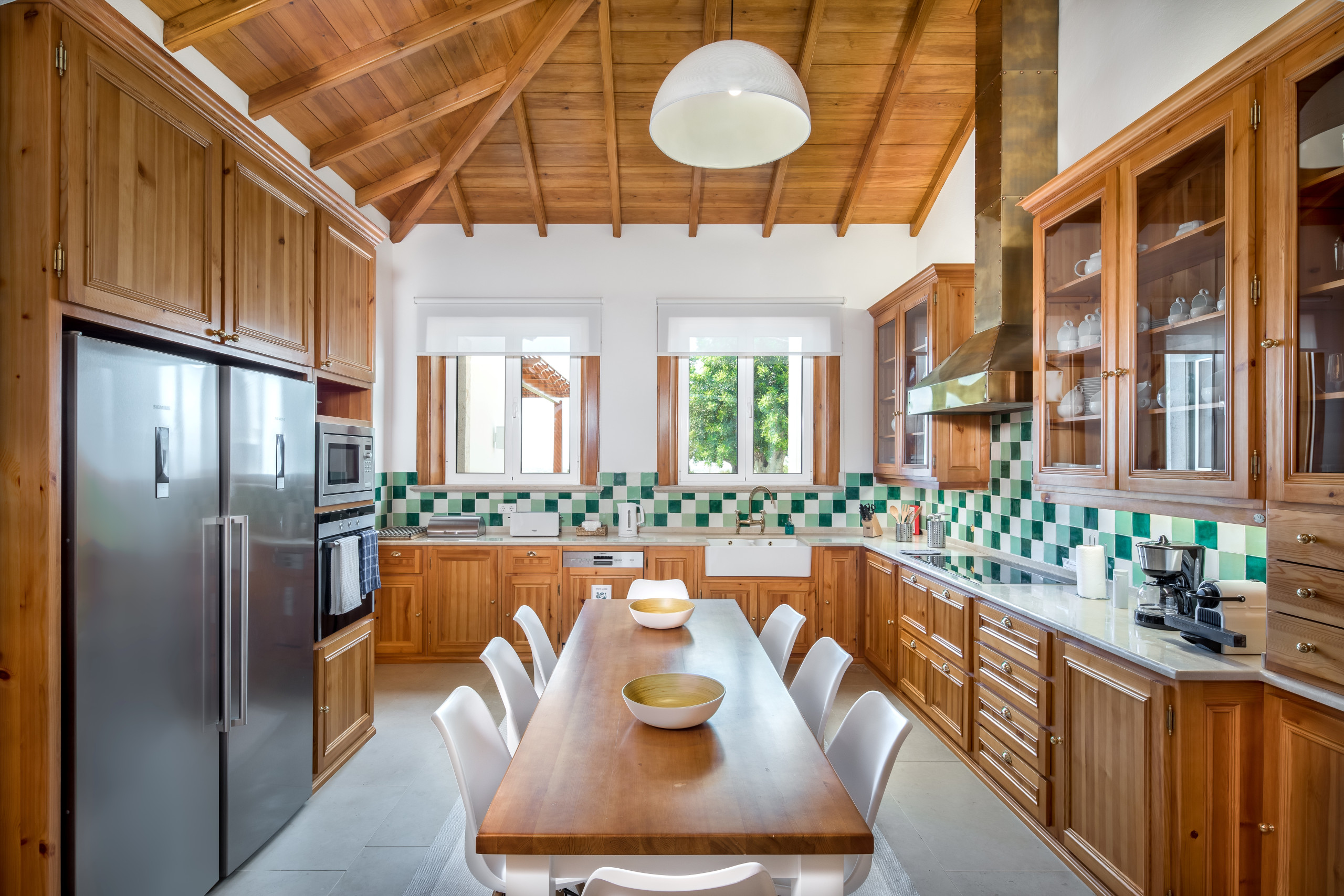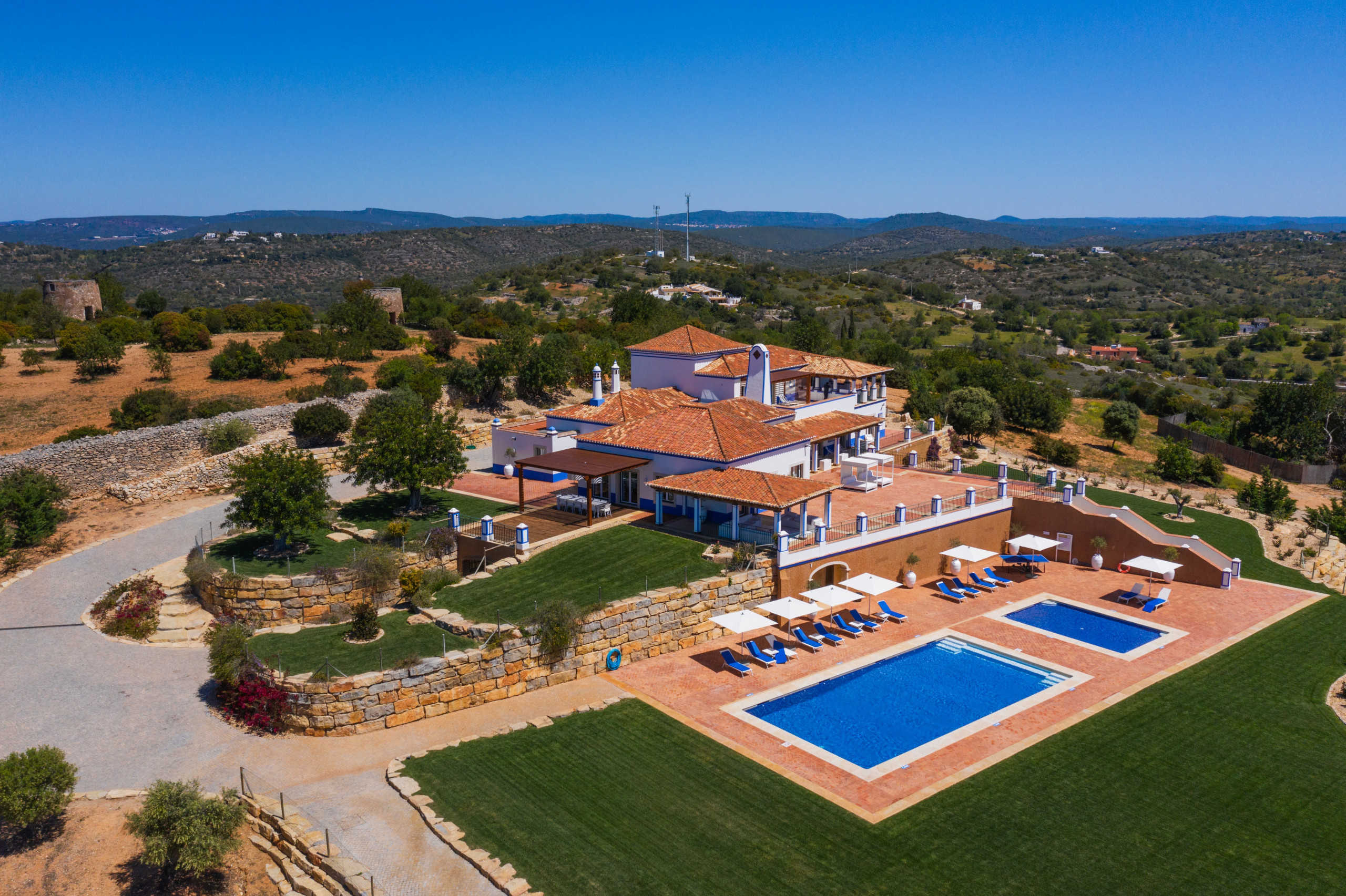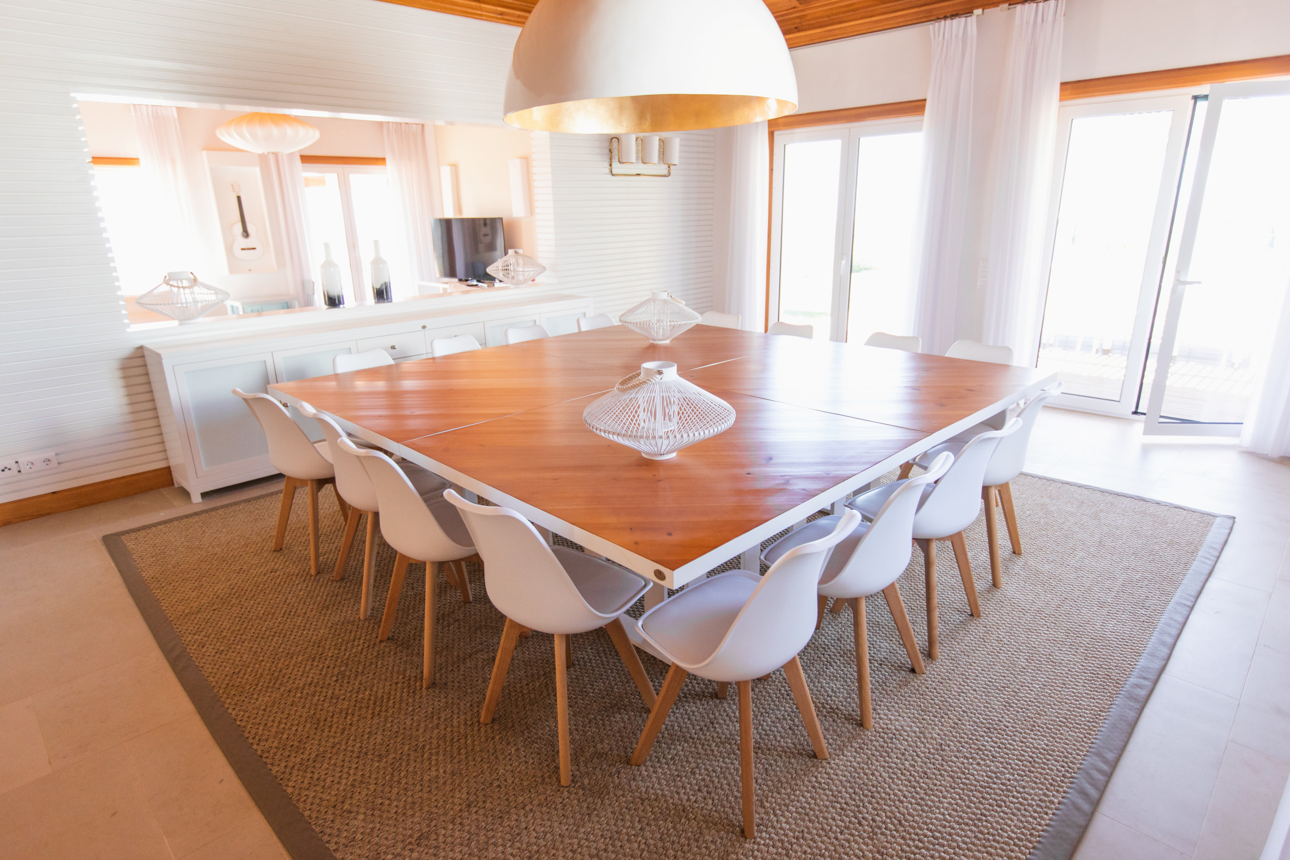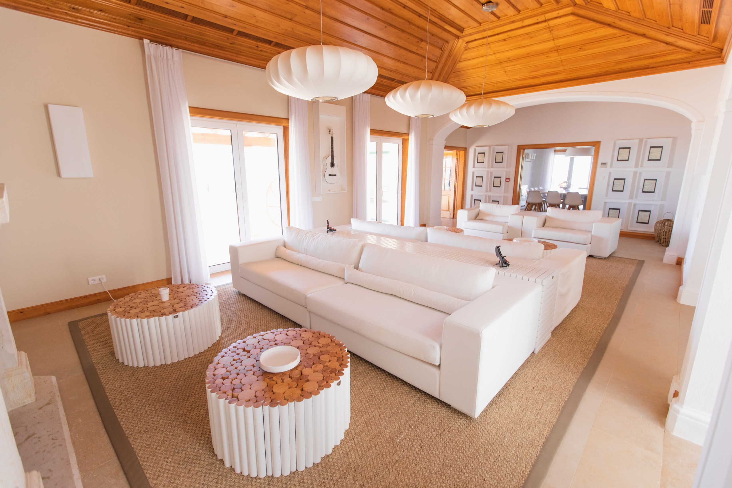 Sunlit living spaces flow effortlessly between lounge, dining and kitchen areas, framed by soft neutral tones, natural textures and handcrafted details that echo the quiet beauty of the Algarve. The open-plan living room features plush seating and curated décor, while the fully equipped kitchen blends traditional wooden cabinetry with modern appliances, ideal for relaxed home cooking or shared meals with loved ones. Seven bedrooms provide generous comfort and flexibility, offering five double rooms and two twin rooms, each styled with crisp linens and calming accents. Ten bathrooms ensure convenience for larger groups, and air conditioning throughout the home guarantees comfort across every season. Leisure is central to the experience, with a flat-screen TV, PlayStation and a dedicated games room complete with a pool table and table football, creating a lively setting for both adults and children to unwind.