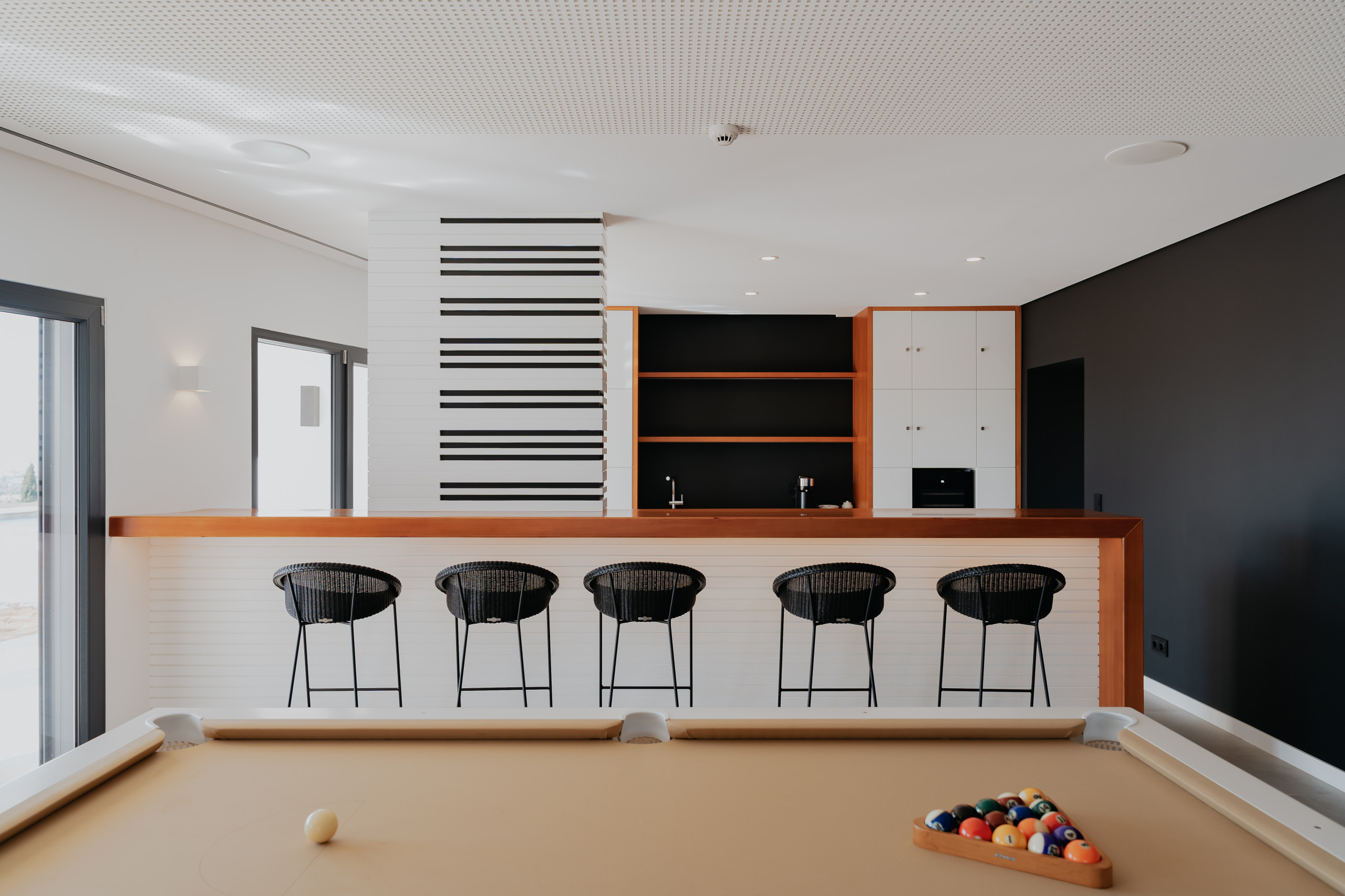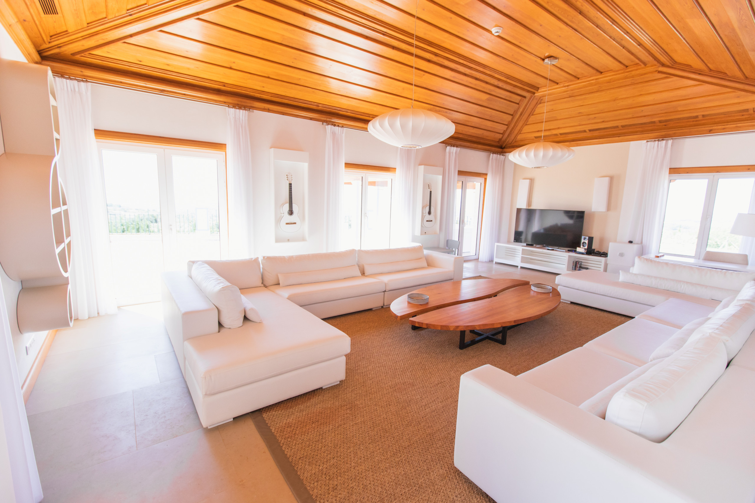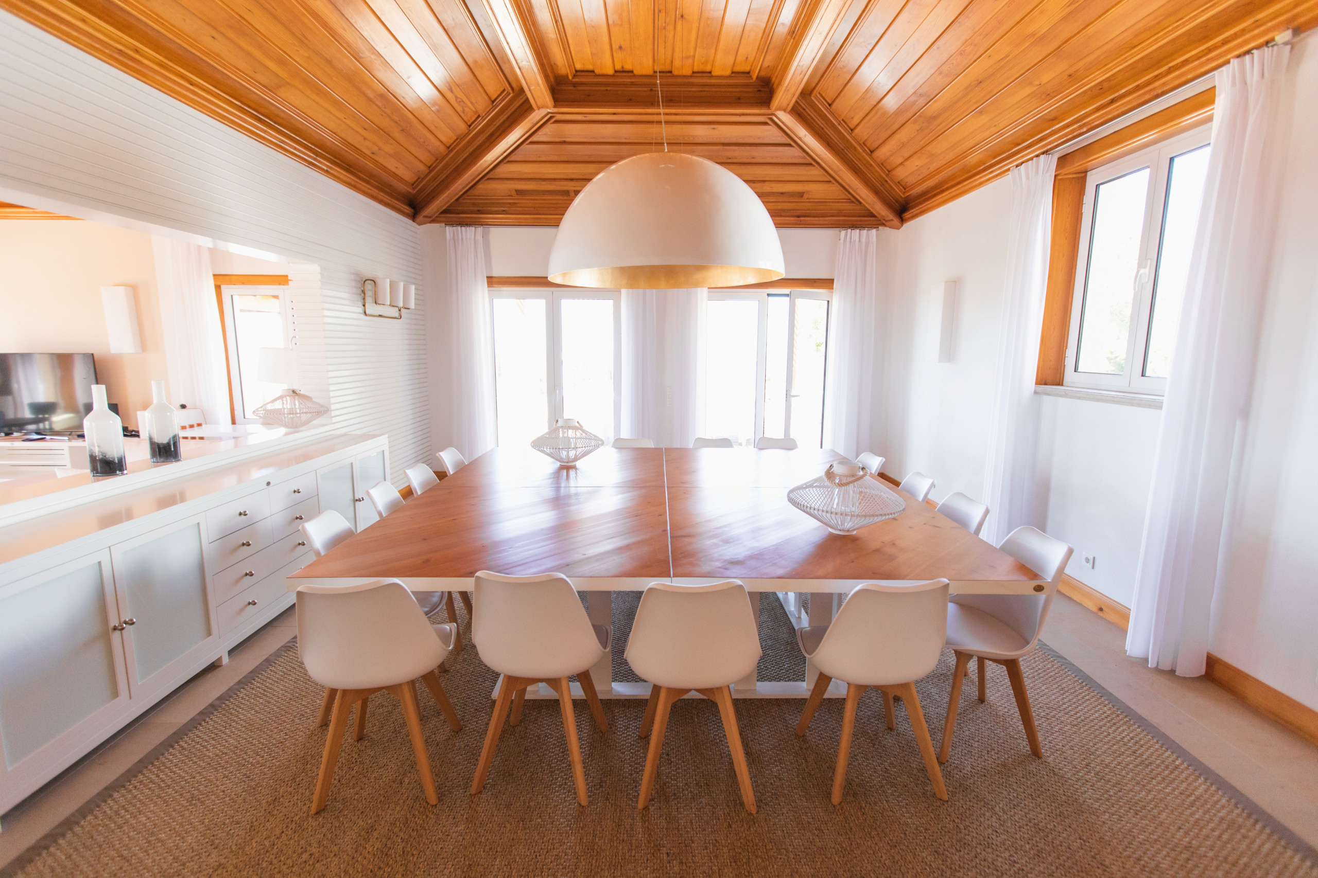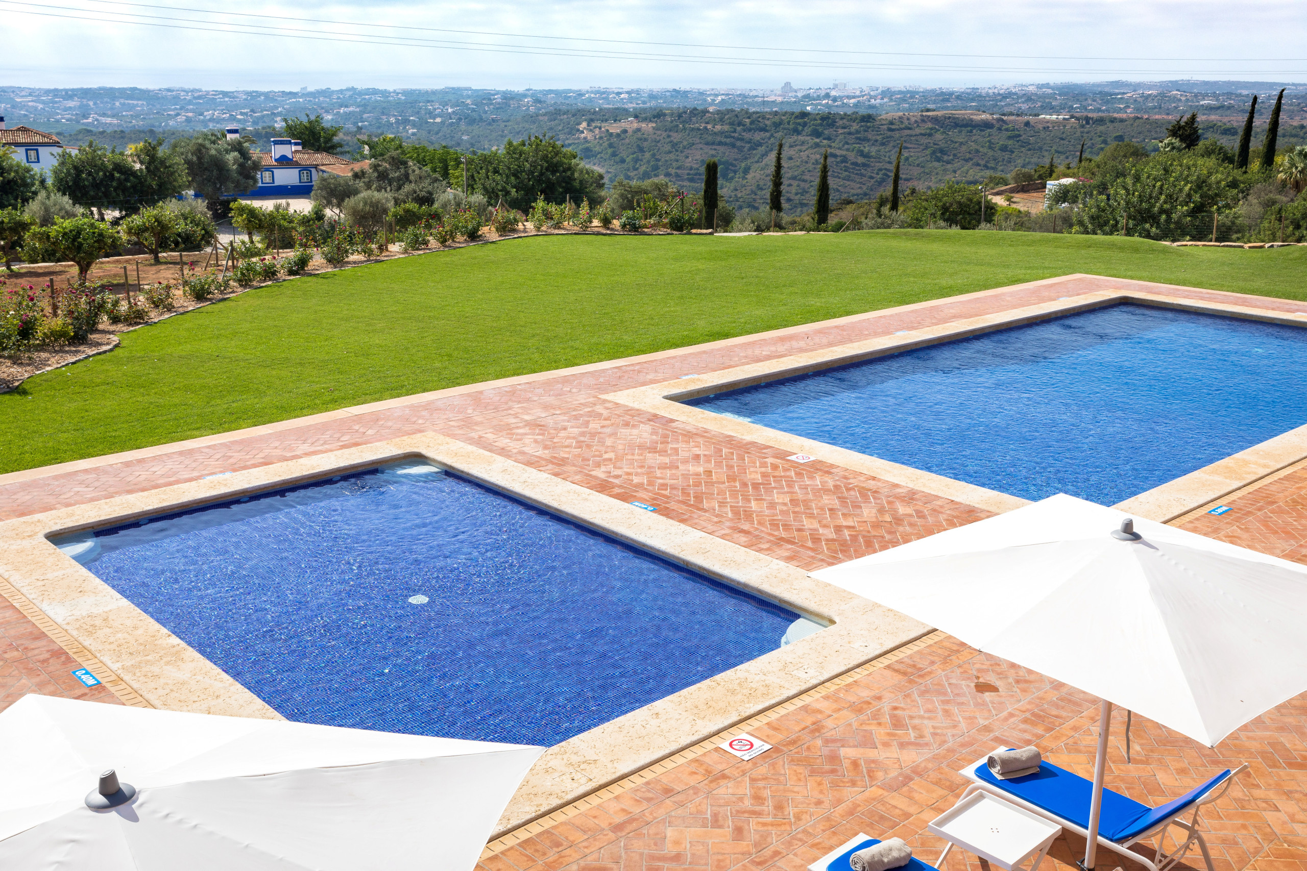 Sunlit living spaces flow effortlessly between lounge, dining and kitchen areas, framed by soft neutral tones, natural textures and handcrafted details that echo the quiet beauty of the Algarve. The open-plan living room features plush seating and curated décor, while the fully equipped kitchen blends traditional wooden cabinetry with modern appliances, ideal for relaxed home cooking or shared meals with loved ones. Seven bedrooms provide generous comfort and flexibility, offering five double rooms and two twin rooms, each styled with crisp linens and calming accents. Ten bathrooms ensure convenience for larger groups, and air conditioning throughout the home guarantees comfort across every season. Leisure is central to the experience, with a flat-screen TV, PlayStation and a dedicated games room complete with a pool table and table football, creating a lively setting for both adults and children to unwind.