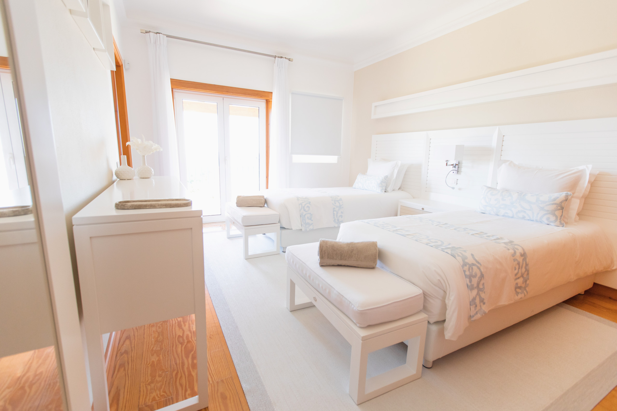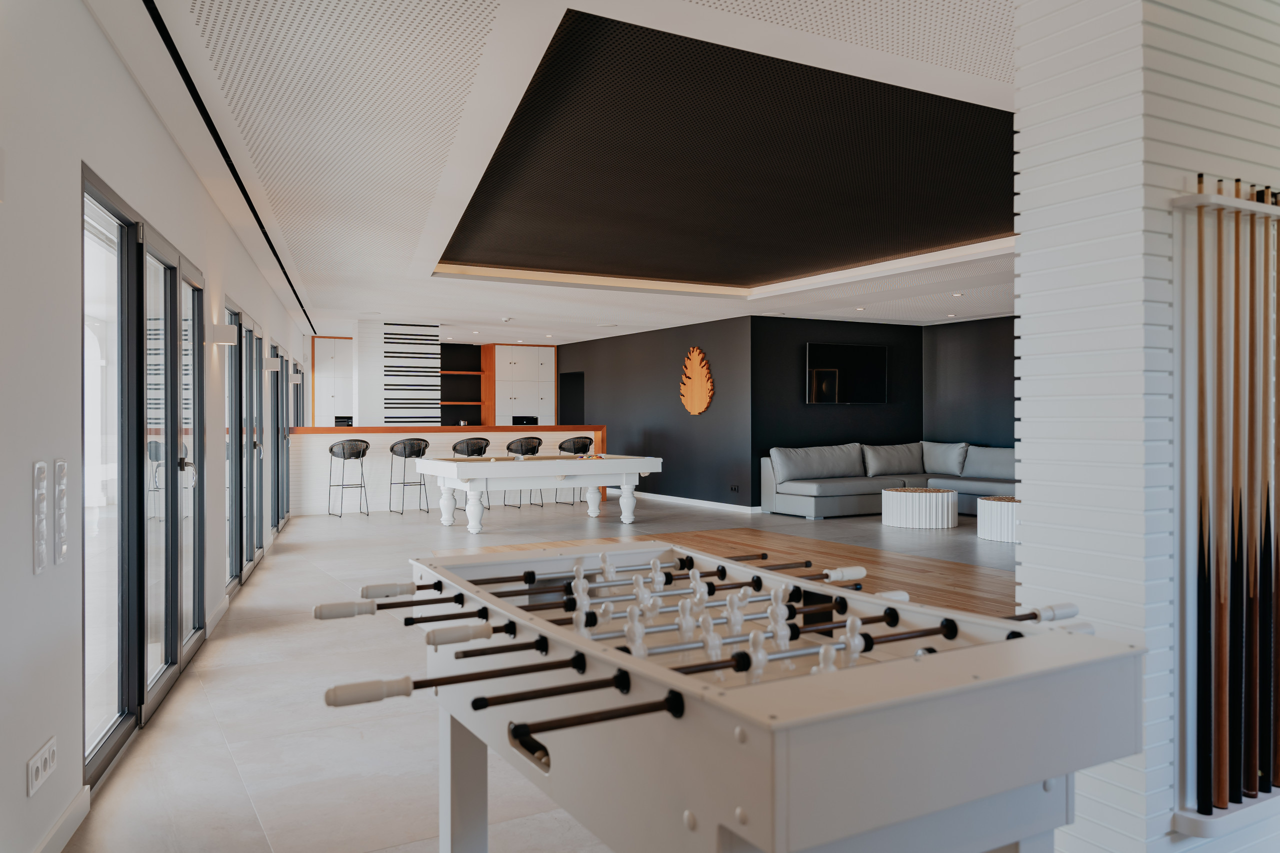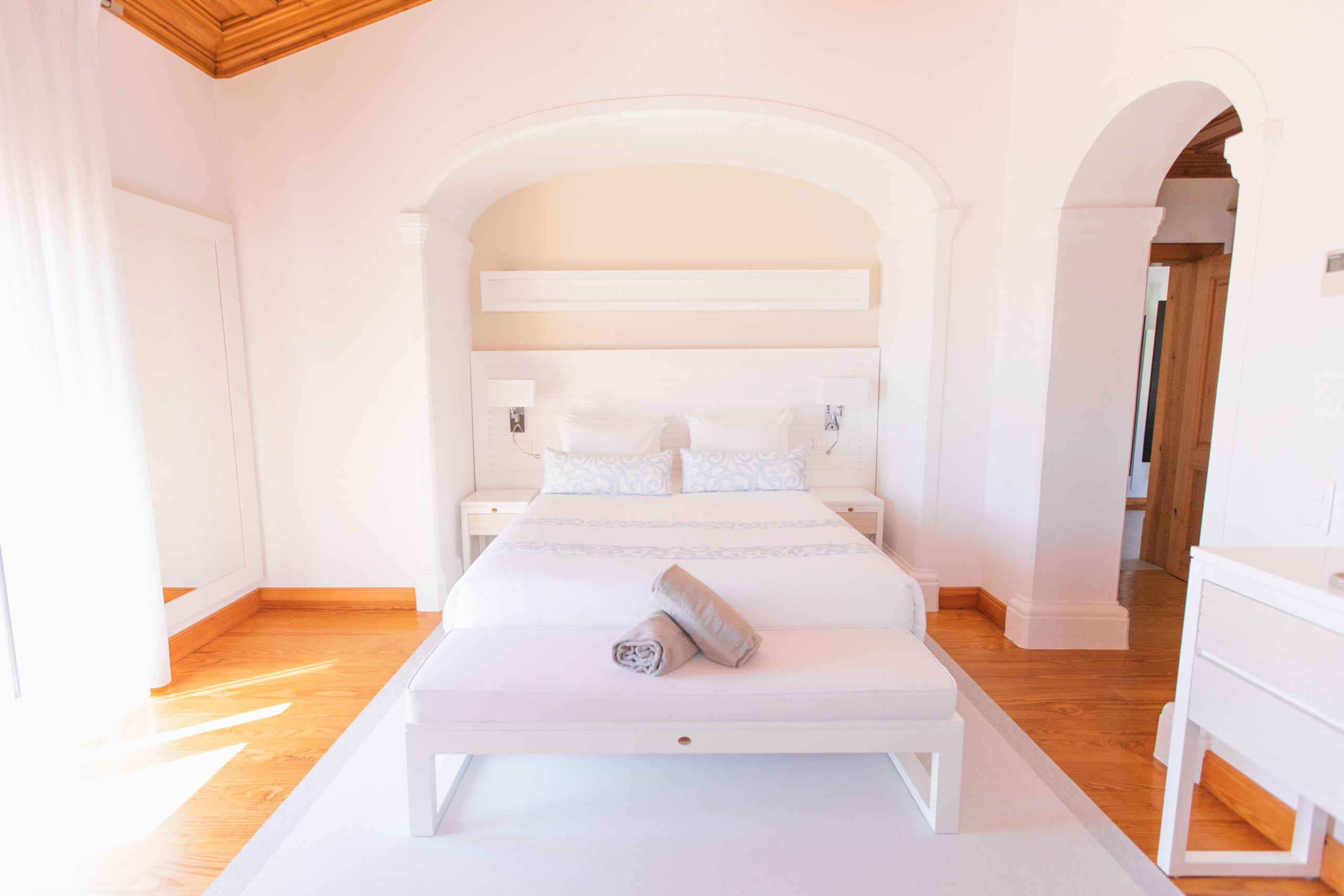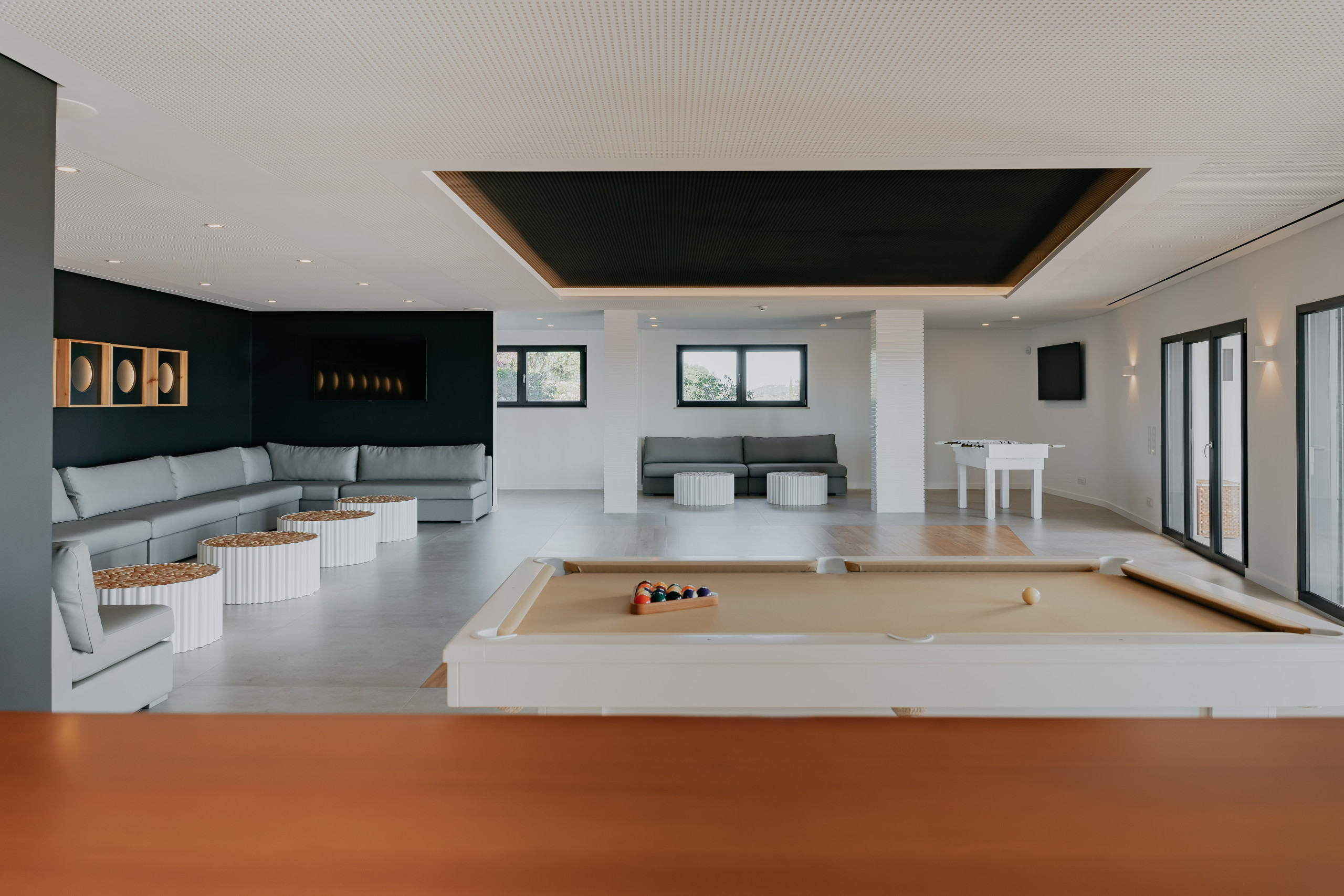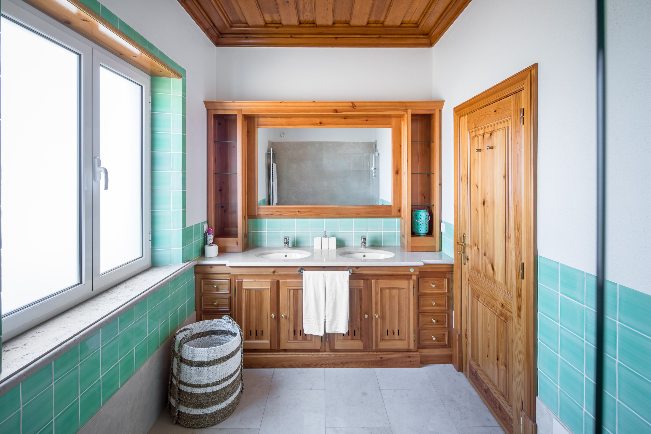 Sunlit living spaces flow effortlessly between lounge, dining and kitchen areas, framed by soft neutral tones, natural textures and handcrafted details that echo the quiet beauty of the Algarve. The open-plan living room features plush seating and curated décor, while the fully equipped kitchen blends traditional wooden cabinetry with modern appliances, ideal for relaxed home cooking or shared meals with loved ones. Seven bedrooms provide generous comfort and flexibility, offering five double rooms and two twin rooms, each styled with crisp linens and calming accents. Ten bathrooms ensure convenience for larger groups, and air conditioning throughout the home guarantees comfort across every season. Leisure is central to the experience, with a flat-screen TV, PlayStation and a dedicated games room complete with a pool table and table football, creating a lively setting for both adults and children to unwind.