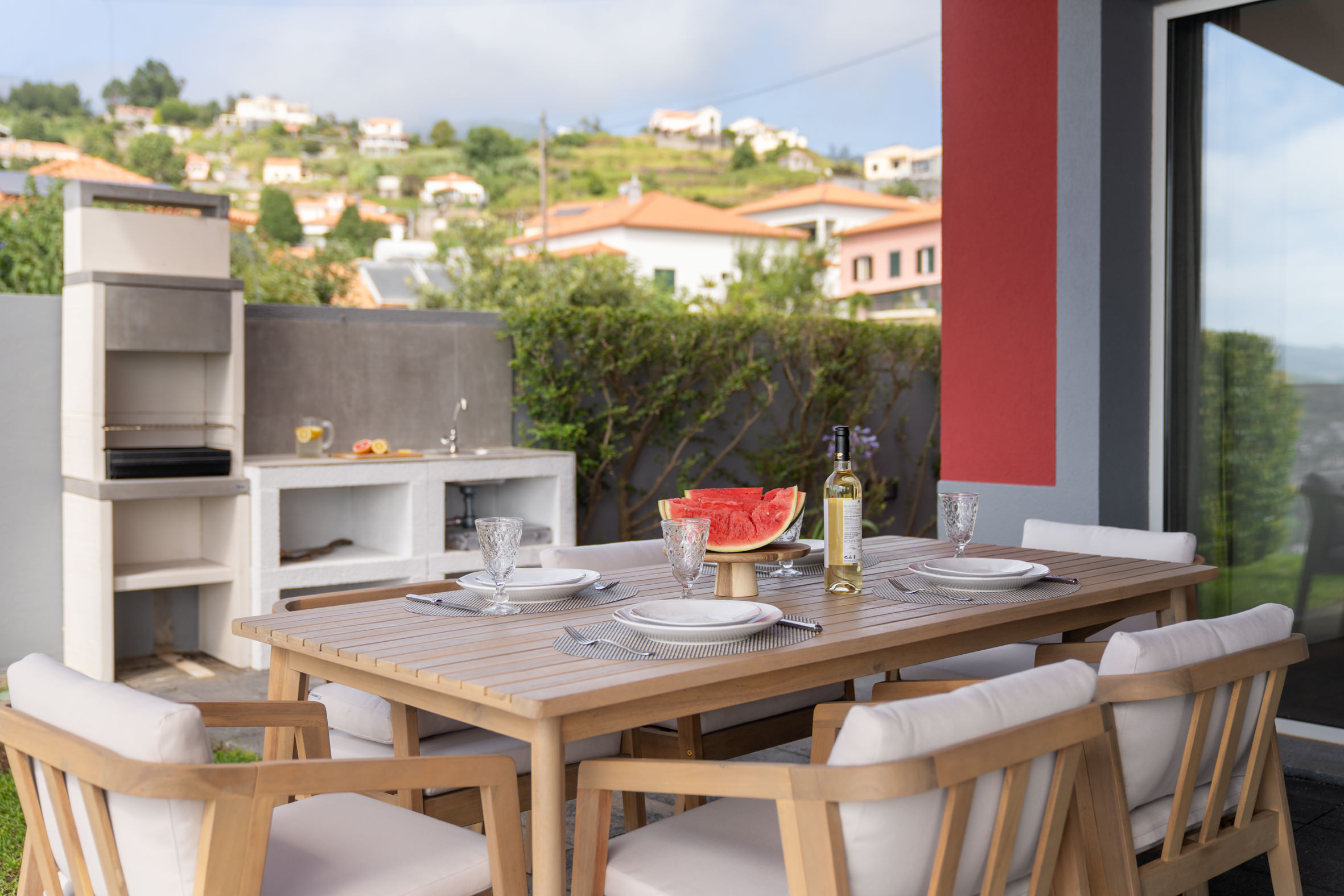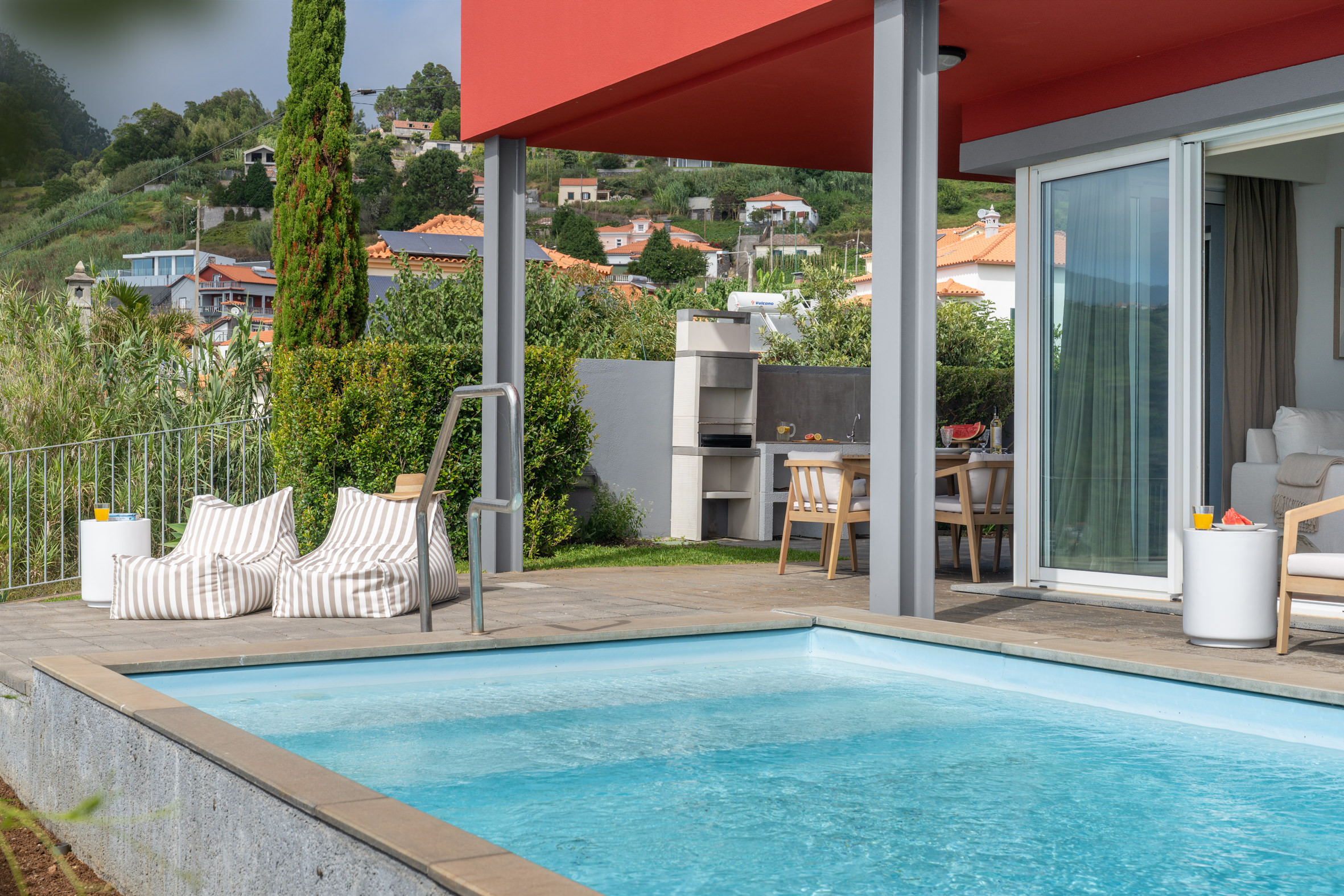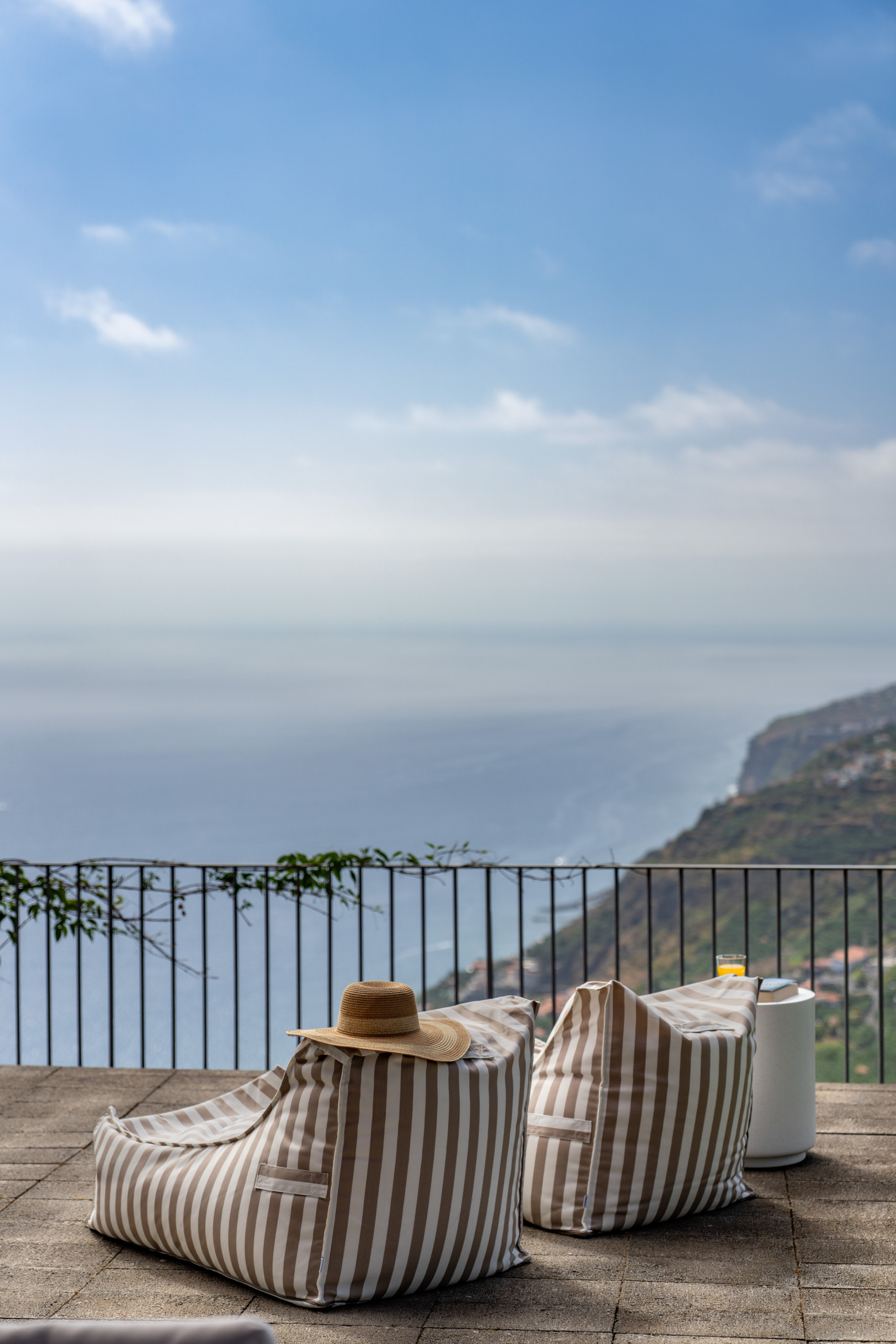 Surrounded by an open landscape of mountains and sea, the exterior was designed to celebrate Madeira's natural light. A private swimming pool sits at the heart of the outdoor area, offering a peaceful place to unwind while admiring the unobstructed views. Comfortable sun loungers and shaded sitting areas invite you to enjoy each hour of the day, from quiet mornings to golden afternoons. The barbecue area and covered dining space provide the perfect setting for alfresco meals shared with family or friends. The warm tones of the façade contrast beautifully with the surrounding greenery, creating a timeless connection between architecture and landscape. Whether watching the sunset from the terrace or gazing at the stars reflected on the water, every moment outdoors feels calm, unhurried, and in perfect balance with nature.