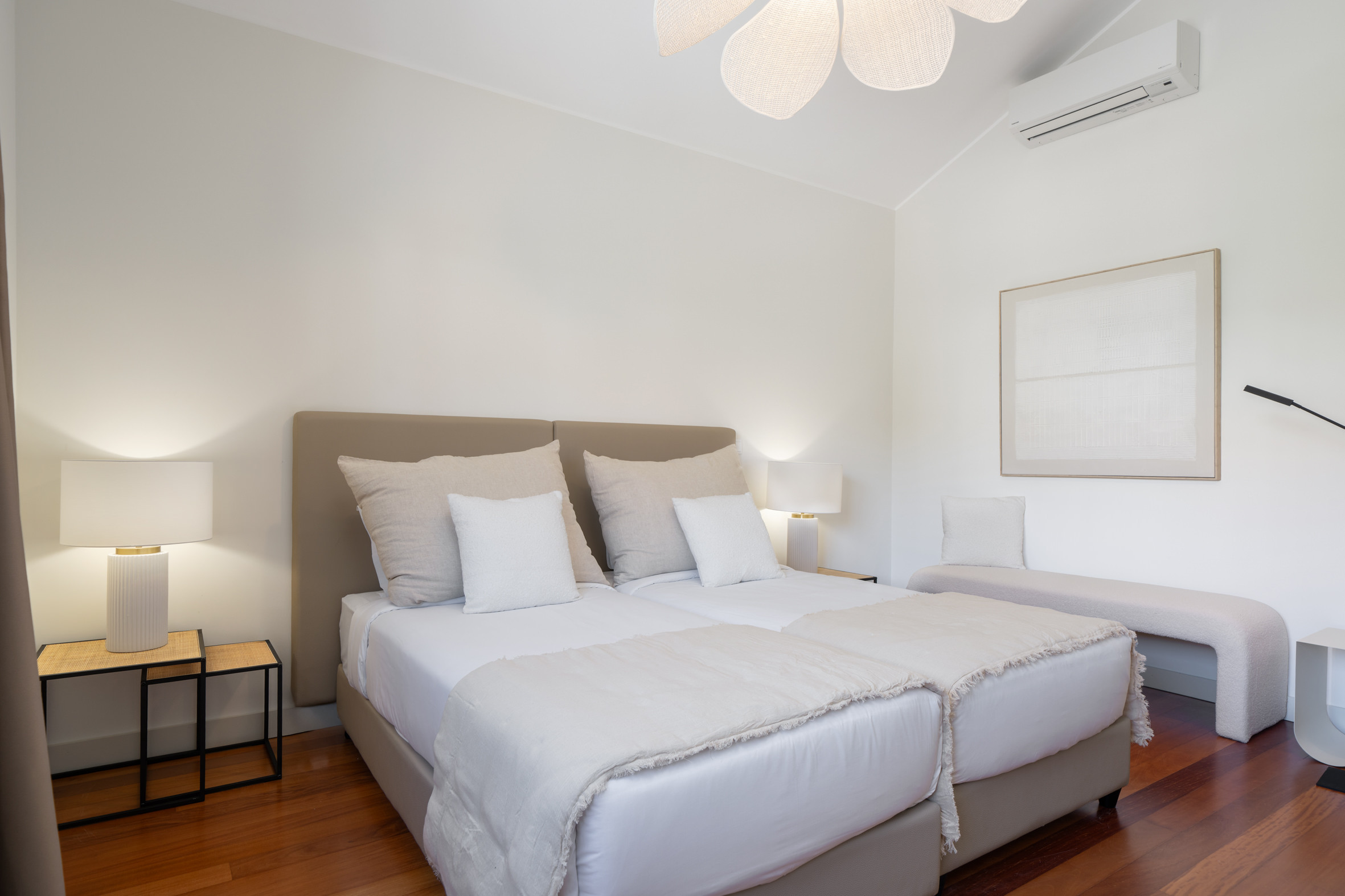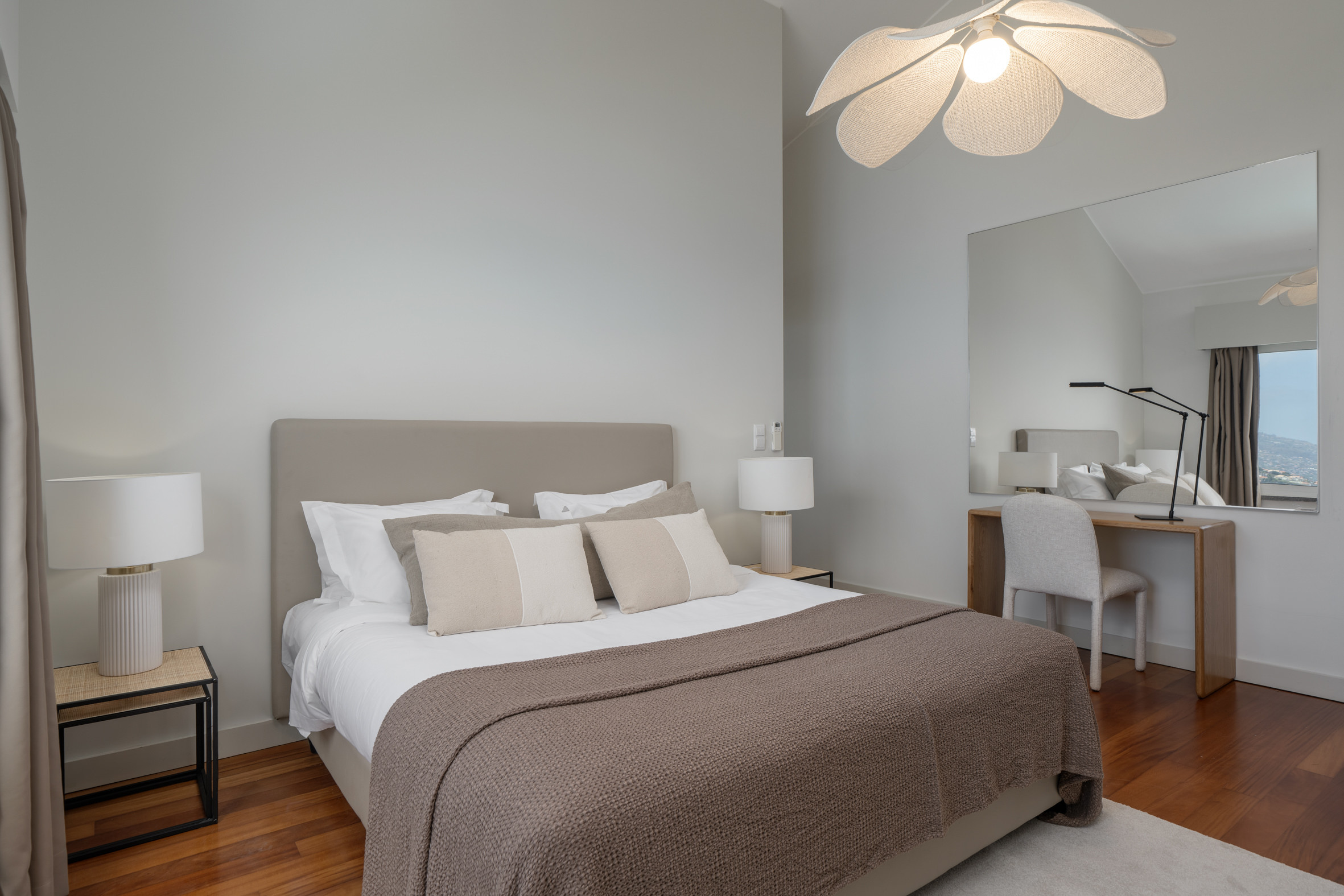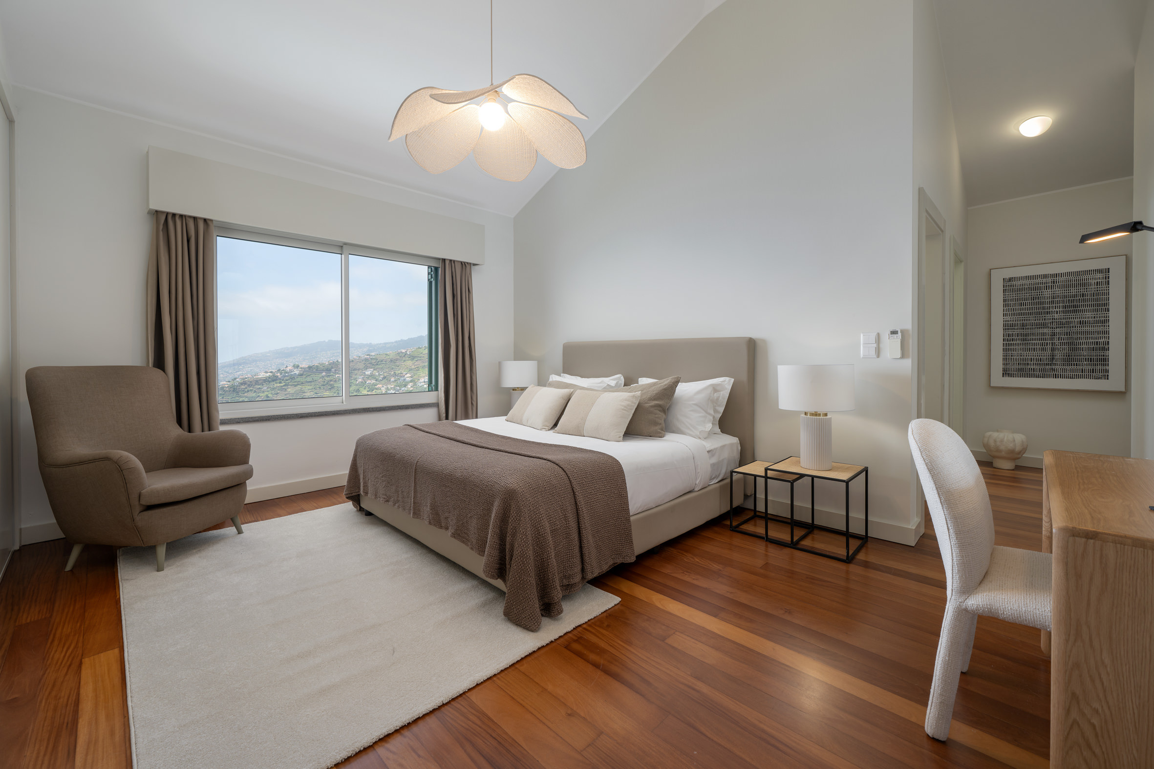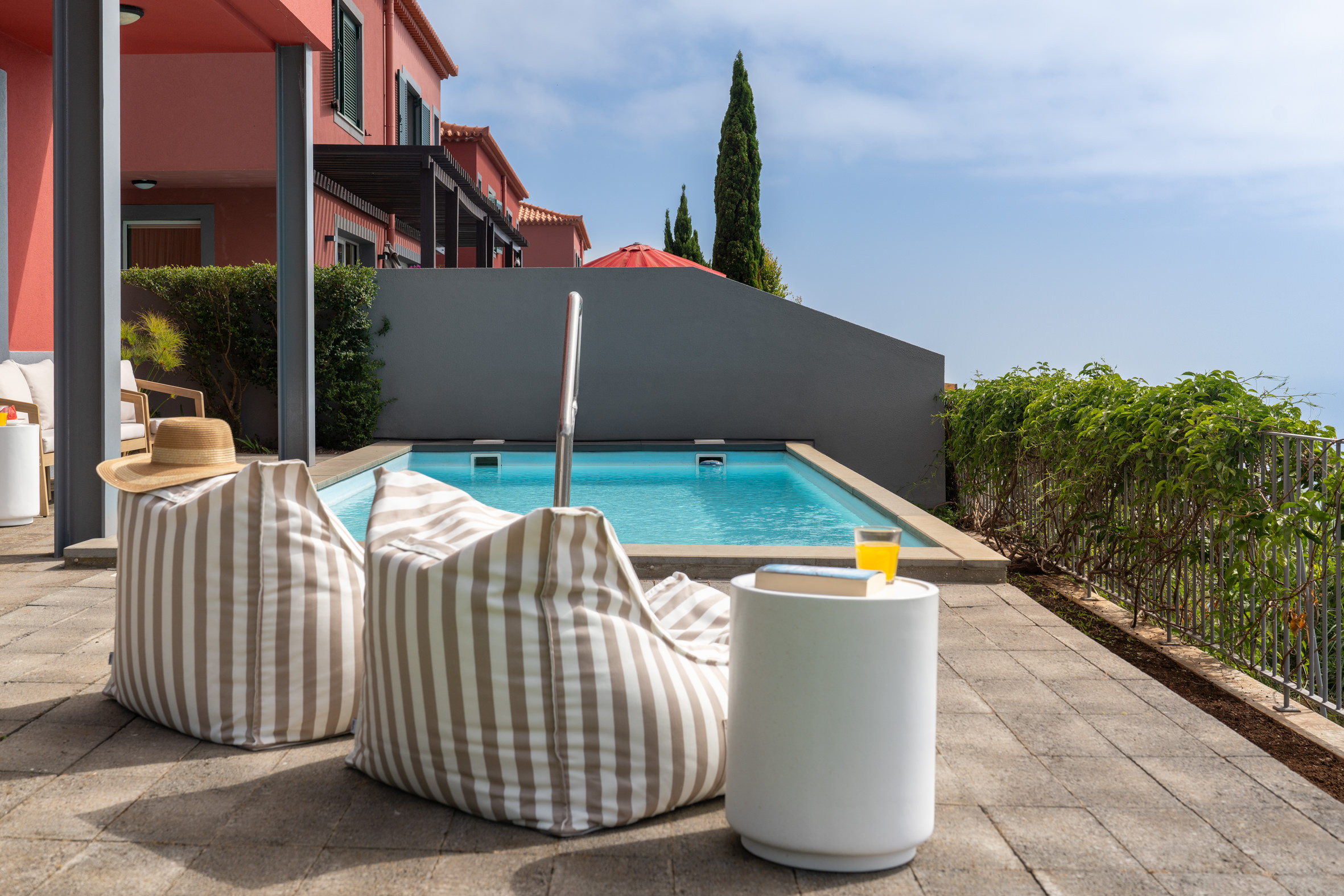 Surrounded by an open landscape of mountains and sea, the exterior was designed to celebrate Madeira's natural light. A private swimming pool sits at the heart of the outdoor area, offering a peaceful place to unwind while admiring the unobstructed views. Comfortable sun loungers and shaded sitting areas invite you to enjoy each hour of the day, from quiet mornings to golden afternoons. The barbecue area and covered dining space provide the perfect setting for alfresco meals shared with family or friends. The warm tones of the façade contrast beautifully with the surrounding greenery, creating a timeless connection between architecture and landscape. Whether watching the sunset from the terrace or gazing at the stars reflected on the water, every moment outdoors feels calm, unhurried, and in perfect balance with nature.