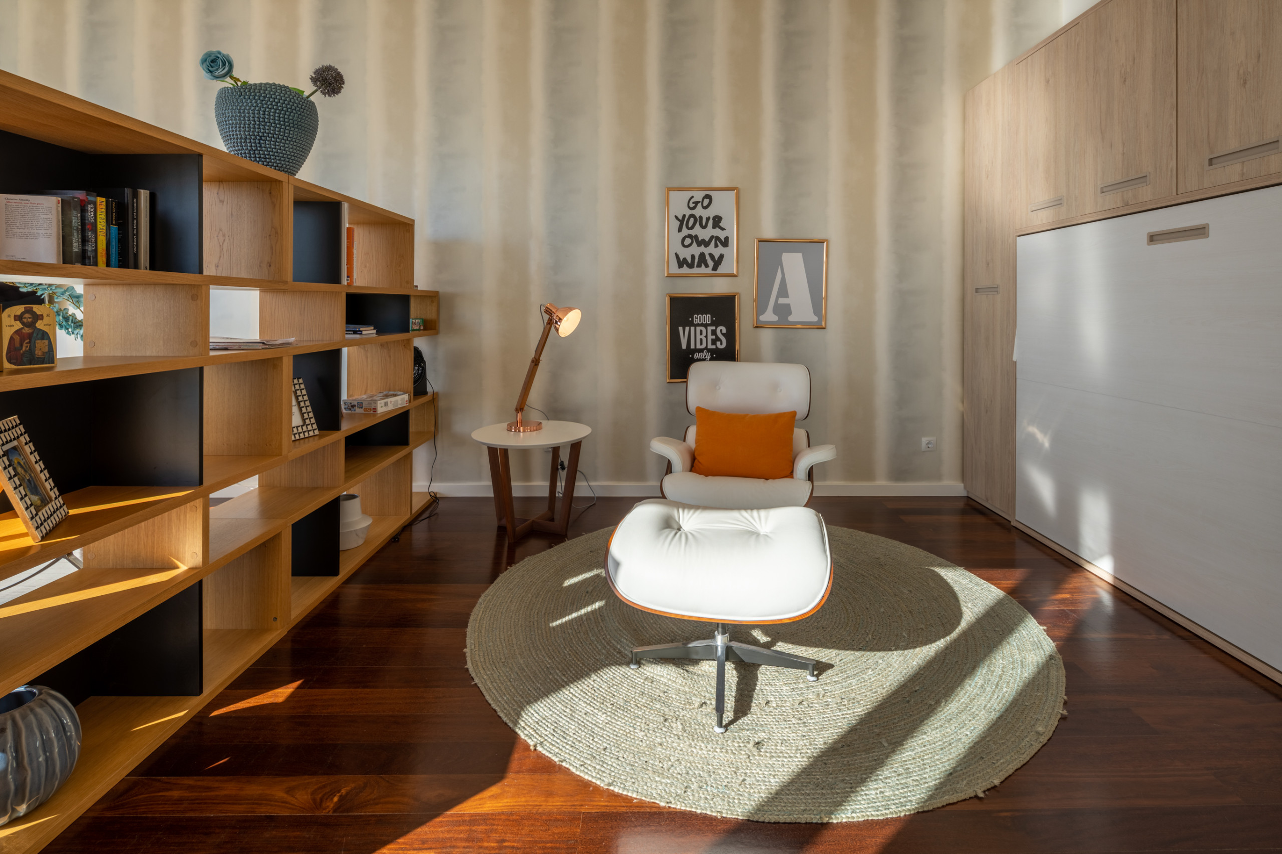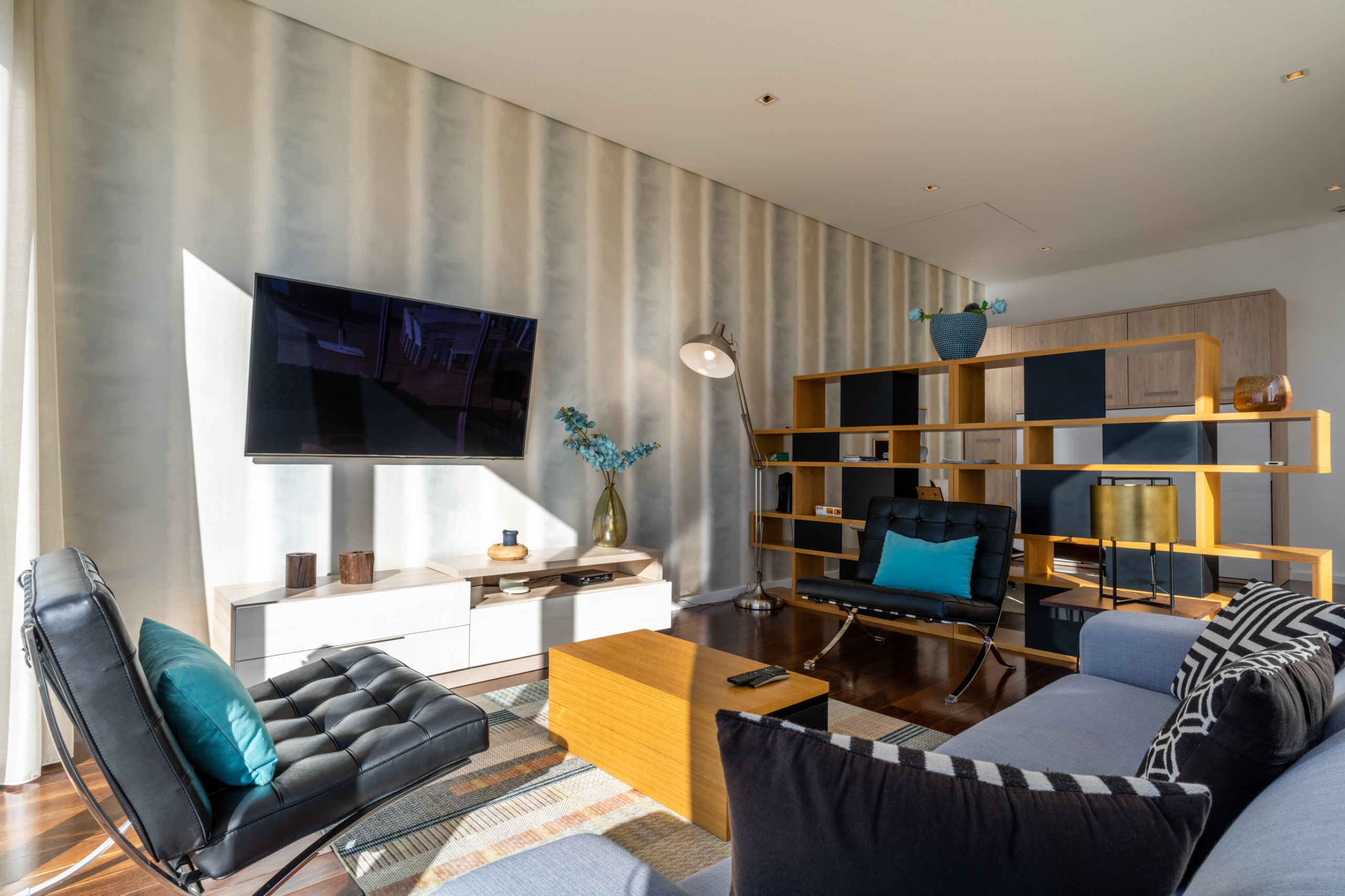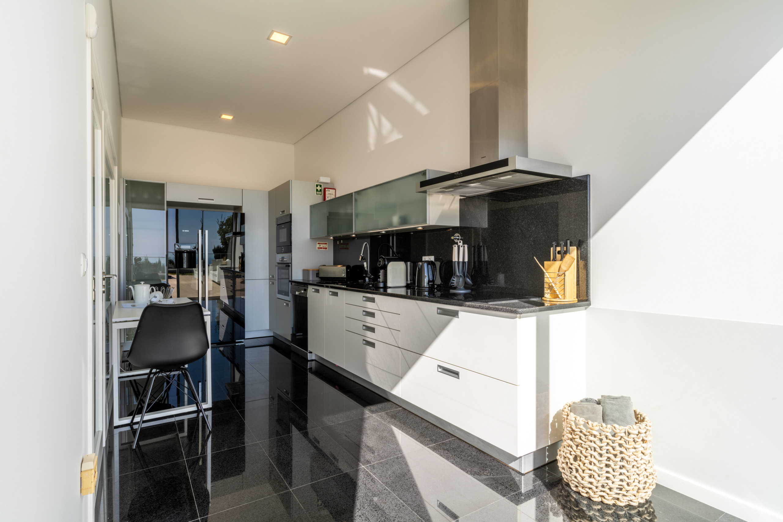 Inside, the home unfolds over three well-planned bedrooms and three bathrooms, offering space and privacy for up to eight guests. Each bedroom is designed for restful nights, with comfortable beds and a soothing, uncluttered style. The bright living room feels instantly welcoming, with large windows, cosy seating and direct access to the outdoors. A fully equipped kitchen with modern appliances makes it easy to prepare meals at home, while family-friendly touches, such as baby amenities available on request, ensure a seamless stay.
