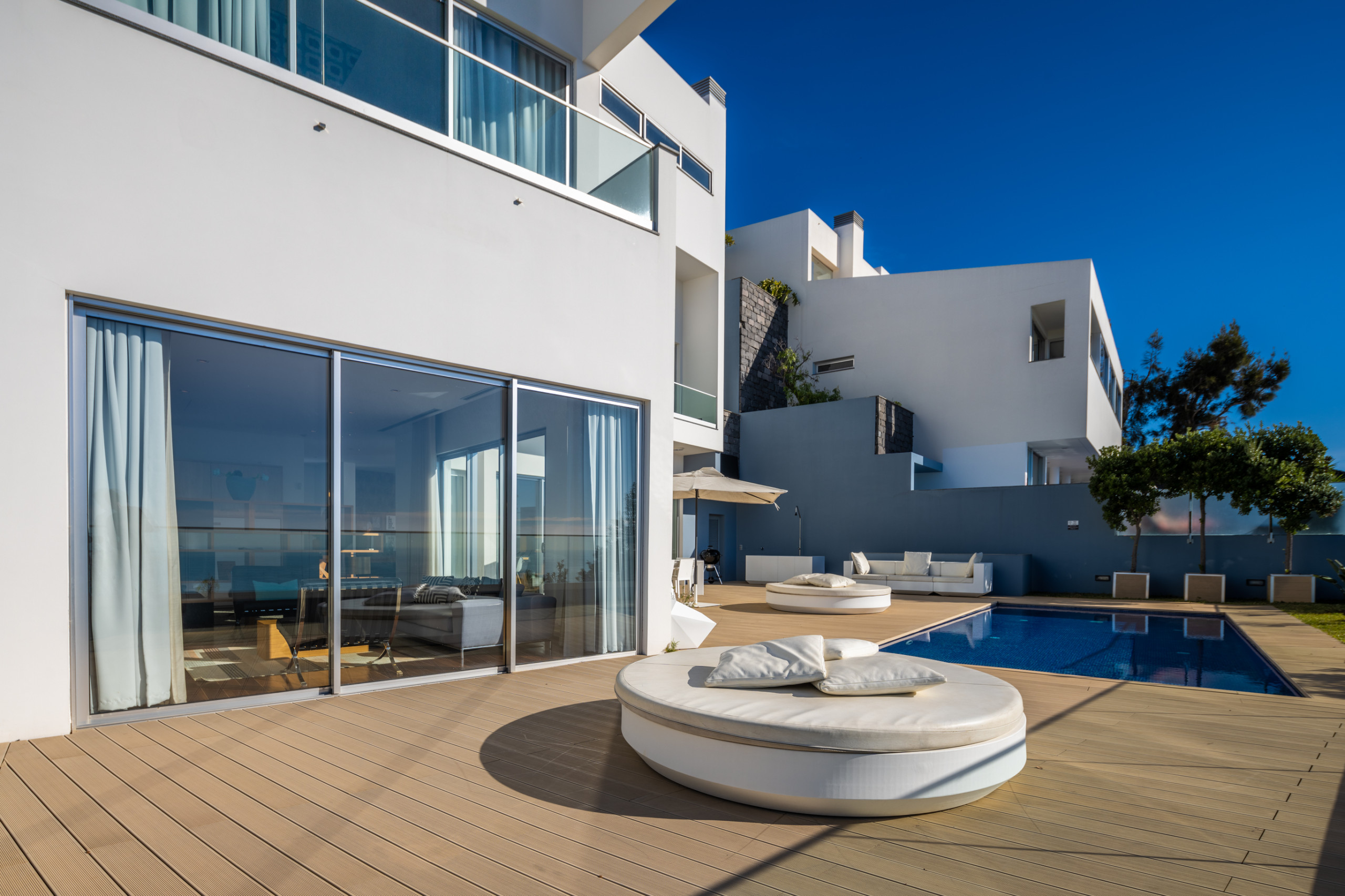The private outdoor area is where days easily stretch out, with a swimming pool that can be heated on request. Heating must be arranged at least four days in advance and requires a minimum booking of seven consecutive days. Sun loungers invite slow afternoons, and the terrace is perfectly arranged for alfresco dining. Surrounded by ocean views and the gentle presence of nature, it is an ideal setting for refreshing morning dips, lazy poolside moments and evenings gathered under the open sky.