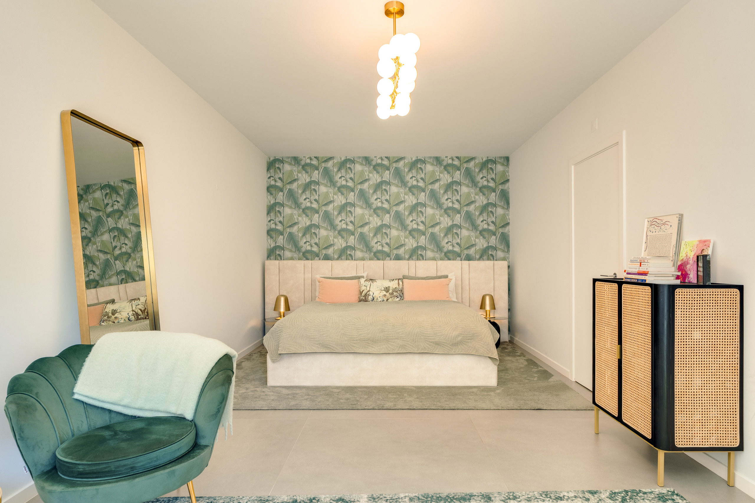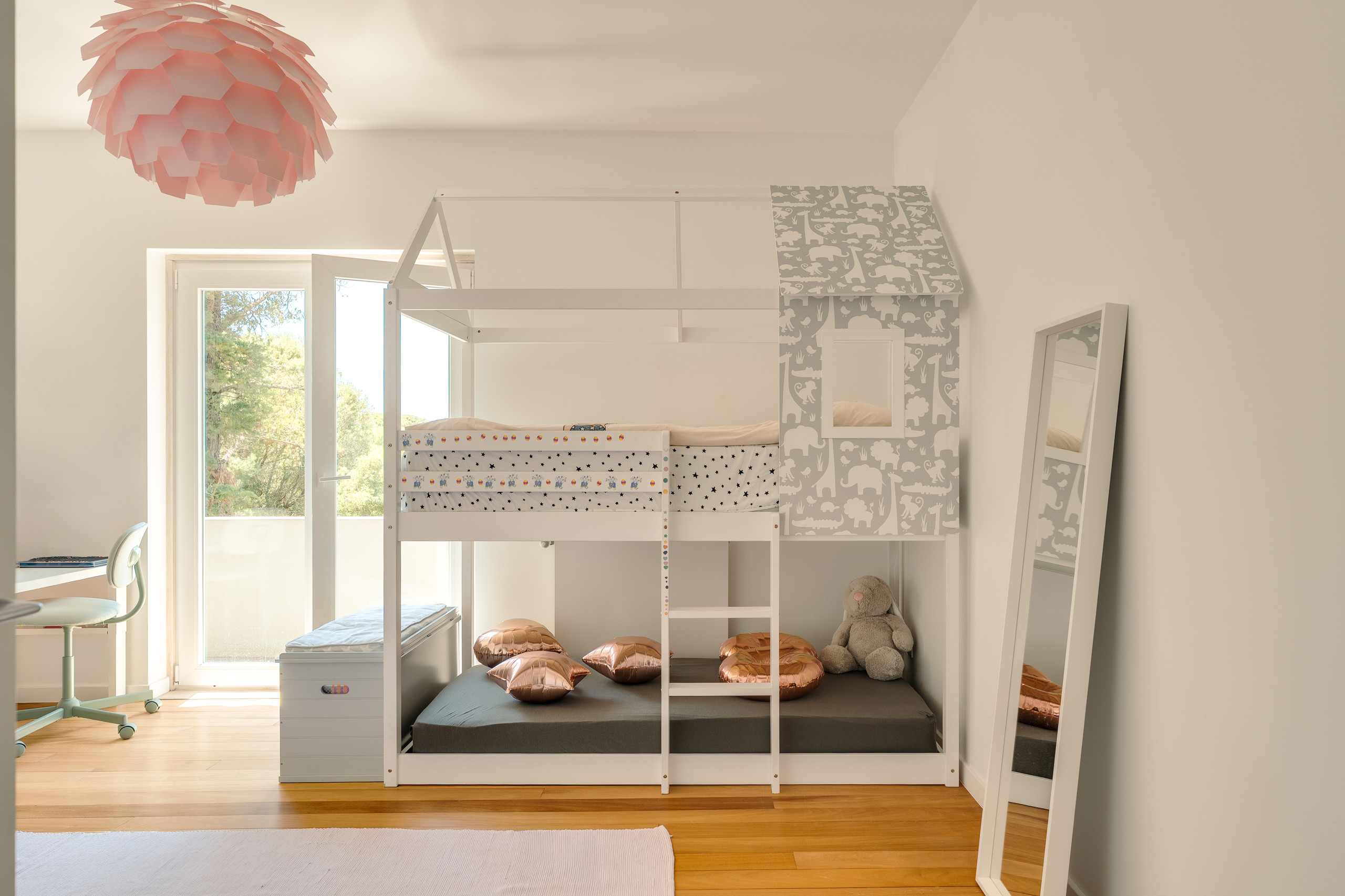 Inside, the villa unfolds across 400 sqm of beautifully curated space. The main living area is open, inviting, and bathed in sunlight, with a spacious lounge, dining table for ten, and seamless connection to the fully equipped kitchen. A master suite with dressing room and en-suite, plus a guest WC and laundry room, complete the ground floor. Upstairs, two serene double bedrooms with en-suite bathrooms open onto private balconies, alongside two playful bunk rooms for younger guests, a shared bathroom, and a sunlit workspace that flows out to a generous terrace. On the lower level, the wellness and kids’ zone features a fully equipped gym, indoor playroom, TV lounge, infrared sauna, and additional sleeping space, ideal for families travelling with children or staff. Guests enjoy high-speed internet, two smart TVs, plus towels and linens, SMEG laundry appliances, and a pantry ready to welcome you.