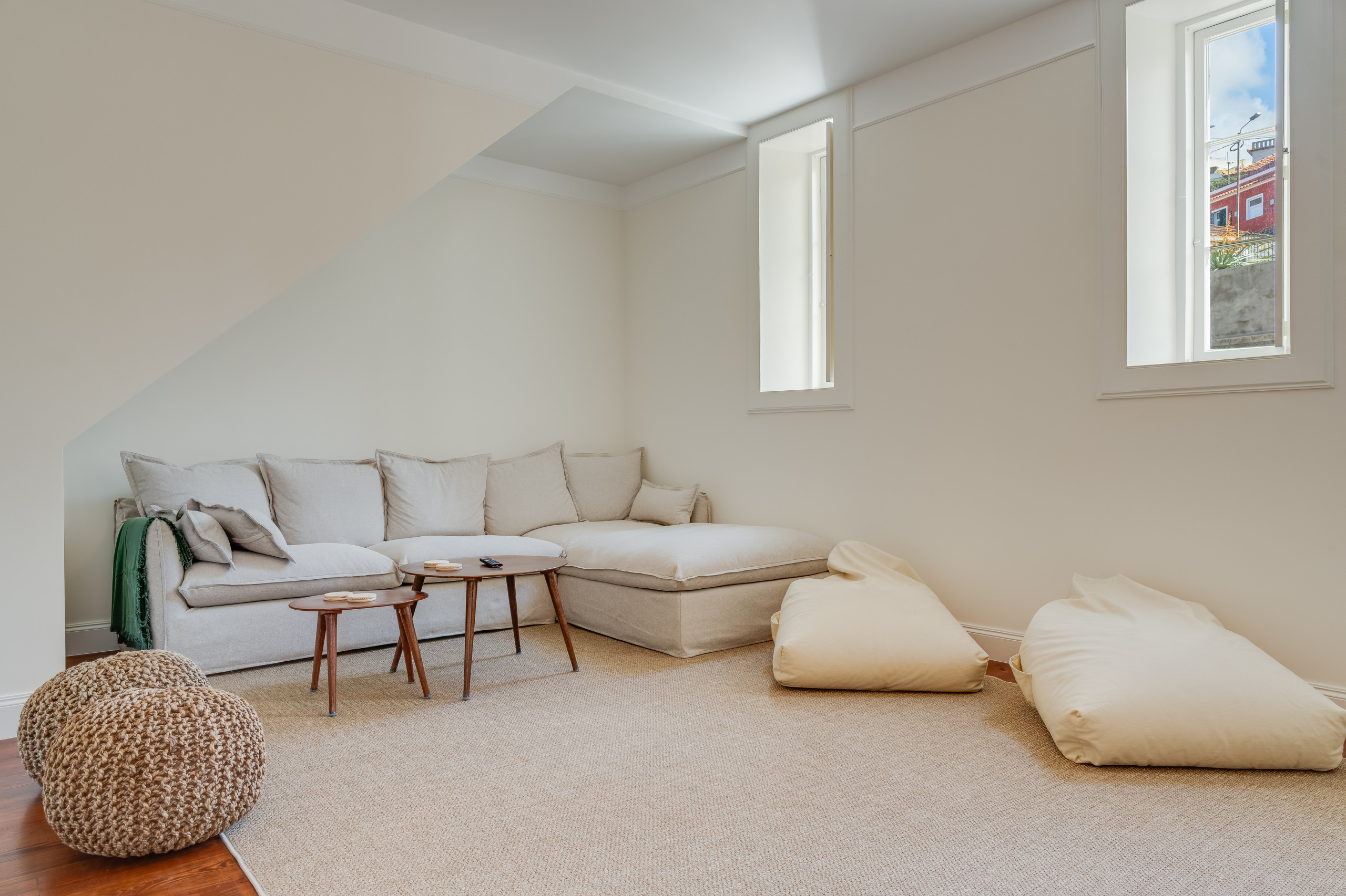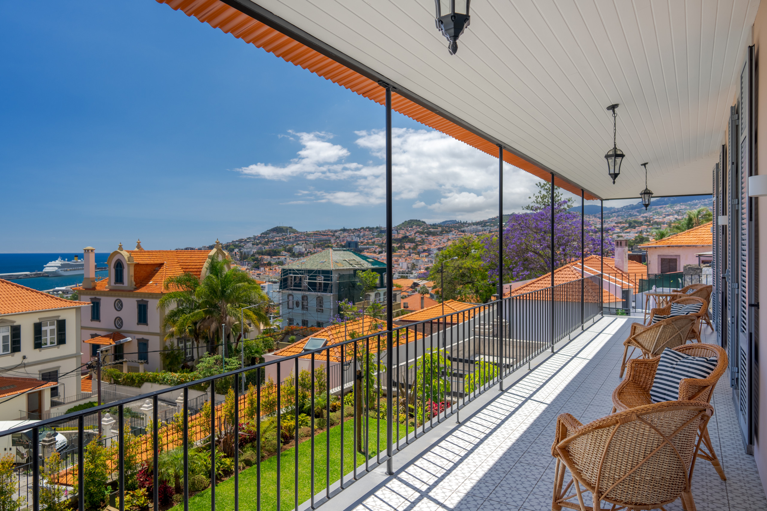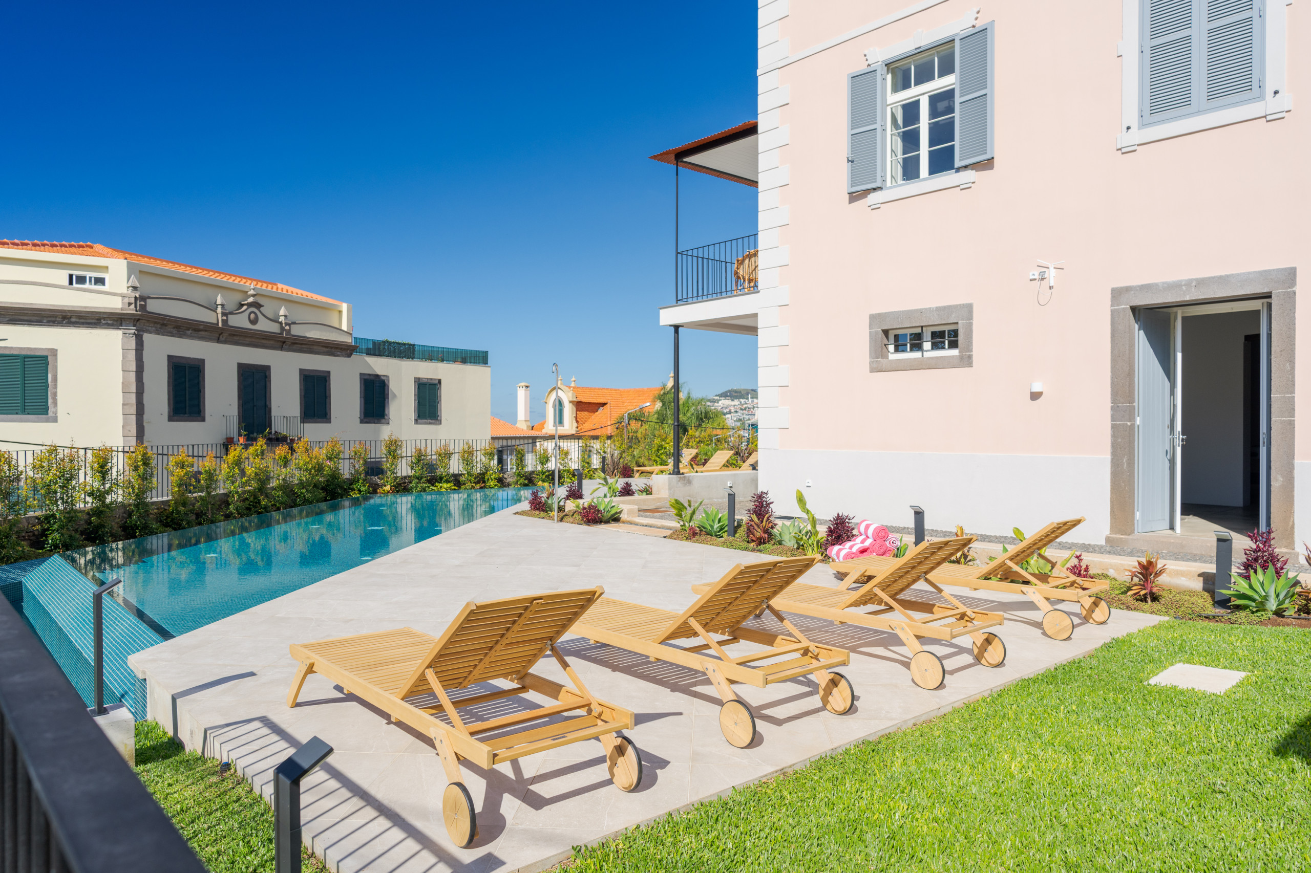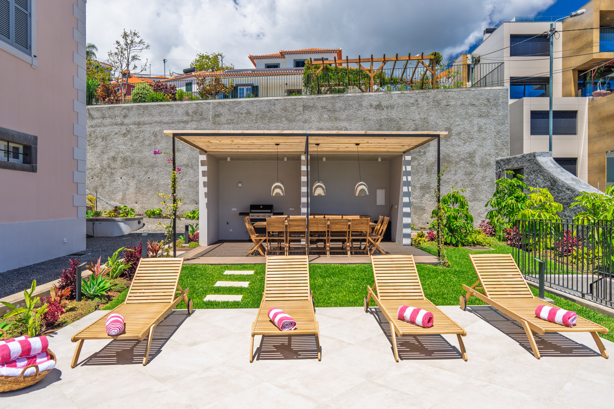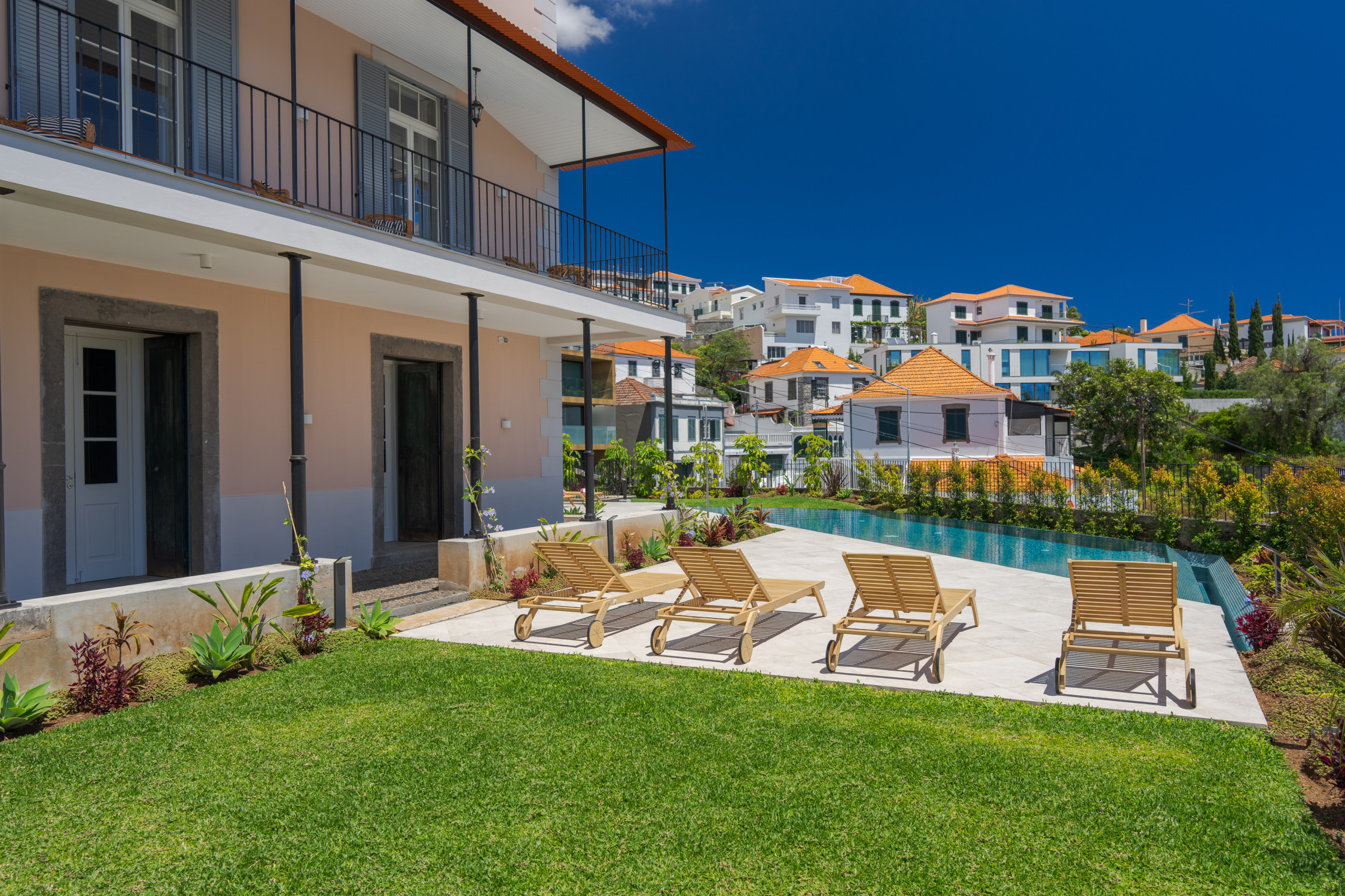 Surrounded by jasmine, bougainvillea and birds-of-paradise, the villa's gardens offer a peaceful oasis overlooking the city below. At the heart of the outdoor space is a saltwater swimming pool, bordered by sun loungers and a terrace designed for long afternoons in the Madeiran sun. A shaded dining area with barbecue provides an idyllic setting for alfresco meals, from relaxed family lunches to candlelit evenings with views stretching over the bay. Pool heating is available on request, and the garden's different terraces allow guests to enjoy both sun-filled corners and quiet shaded retreats throughout the day.