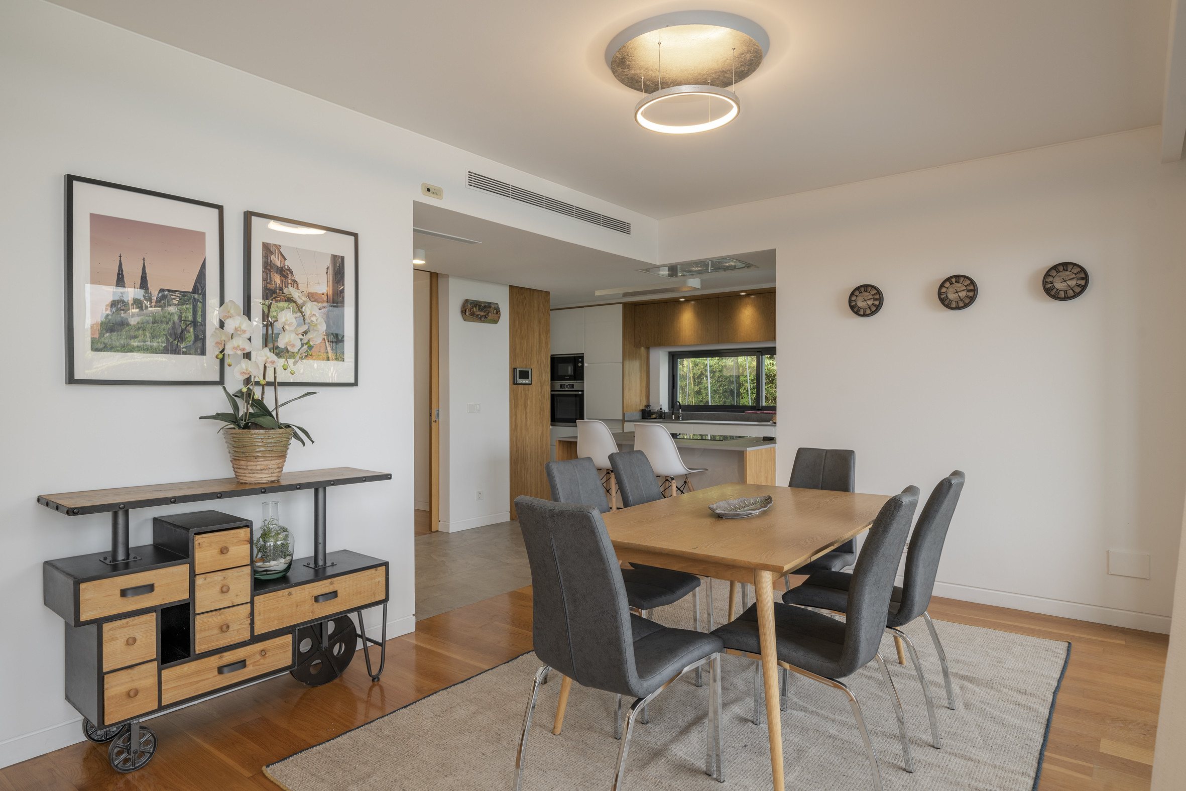 Inside, the villa offers generous spaces bathed in sunlight from the large glass windows that frame the exterior garden and pool. The open plan living and dining room exudes comfort, featuring soft furnishings, warm wooden floors, and elegant decor. The fully equipped kitchen blends modern appliances with natural finishes, providing direct access to the outdoor area for effortless dining and entertainment. The property includes three bedrooms: two with king-size beds and one with two single beds, each with air conditioning and private bathrooms. The bathrooms are stylishly designed, with one featuring a bathtub and two with walk-in showers. A social bathroom and a dedicated workspace offer additional convenience, while a charming nook for children ensures the little ones feel just as at home.