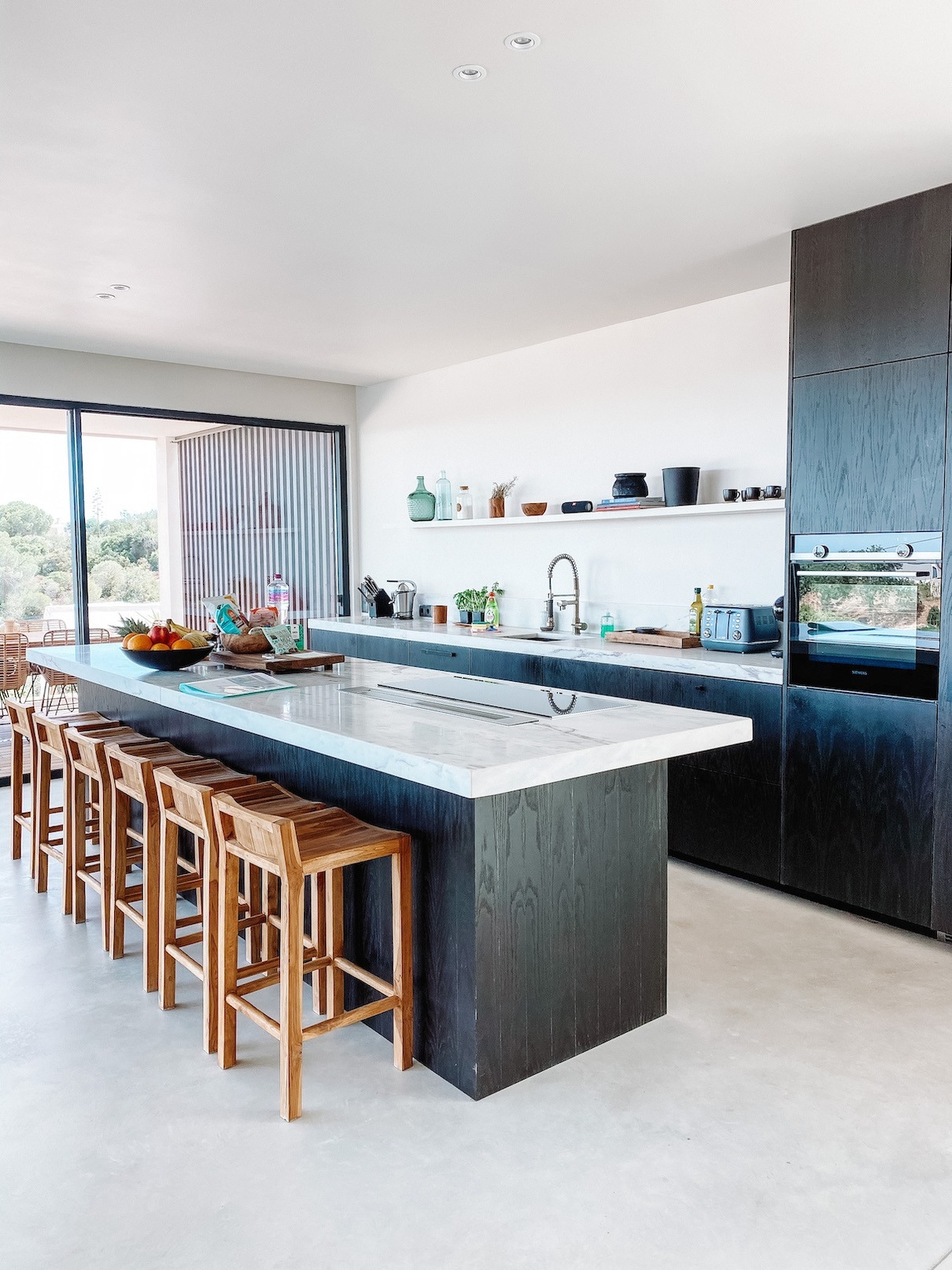Indoor and outdoor living become one. The fully equipped kitchen with its large cooking island and inviting bar stools look onto the rural surroundings and offers magnificent views over the ocean. Lounge beds and beanbags around the pool are ideal to relax, or just hang out and enjoy holidays in the sun.
