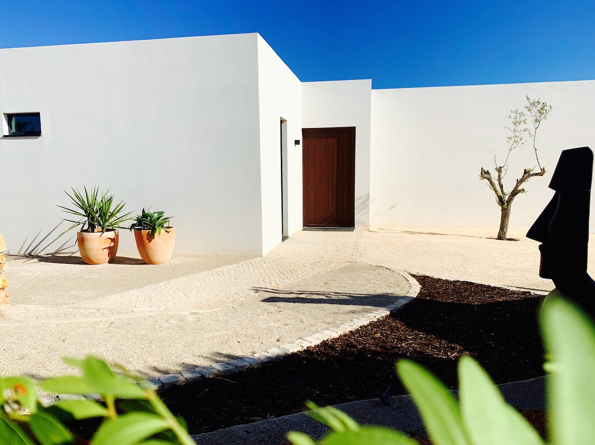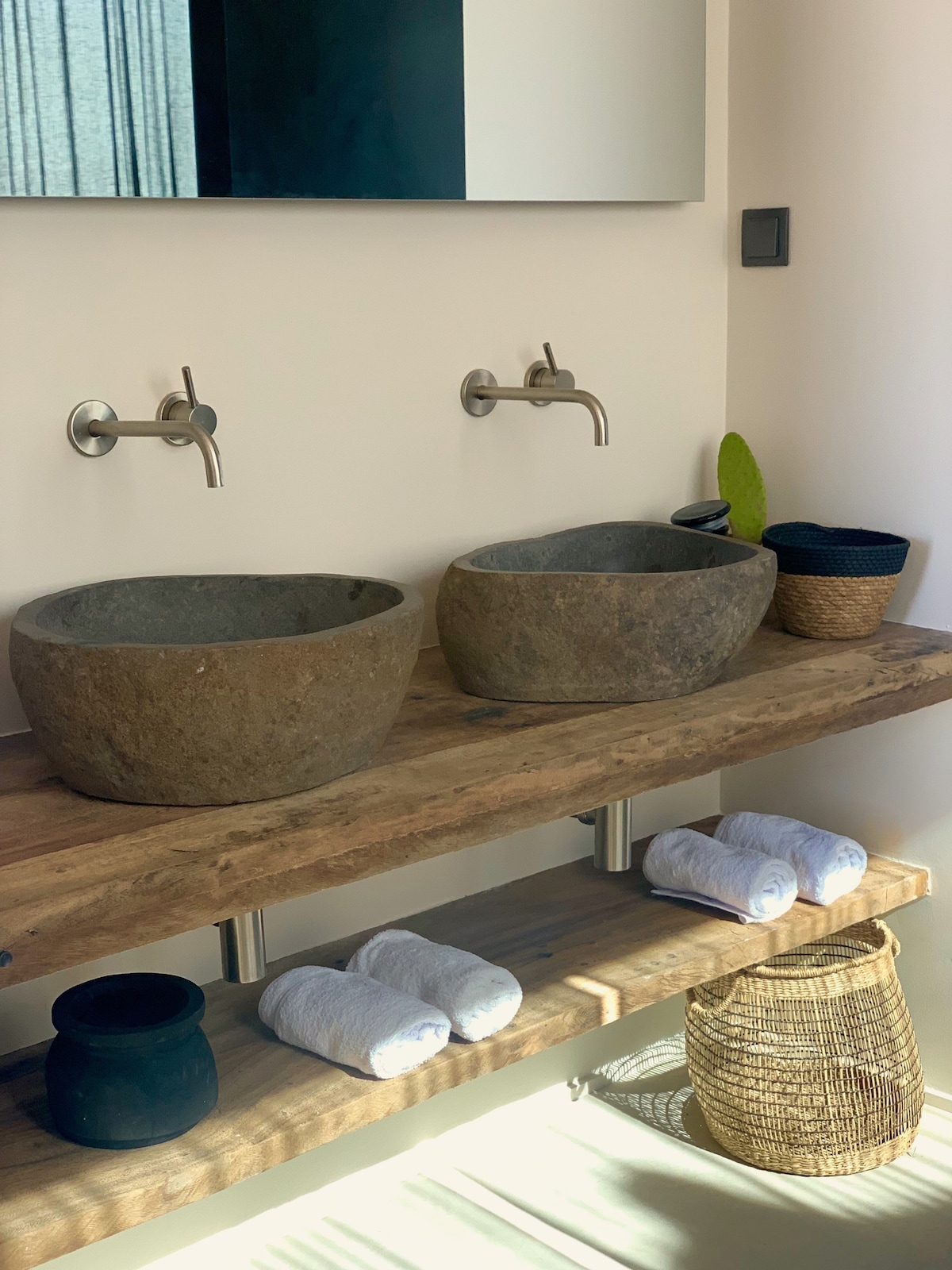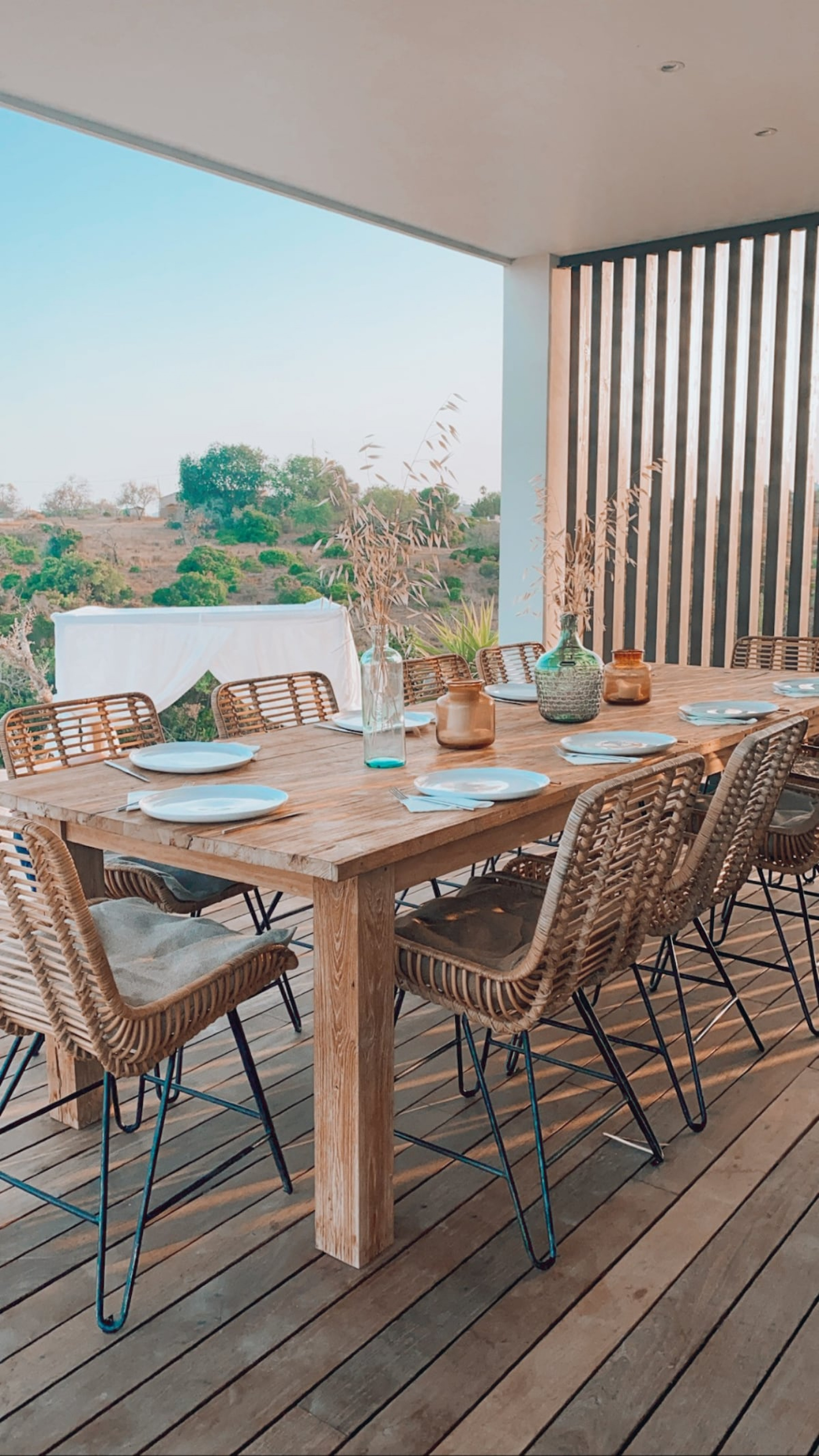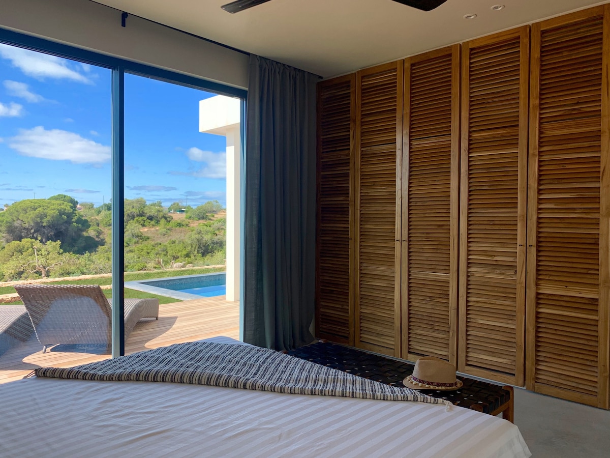 By the use of natural materials such as wood, natural stone and concrete floors (heated in winter) the villa breathes an understated luxury. The furniture and wardrobes are handmade of recycled wood and create an eco-chic design. The white marble kitchen top comes from the Alentejo. Plates and dishes were locally sourced and made by Portuguese craftsmen.