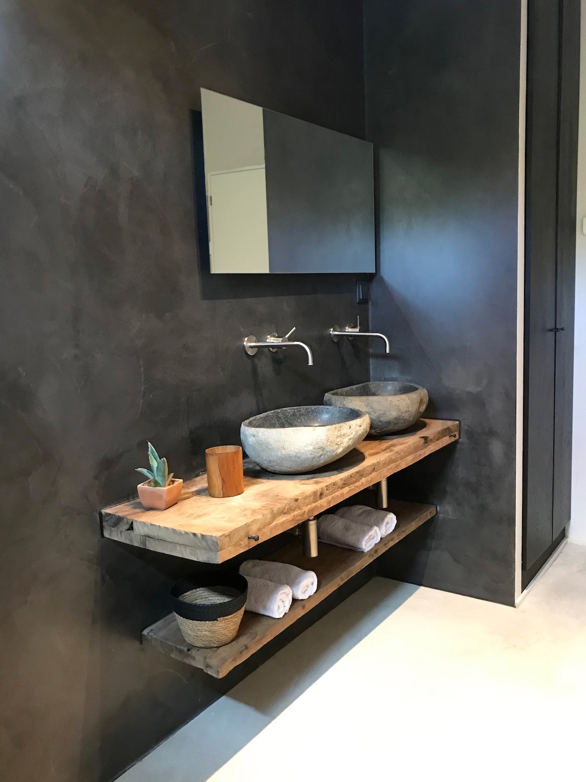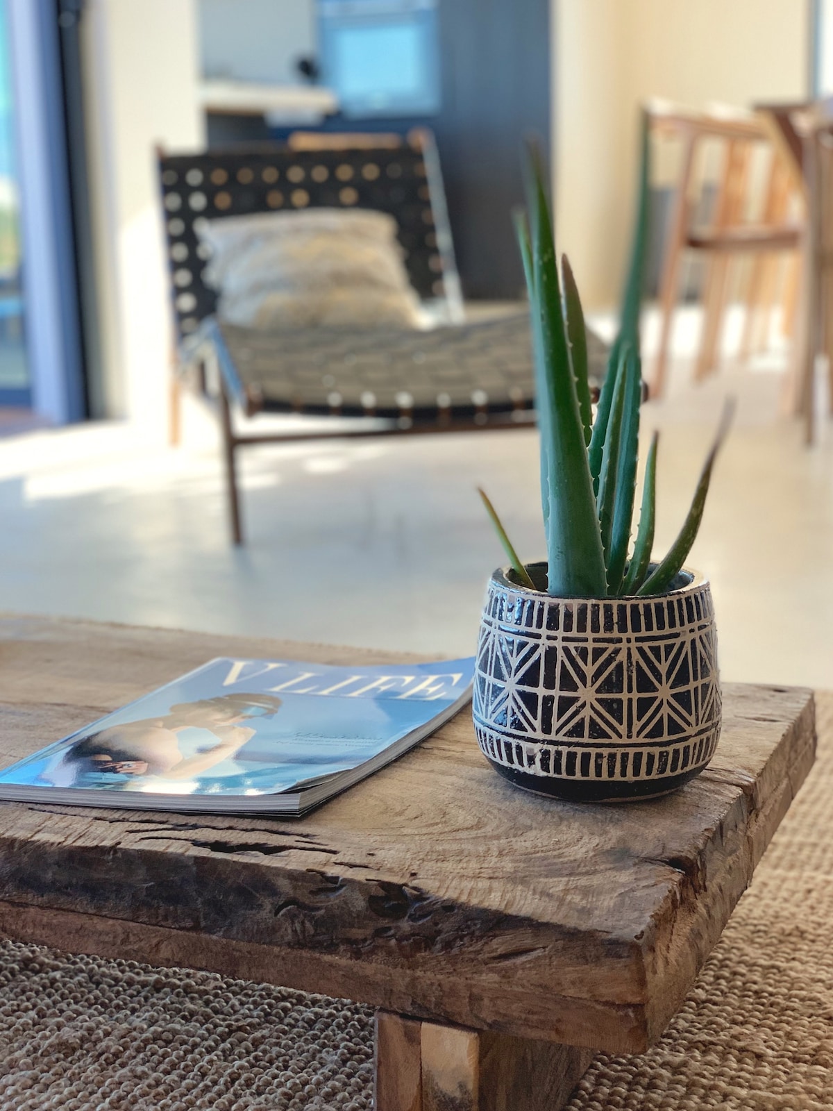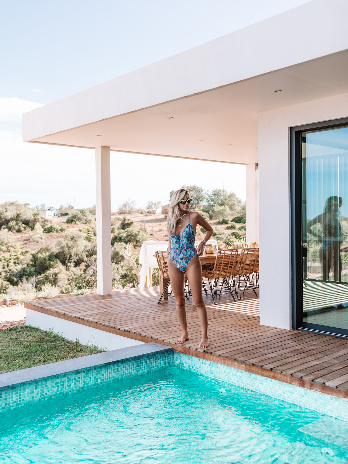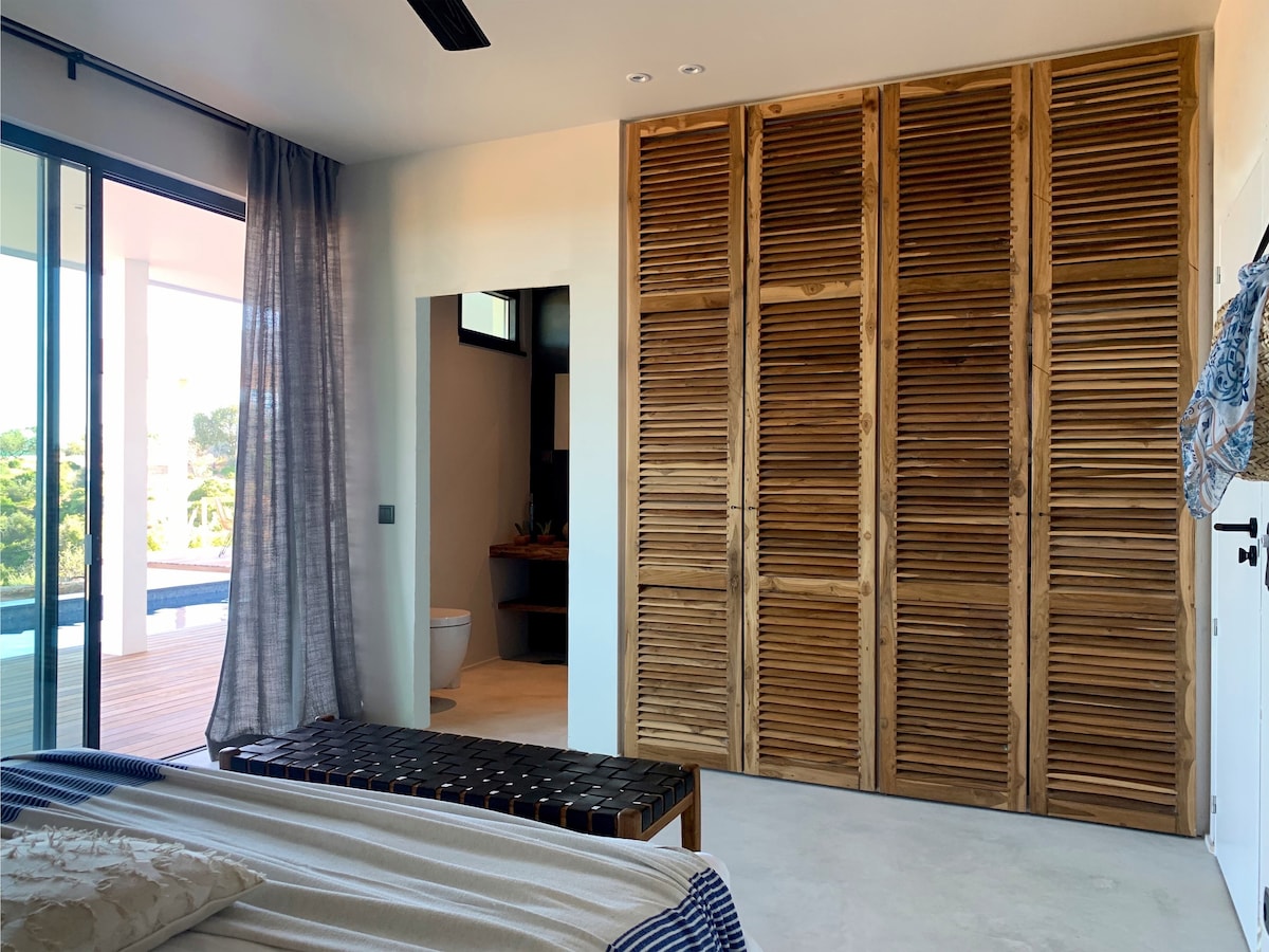By the use of natural materials such as wood, natural stone and concrete floors (heated in winter) the villa breathes an understated luxury. The furniture and wardrobes are handmade of recycled wood and create an eco-chic design. The white marble kitchen top comes from the Alentejo. Plates and dishes were locally sourced and made by Portuguese craftsmen.