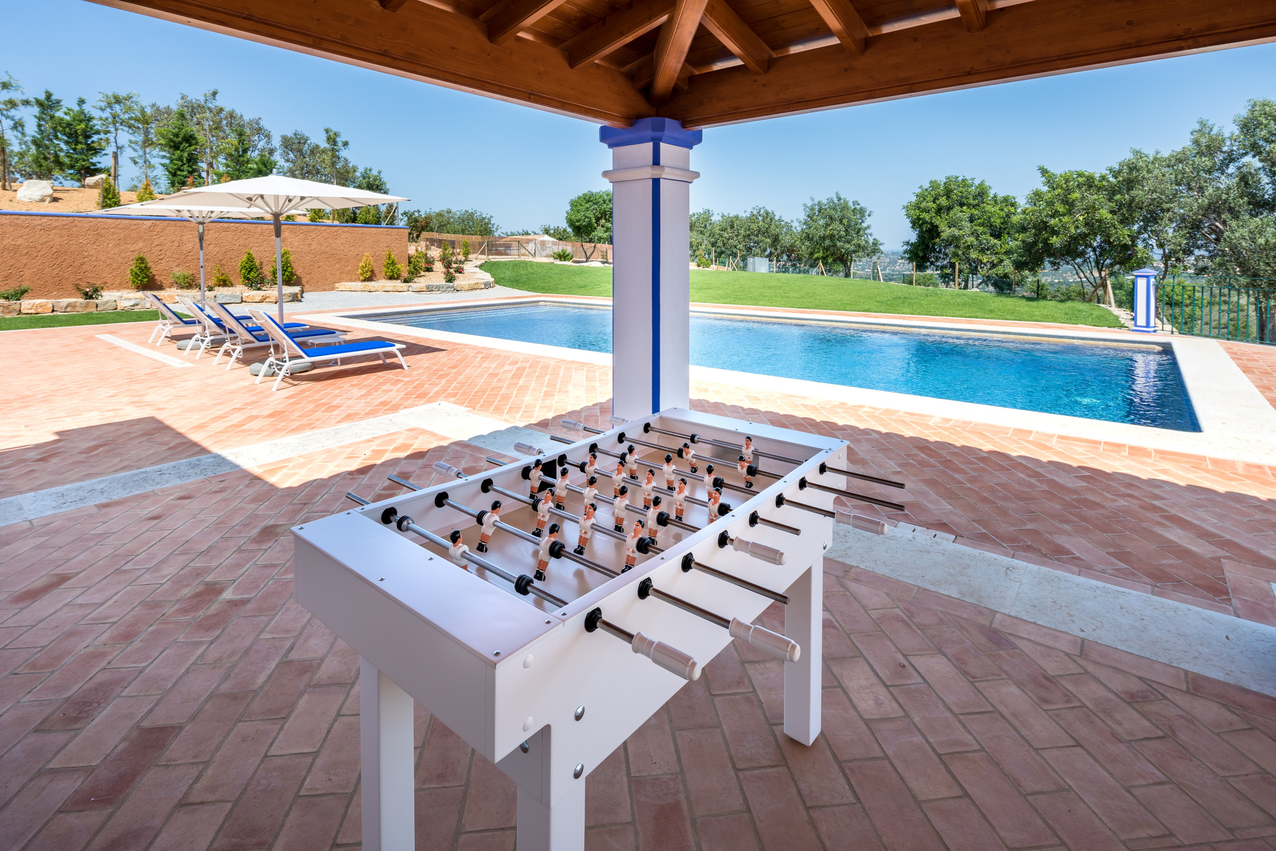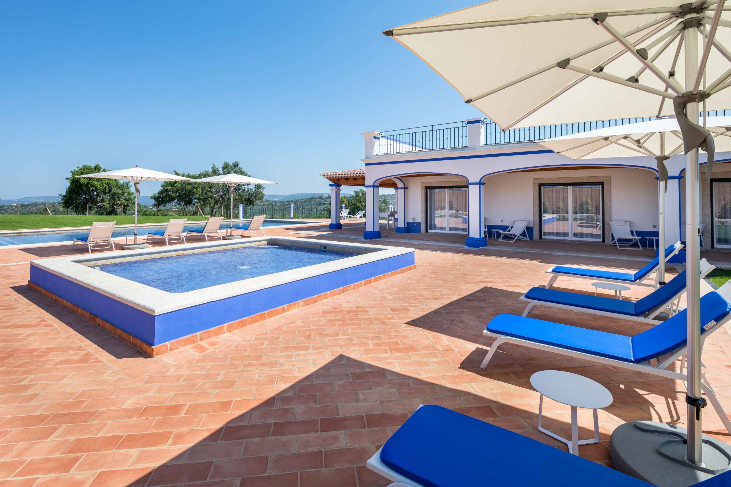 Expansive terraces extend towards open countryside views, framing a private pool bordered by comfortable loungers and shaded corners that invite uninterrupted relaxation. A second pool offers a safe and welcoming area for younger guests. The outdoor dining terrace creates the perfect setting for al fresco meals, supported by a built-in barbecue and fully furnished seating areas. Manicured green spaces, mature plantings and natural stone accents enhance the sense of tranquility, while balconies and terraces provide additional viewpoints to enjoy the Algarve’s golden light.