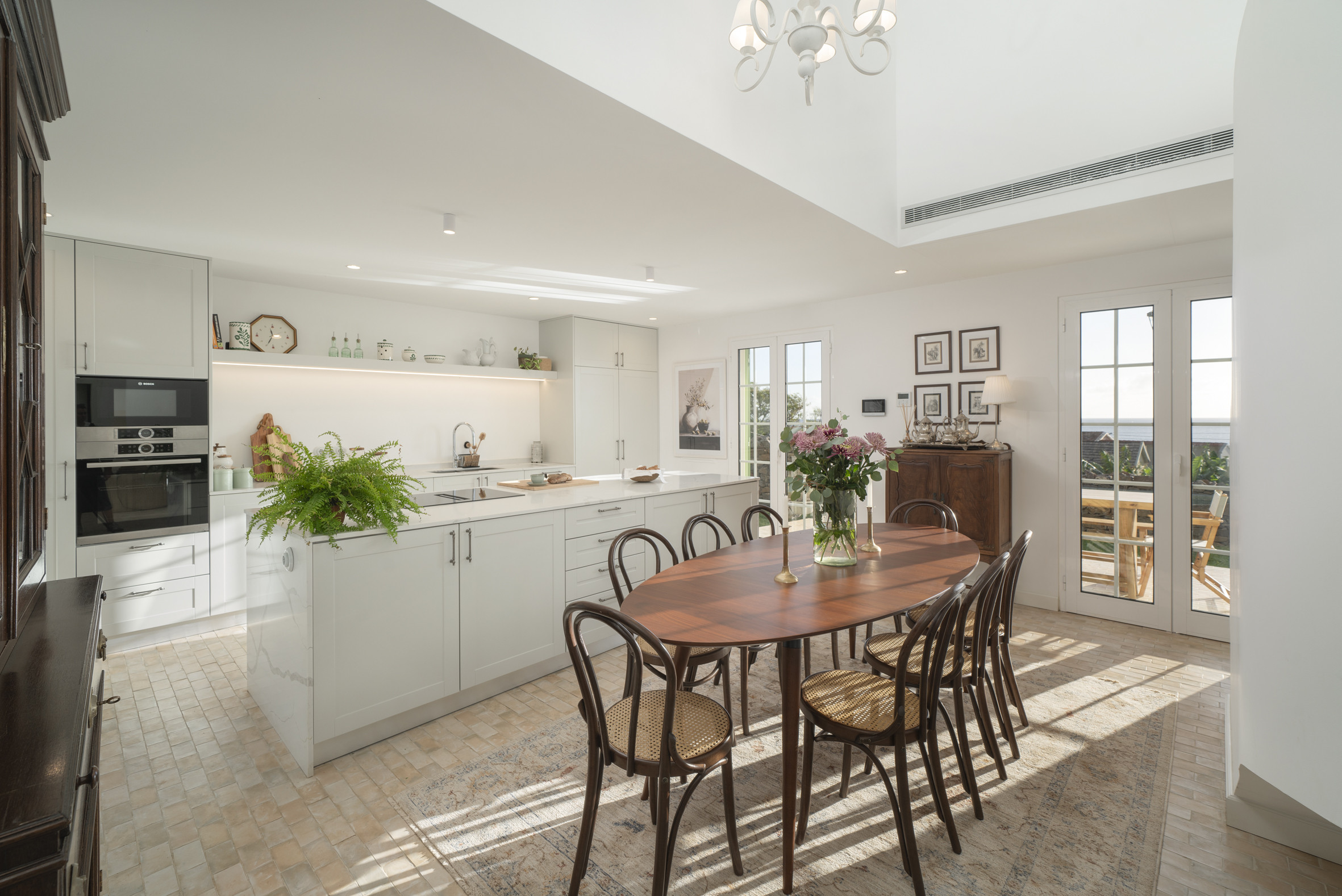 The home has been thoughtfully rebuilt upon century-old stone foundations, preserving the spirit of its nineteenth-century origins while embracing modern design. The interiors are warm, luminous and carefully curated, with gentle tones, organic materials and handcrafted details that give each room a sense of calm and continuity. The open living space invites relaxation through a plush sofa and textured seating, flowing naturally into a dining area shaped by heritage accents and morning light. A fully equipped kitchen blends Madeiran craftsmanship with contemporary practicality, featuring patterned tiles, smooth cabinetry and all essential appliances for an inspiring culinary experience. Three elegant bedrooms, each with a king-size bed, offer restful comfort framed by soft linens and natural views, while the four beautifully finished bathrooms provide a soothing, spa-like atmosphere with refined materials and walk-in showers. Every element has been designed to feel personal, timeless and quietly luxurious.