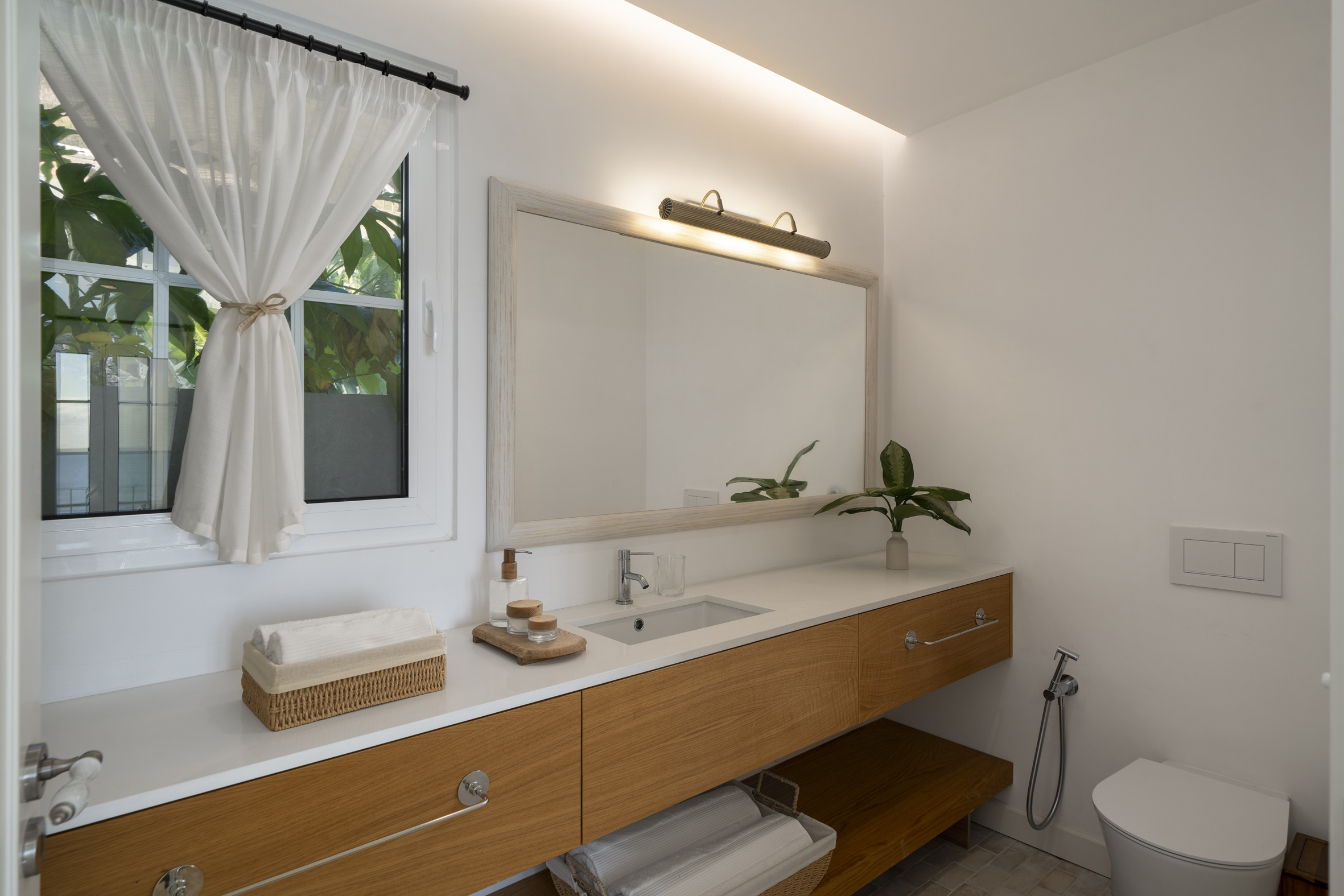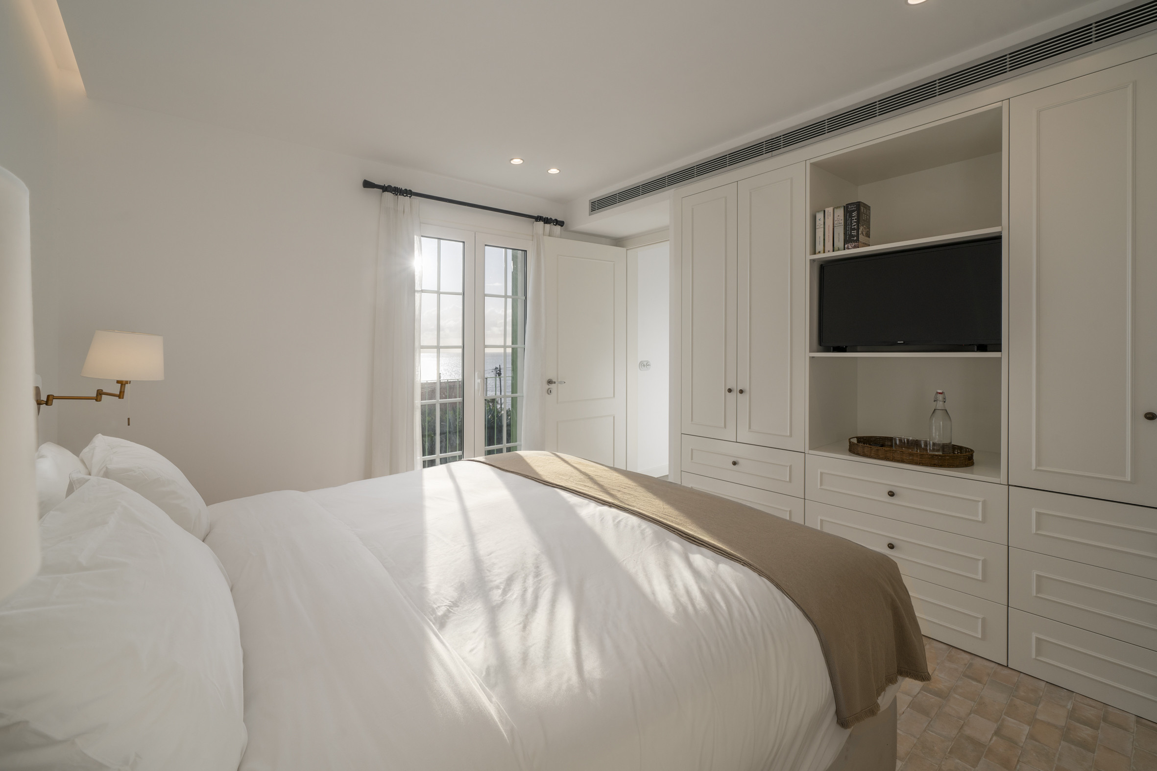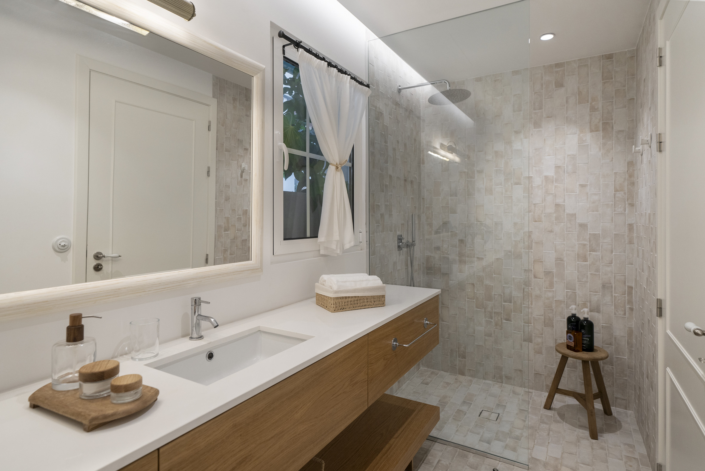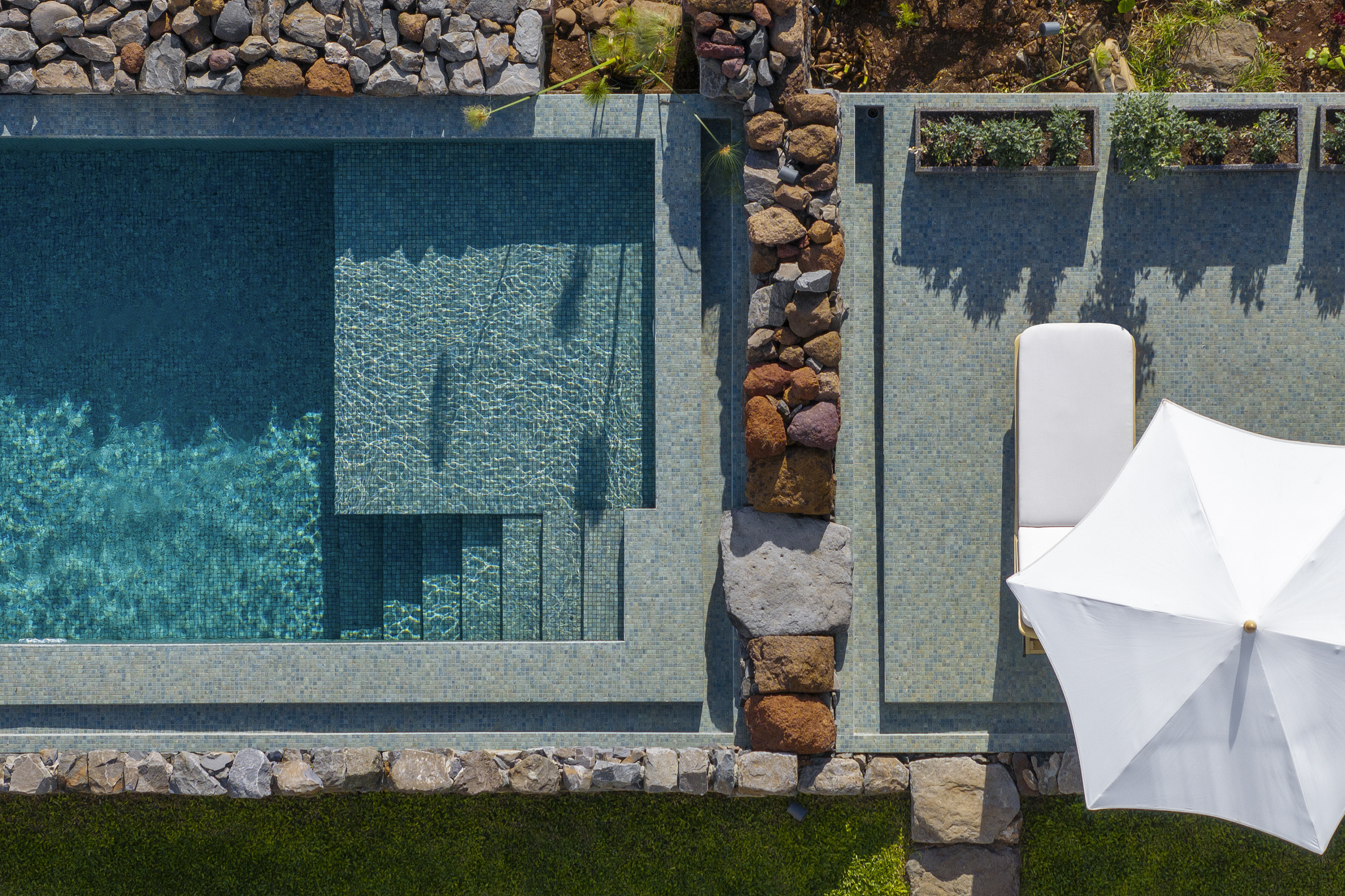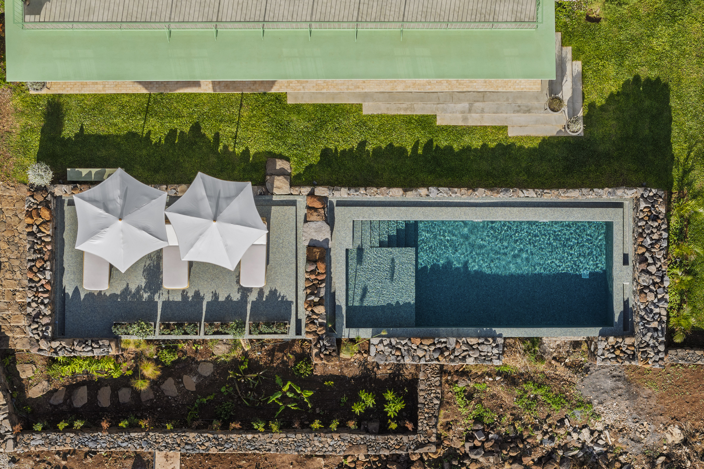 The gardens form a private world of greenery, scent and tranquillity, where fruit trees, flowering plants and restored stone walls honour the home’s historic roots. A shimmering pool welcomes refreshing swims beneath the island light, bordered by sun loungers, shaded seating and open views that shift beautifully throughout the day. Paths weave between terraces, leading to quiet corners ideal for reading, contemplation or enjoying the ocean breeze. A wooden pergola creates the perfect space for alfresco dining, while the garden suite and solarium incorporate original stone elements that preserve the essence of the property’s past. Designed for slow living, every outdoor space invites connection with nature and celebrates the harmony between architecture and landscape.