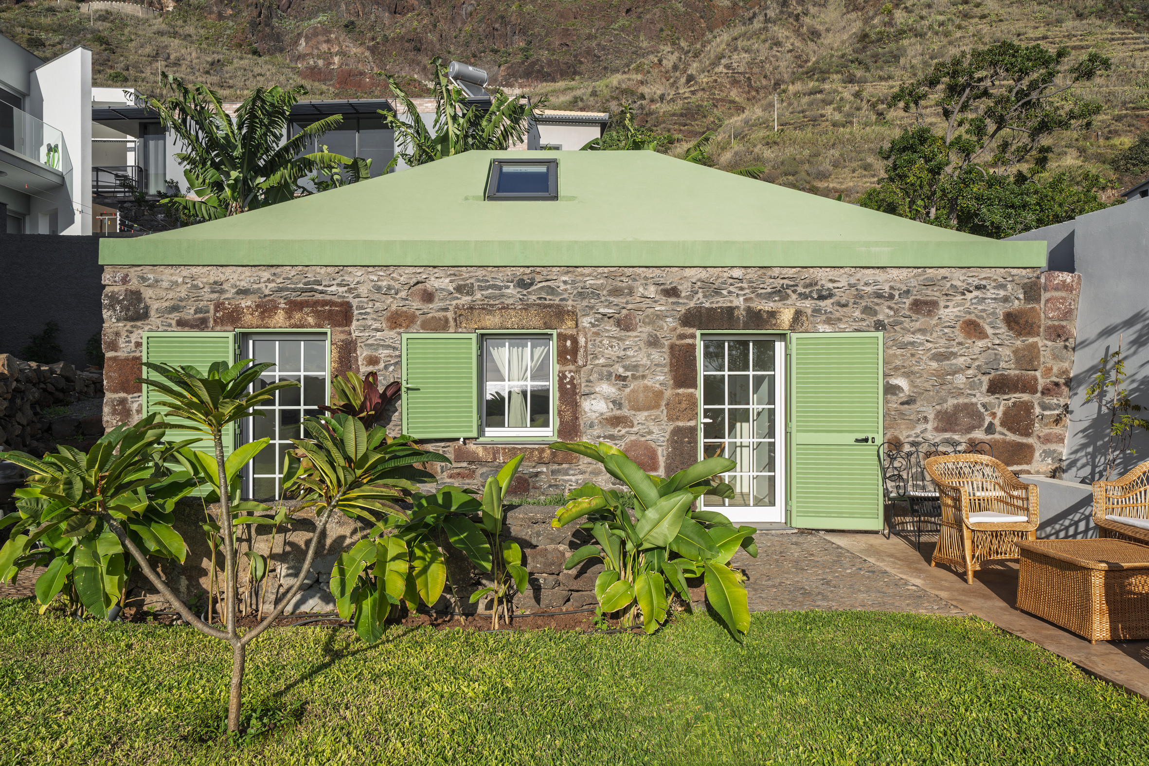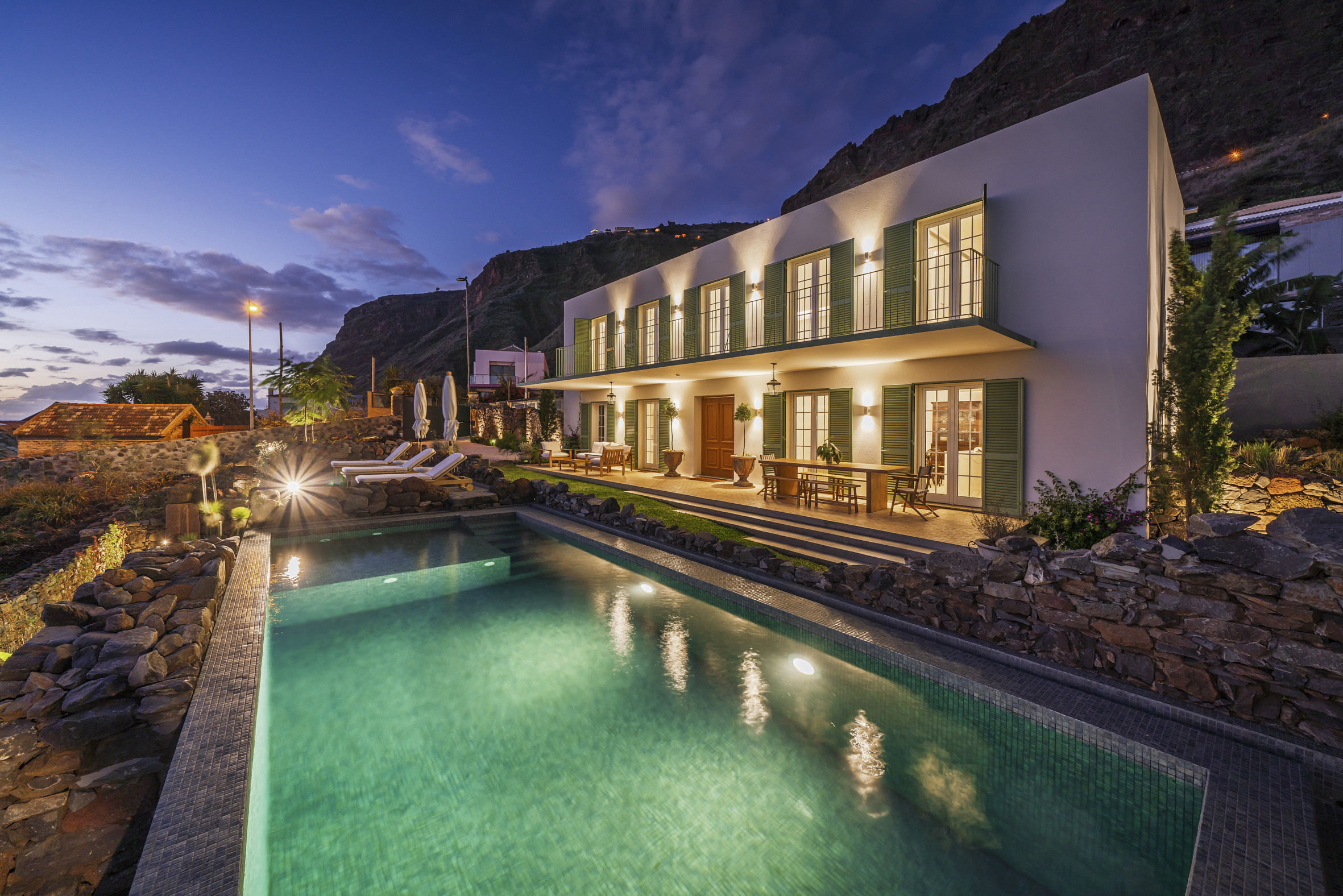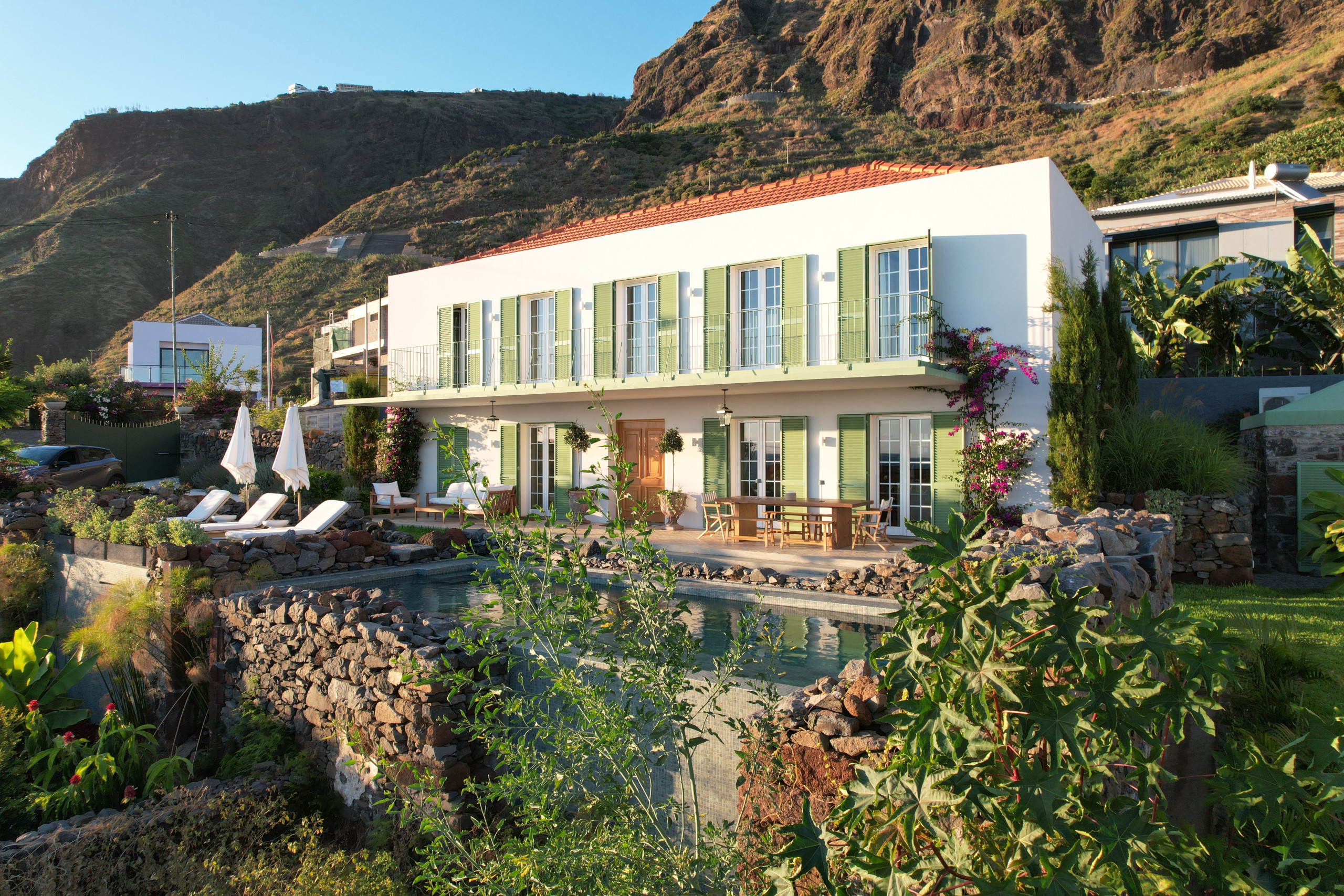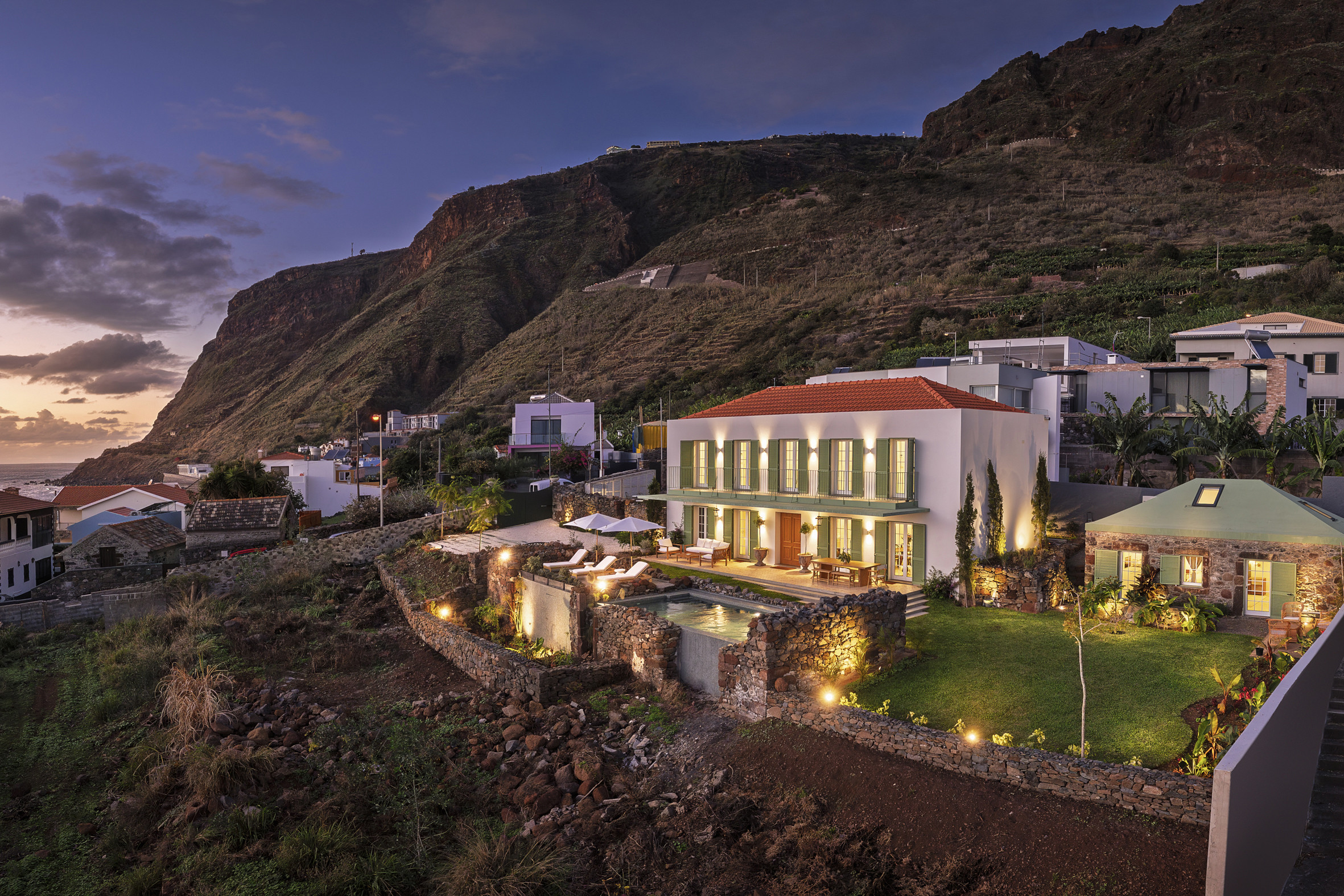 Beyond the interiors, the property reveals an outdoor setting shaped by sun, stone and the gentle rhythm of Madeira’s west coast.